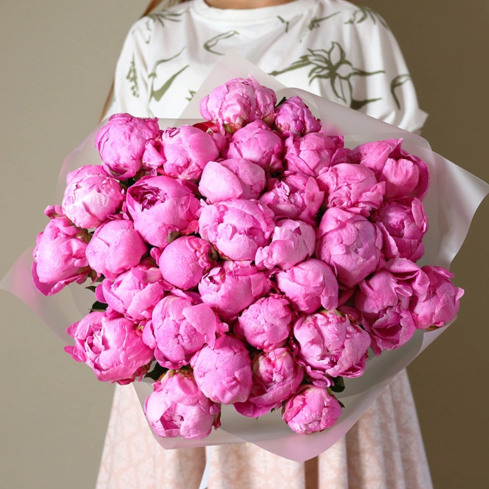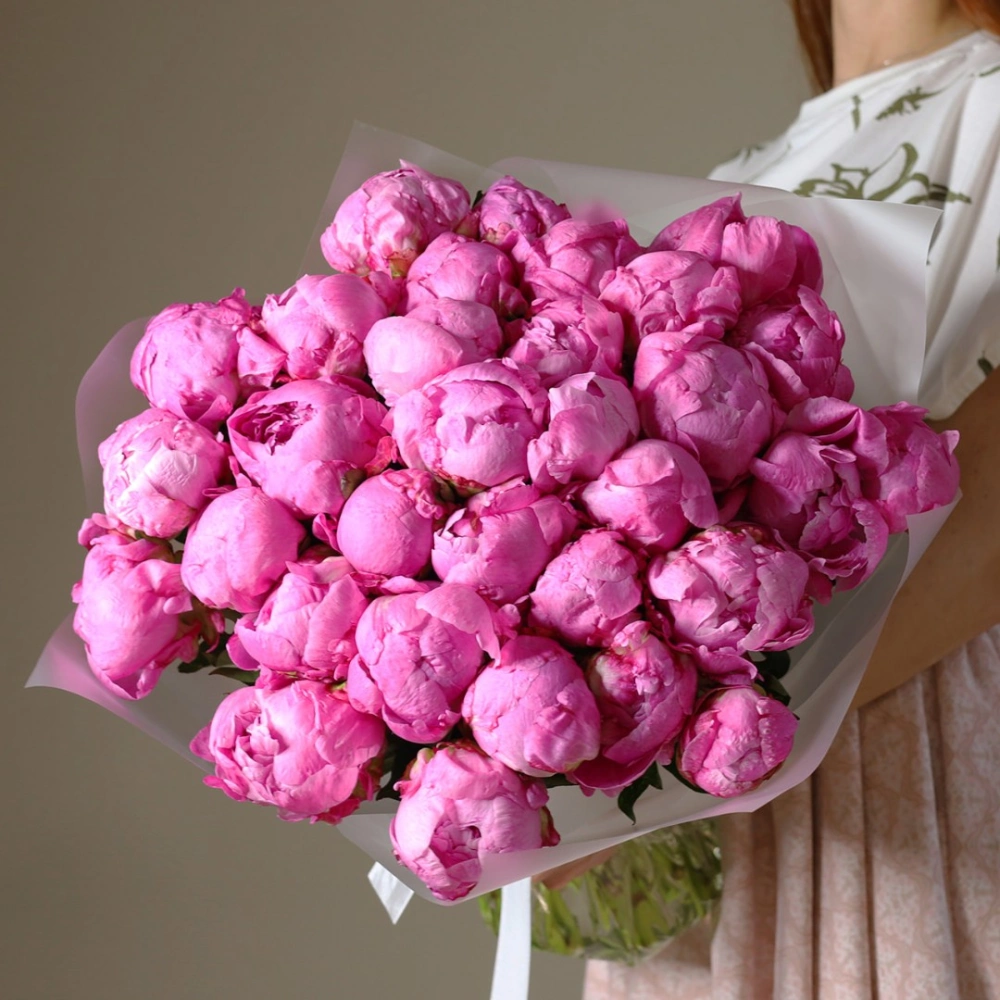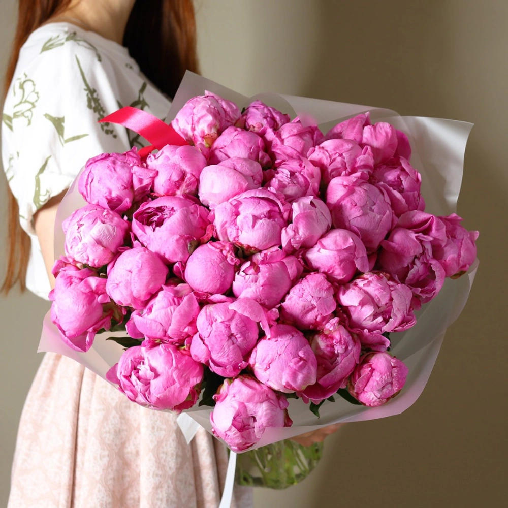 Яркие пионы Флеминг. На фотографии букет из 35 пионов. Вы можете выбрать любое количество цветов указанное в перечне к данному букету.