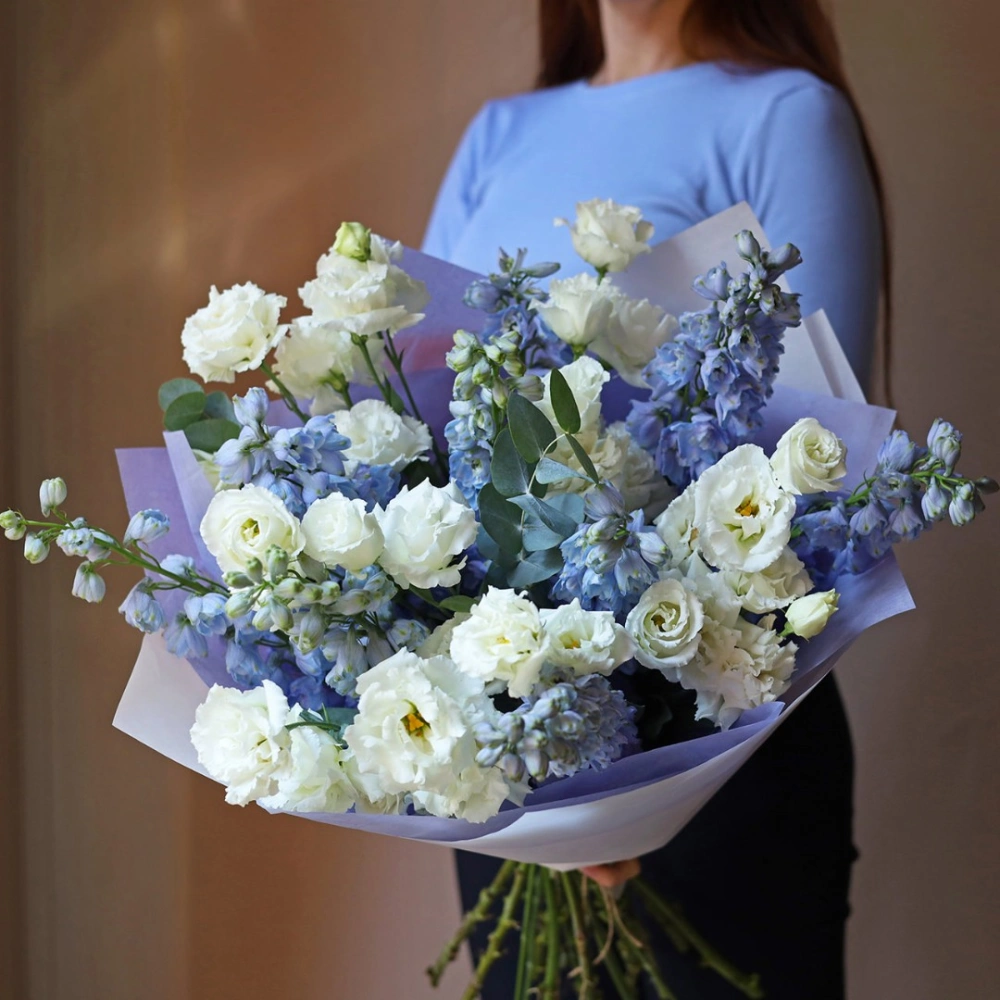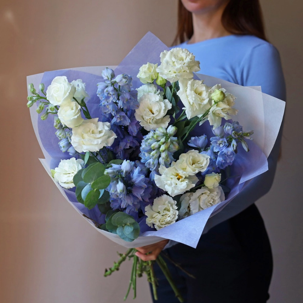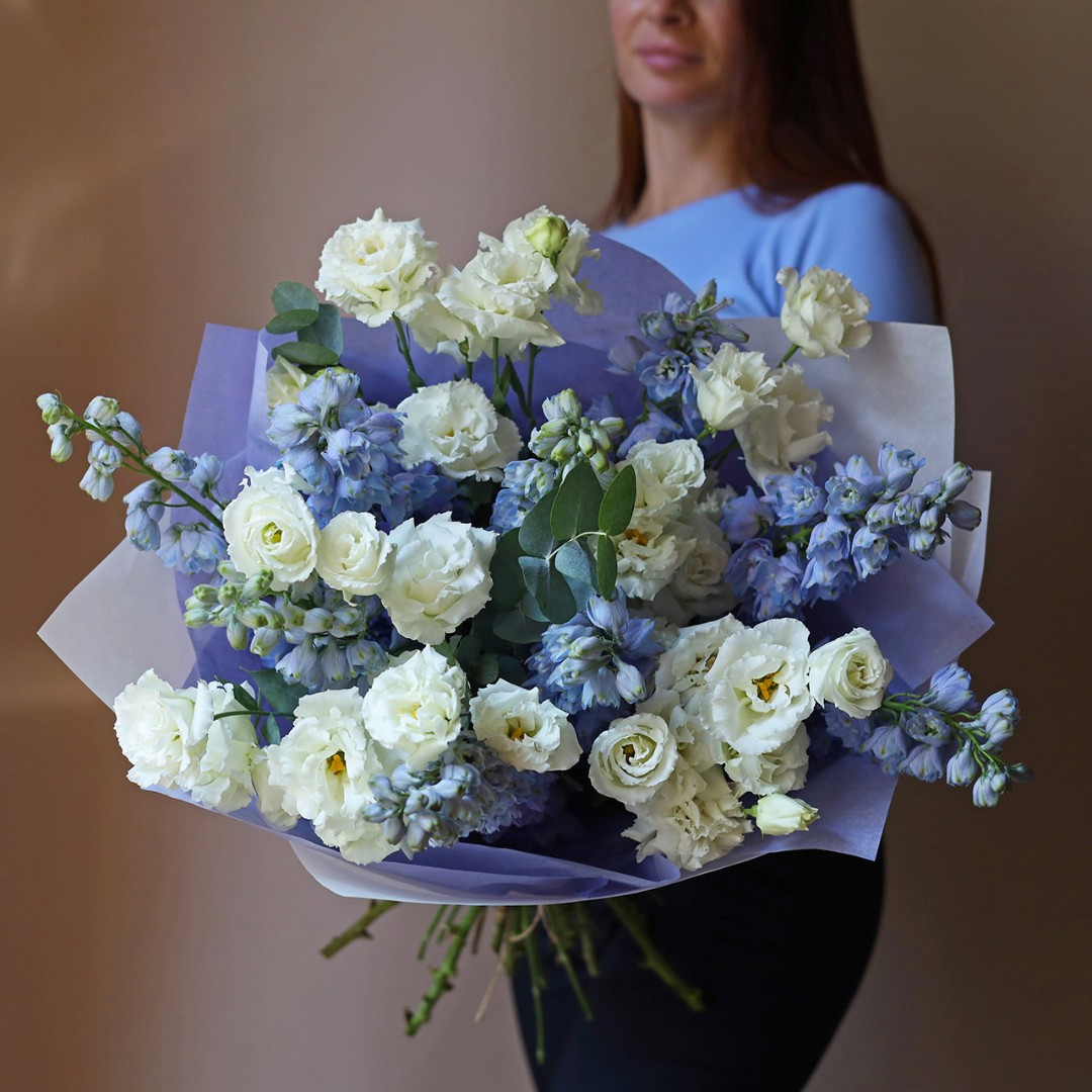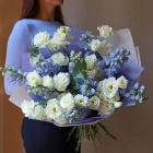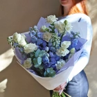Нежный букет из дельфиниума и эустомы. Букет может быть собран в другой цветовой гамме. Количество цветов в букете вы можете выбрать в параметрах. Вы можете выбрать любое количество цветов указанное в перечне к данному букету.