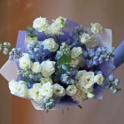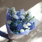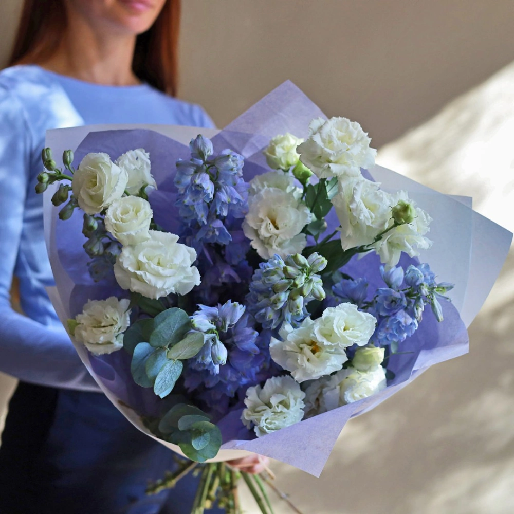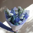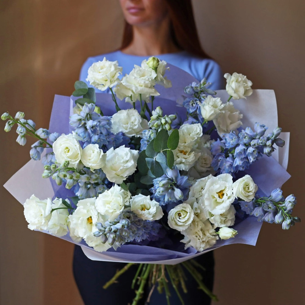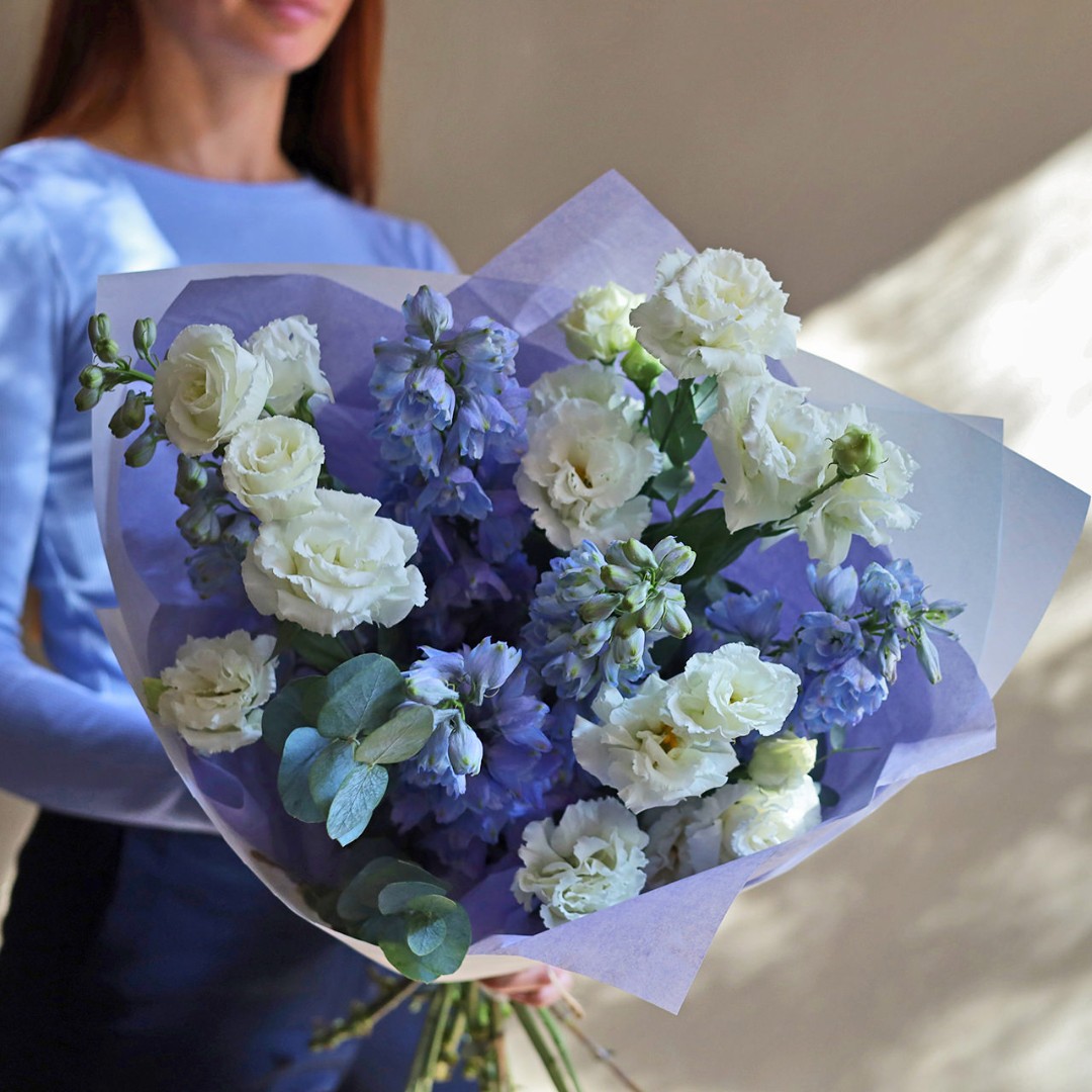 Нежный букет из дельфиниума и эустомы. Букет может быть собран в другой цветовой гамме. Количество цветов в букете вы можете выбрать в параметрах. Вы можете выбрать любое количество цветов указанное в перечне к данному букету.
