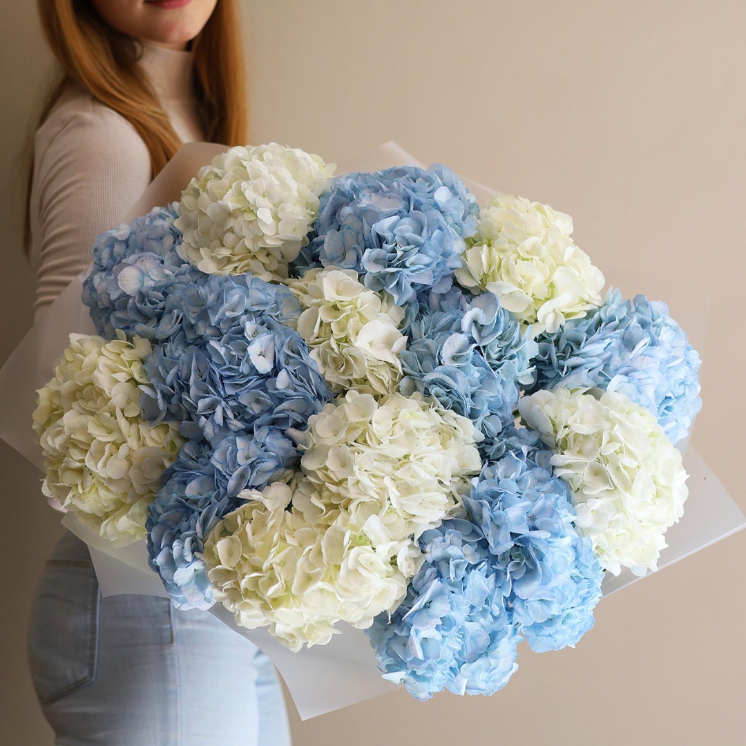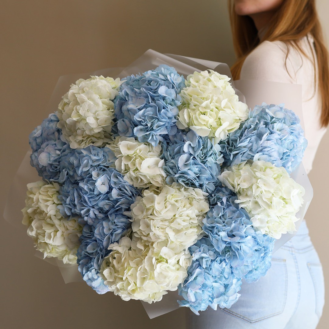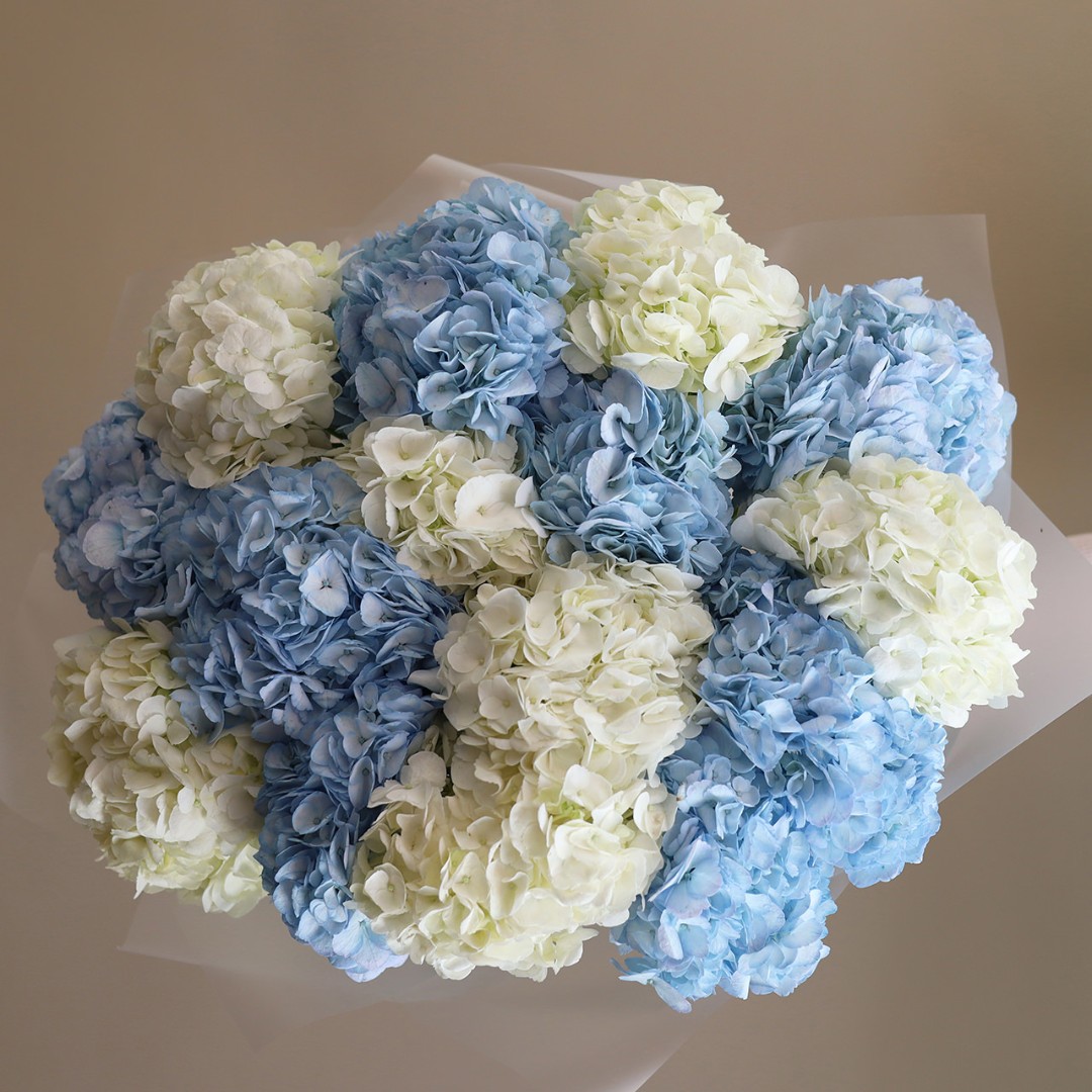 Букет из 15 шапочек голубой и белой гортензии. Вы можете выбрать любое количество цветов указанное в перечне к данному букету.