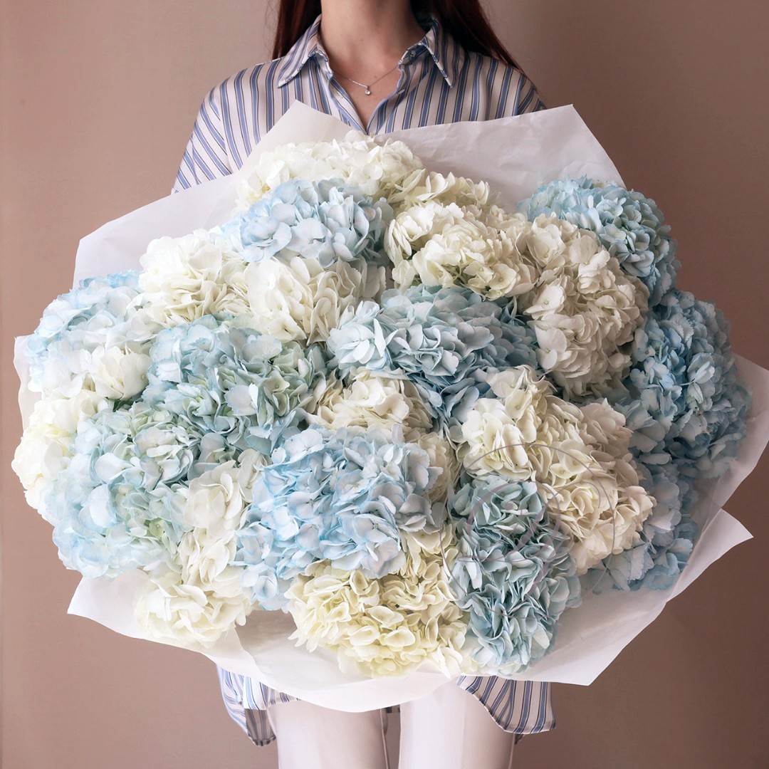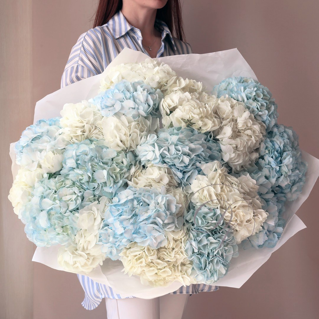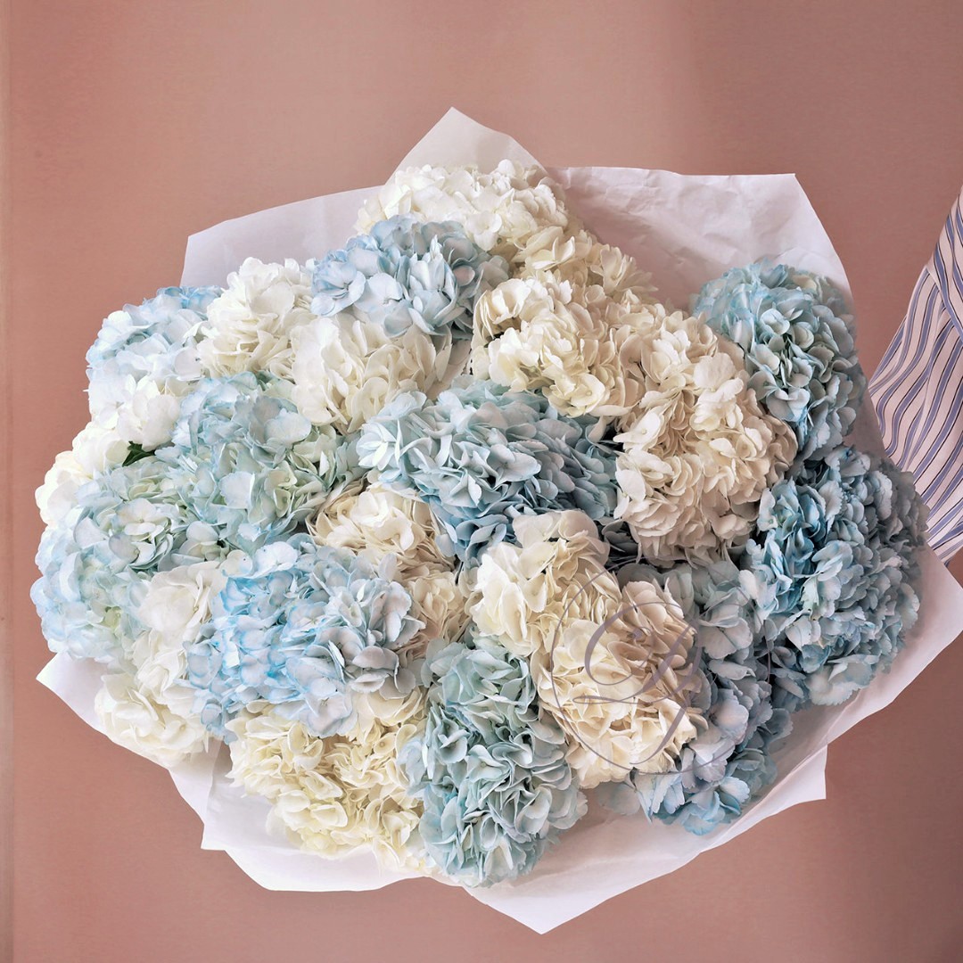Букет из 15 шапочек голубой и белой гортензии. Вы можете выбрать любое количество цветов указанное в перечне к данному букету.