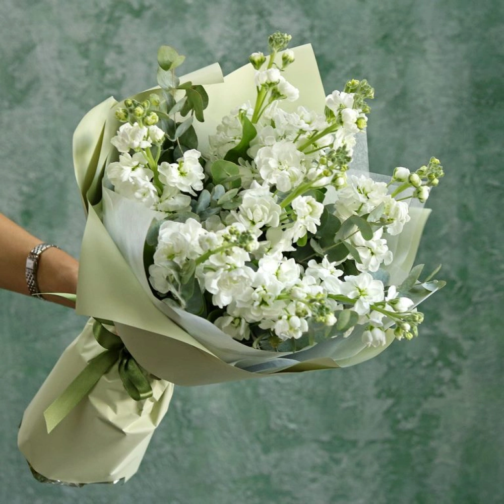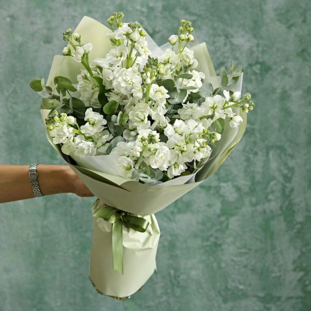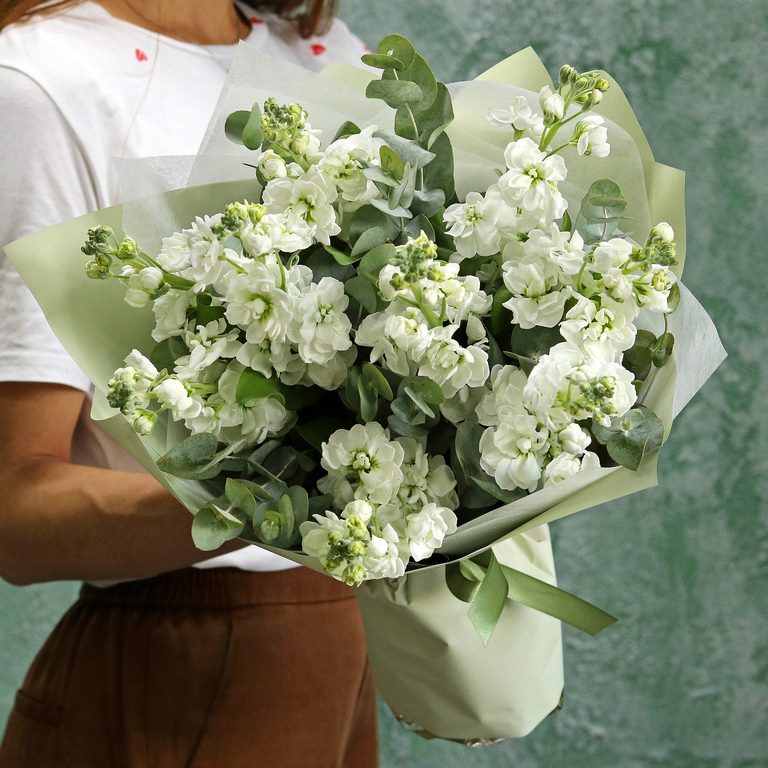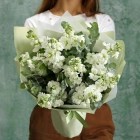 Белая маттиола с эвкалиптом в букете