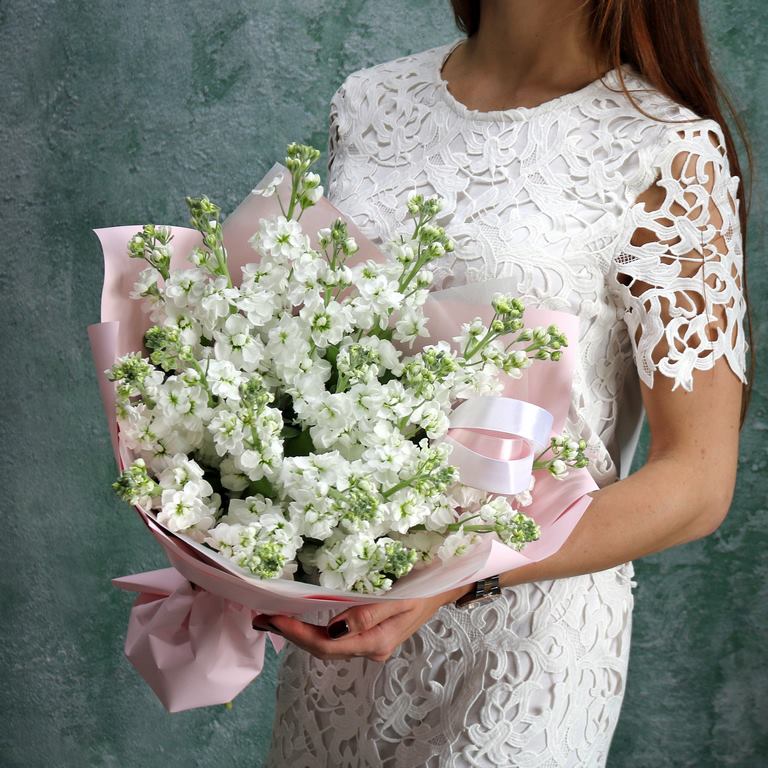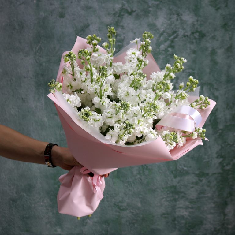 Маттиола букет купить с доставкой в Москве. Душистые цветы маттиолы бывают разного цвета, на одном стебле собрано множество соцветий, цветок невероятно ароматный. Вы можете выбрать любое количество цветов указанное в перечне к данному букету.