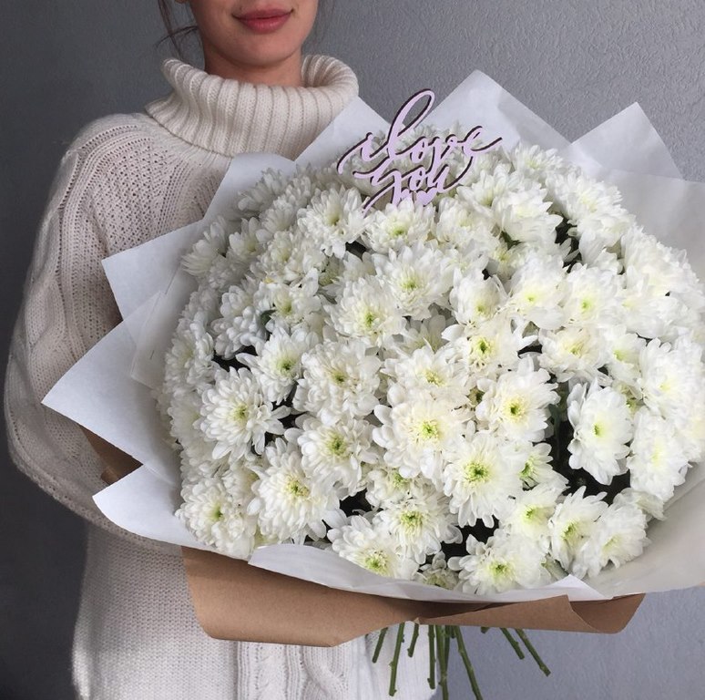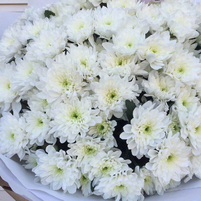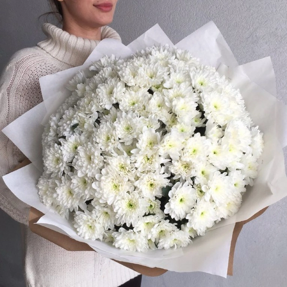 Букет из белой кустовой Хризантемы. На фотографии 45 хризантем в букете. Вы можете выбрать любое количество цветов указанное в перечне к данному букету.