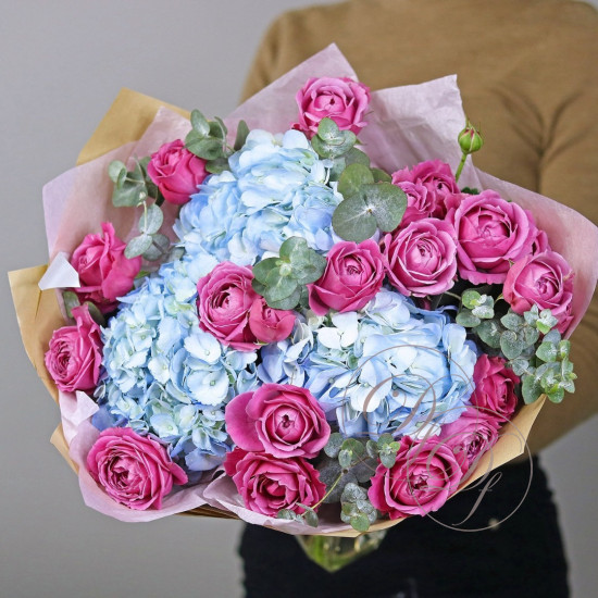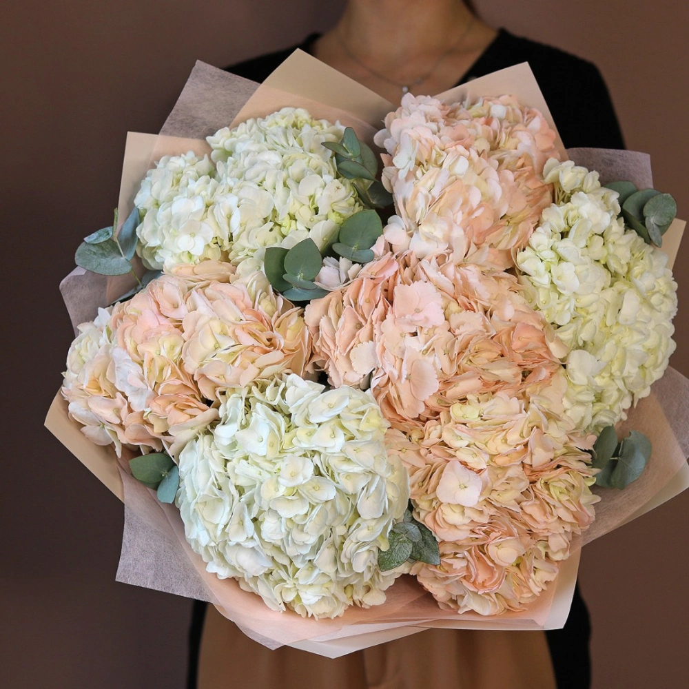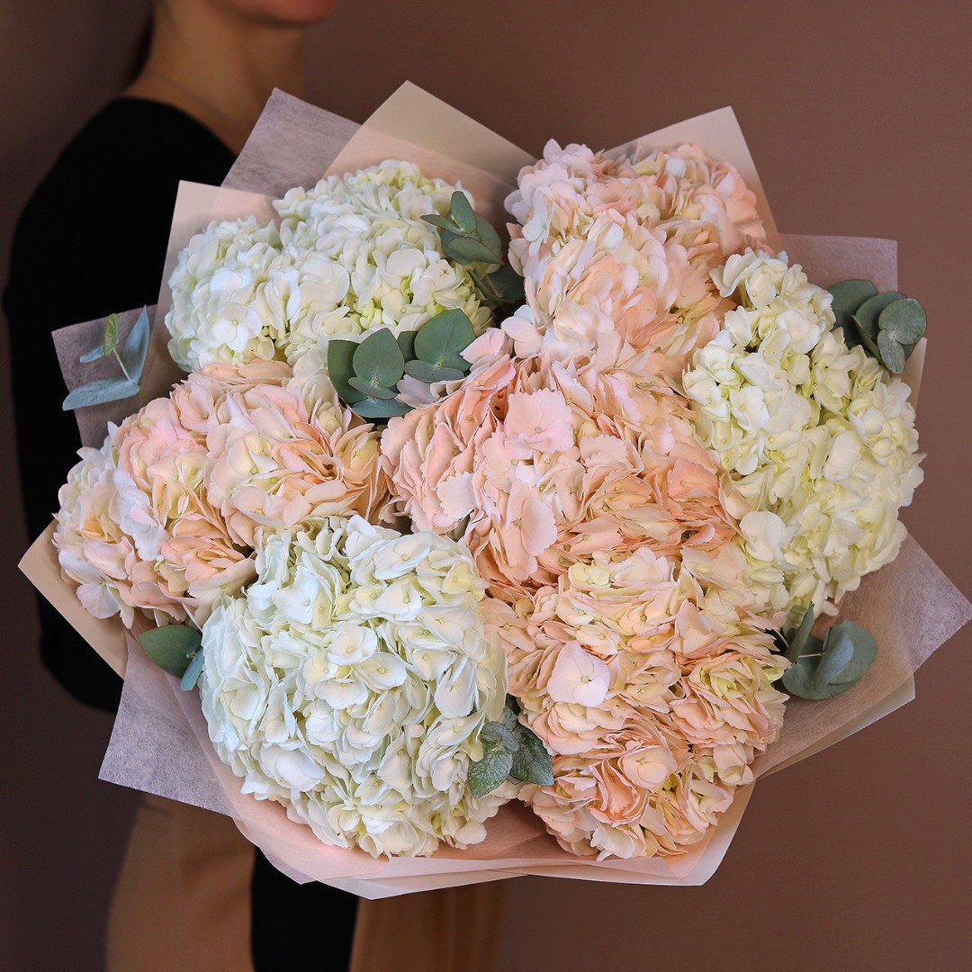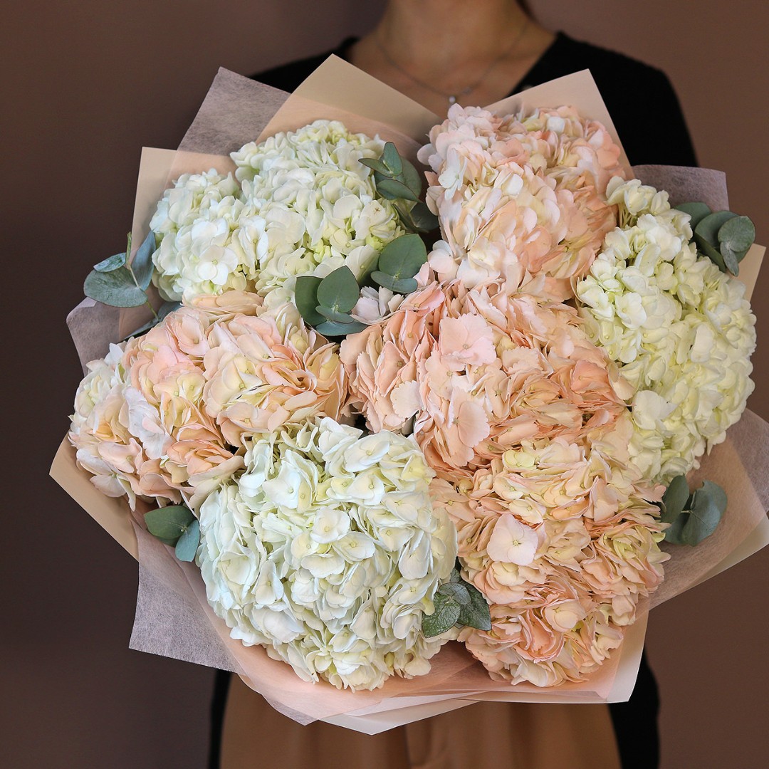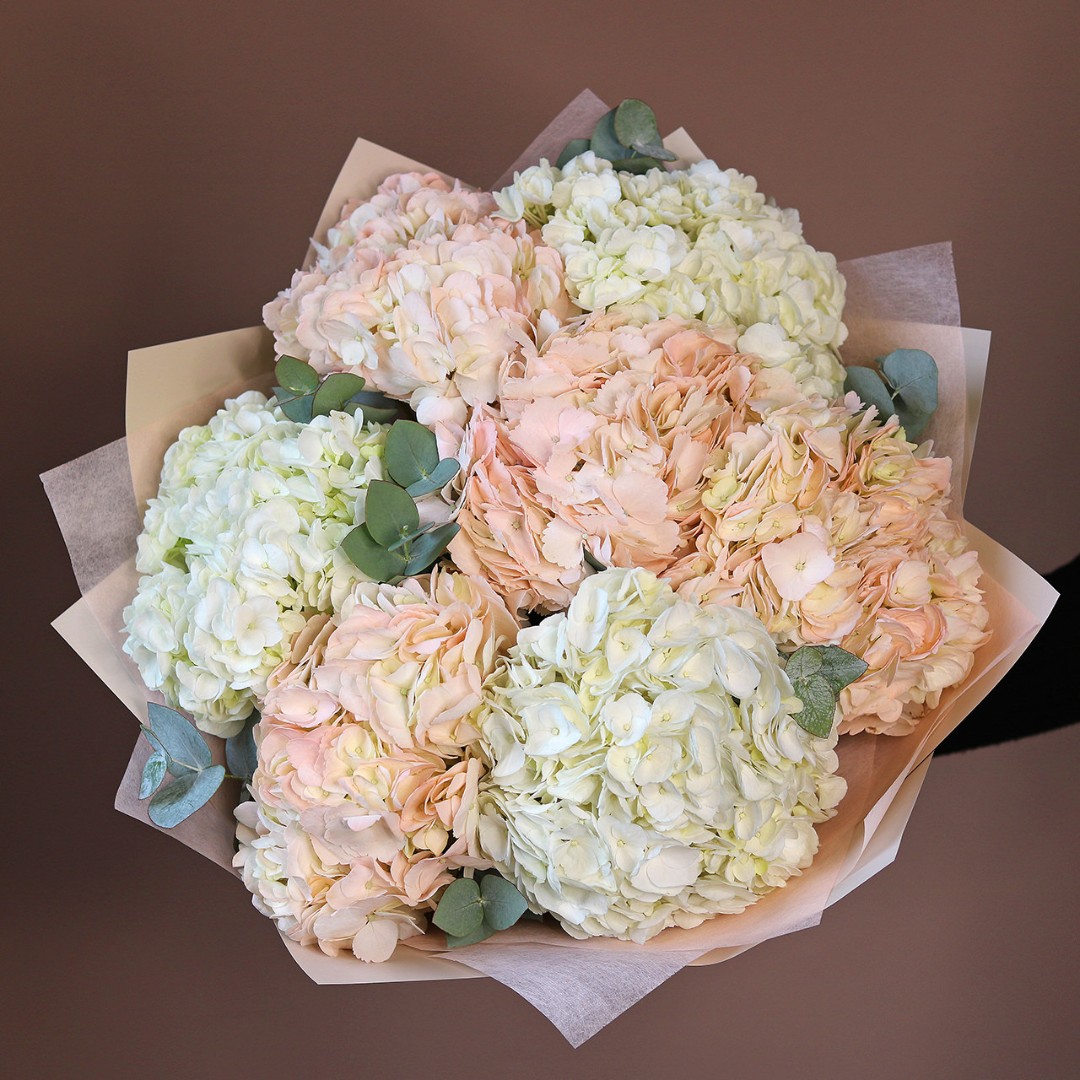 Букет из белой и розовой гортензии с эвкалиптом. Вы можете выбрать любое количество цветов указанное в перечне к данному букету.