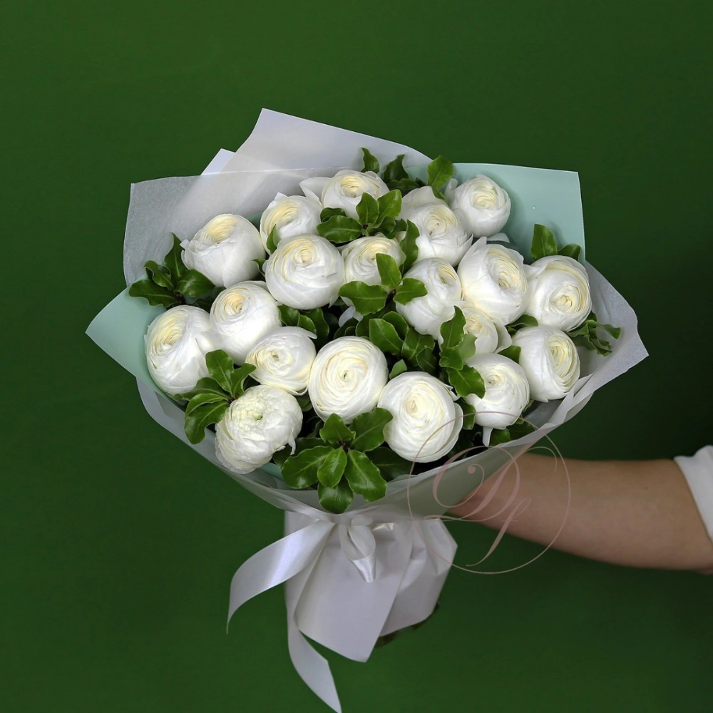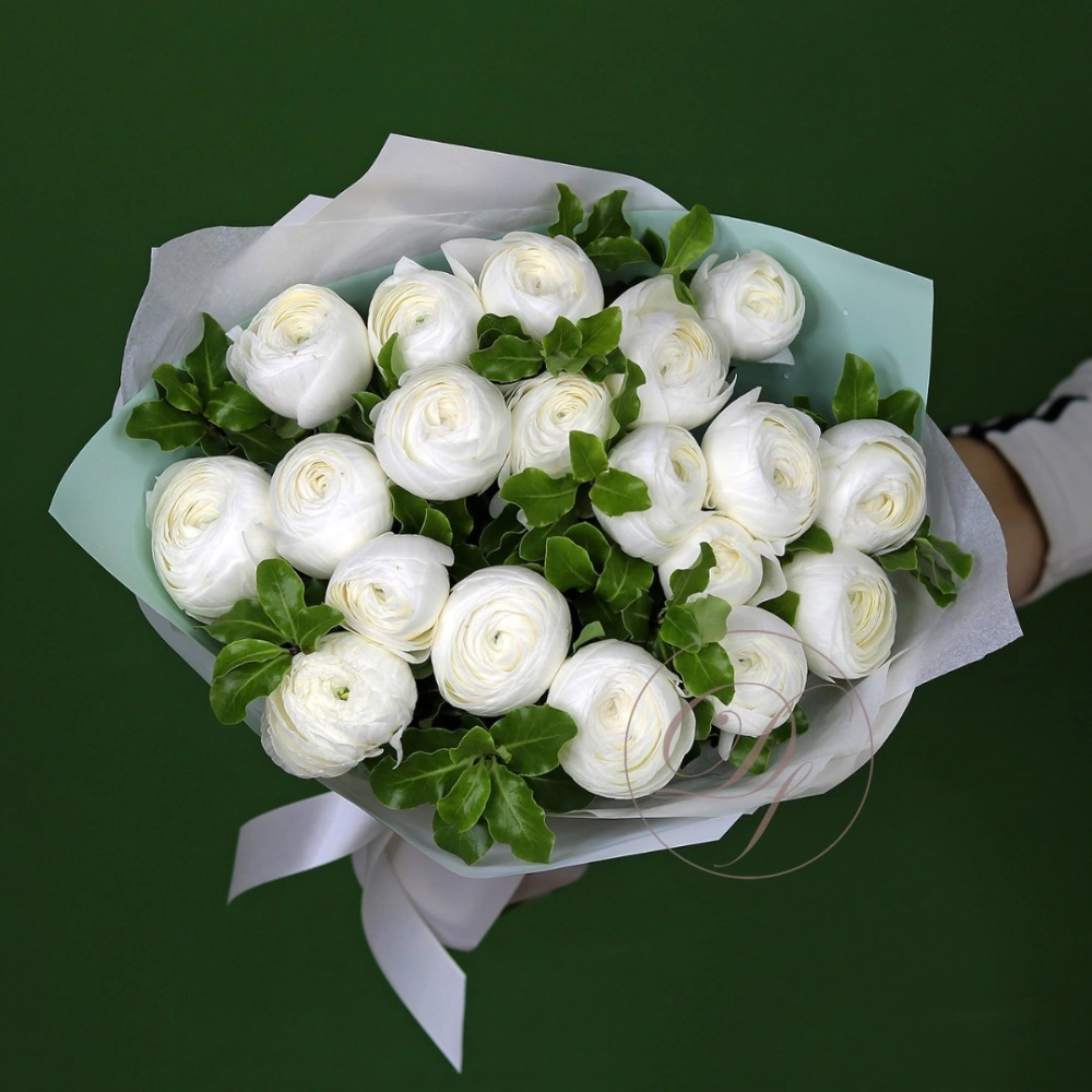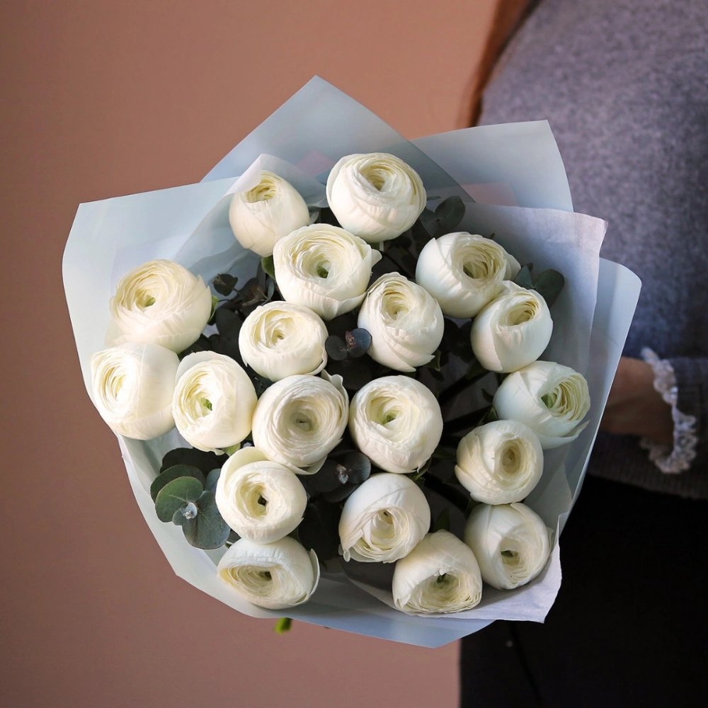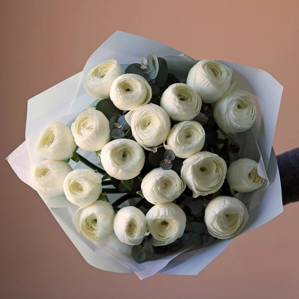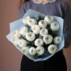 Букет ранункулюсов ханой. На фотографии 19 ранункулюсов в букете. Белые ранункулюсы ханой в букете. Вы можете выбрать любое количество цветов указанное в перечне к данному букету.