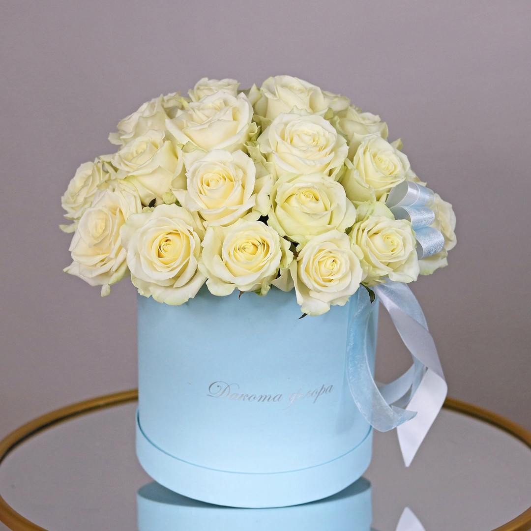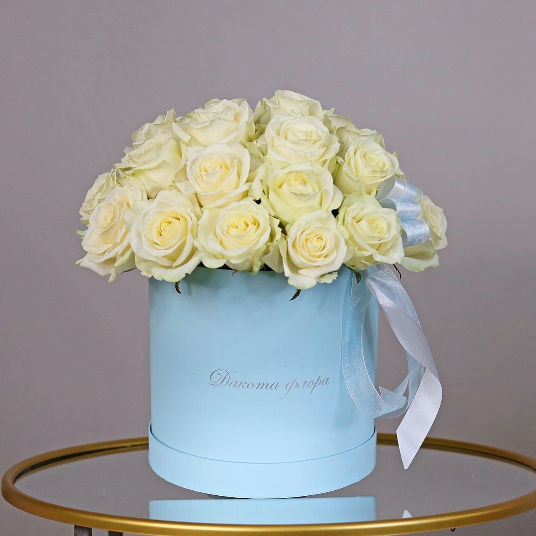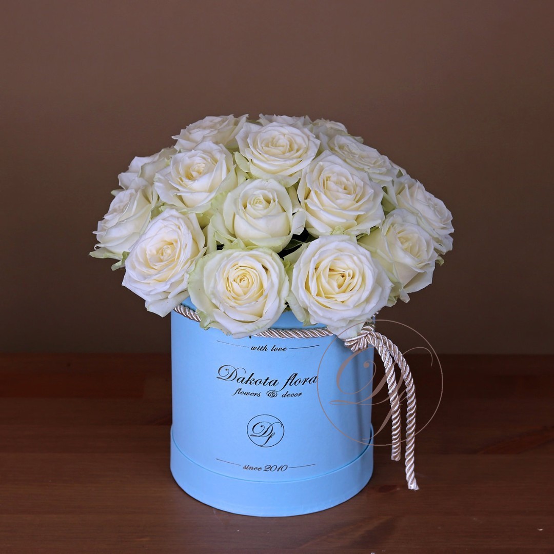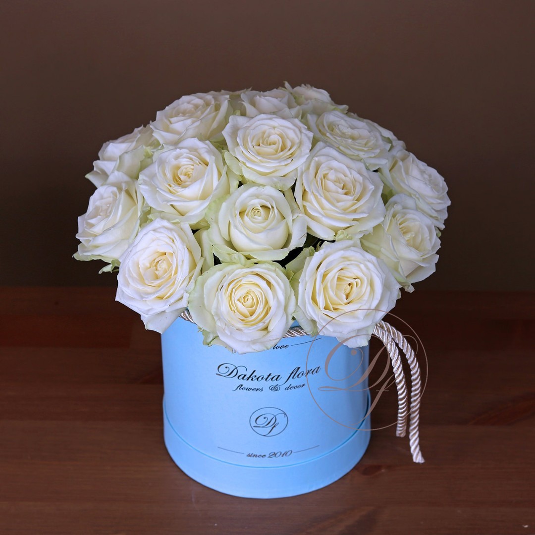 Белые розы в голубой коробке. Цветы в коробках это композиции, составленные с использованием специальной губки Oasis (пиафлор) которая пропитана водой. Для того чтобы цветы дольше оставались свежими, добавляйте в нее немного воды каждый день.
