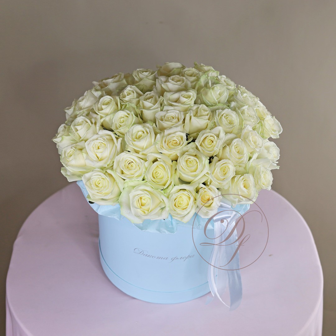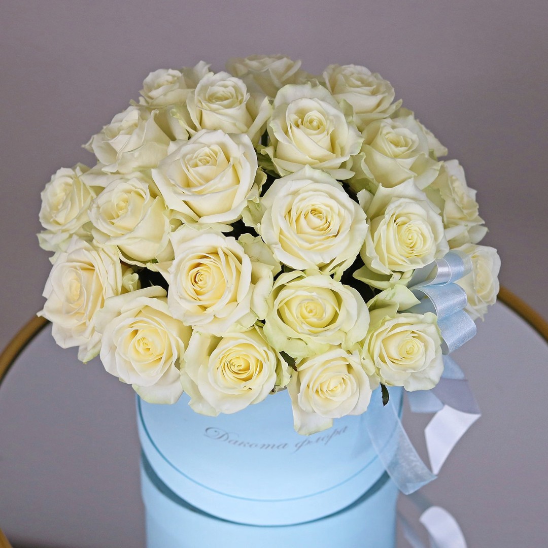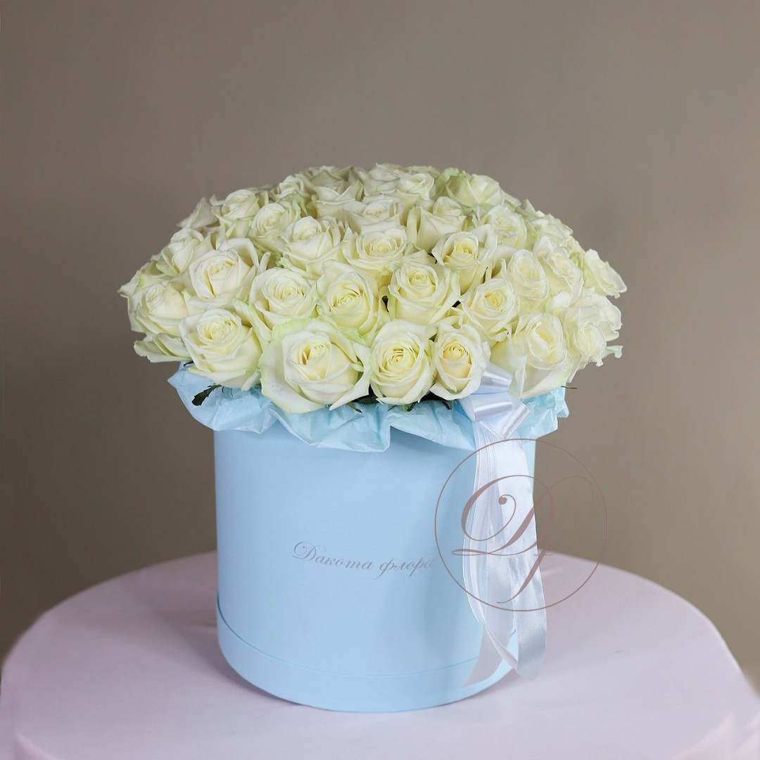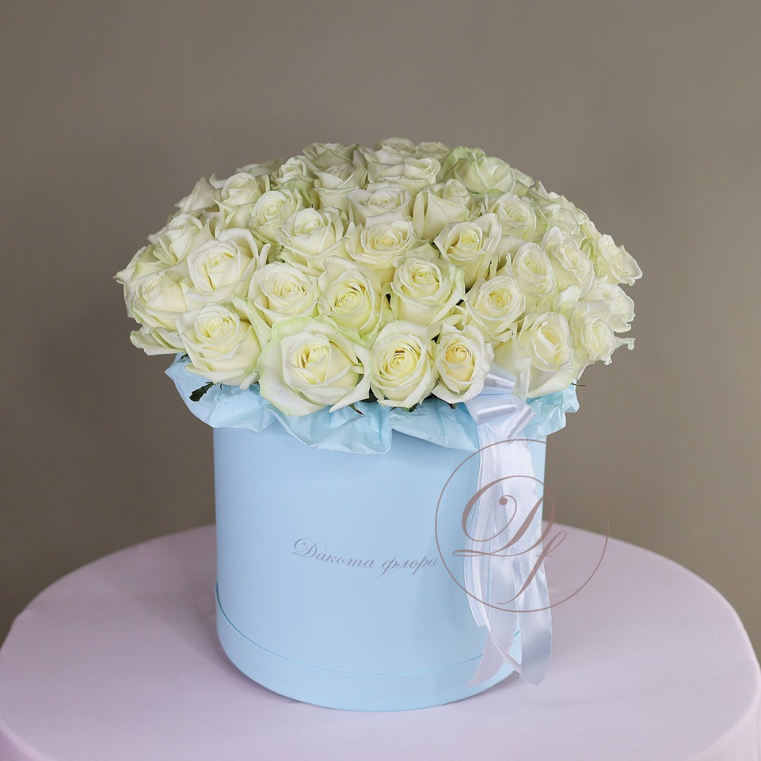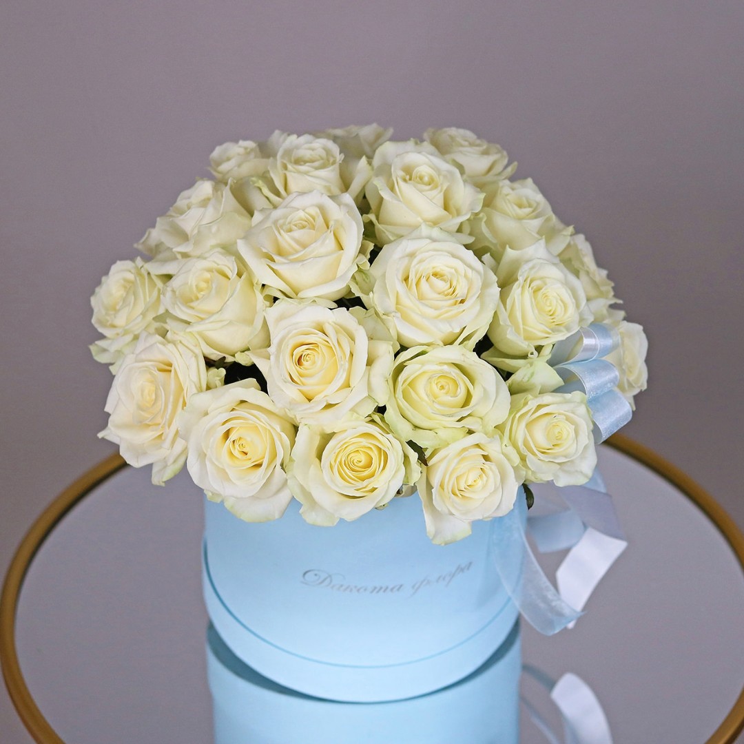 Белые розы в голубой коробке. Цветы в коробках это композиции, составленные с использованием специальной губки Oasis (пиафлор) которая пропитана водой. Для того чтобы цветы дольше оставались свежими, добавляйте в нее немного воды каждый день.