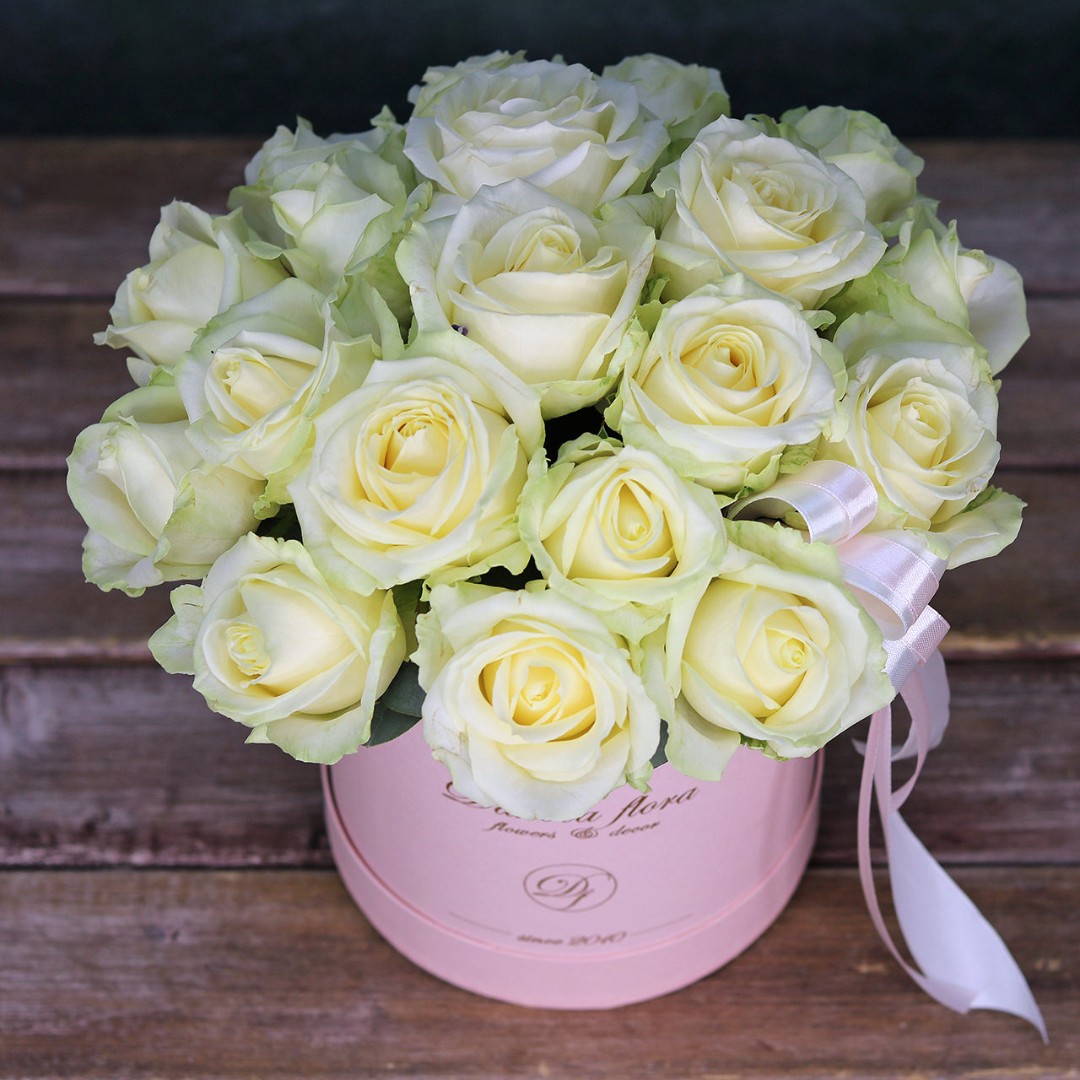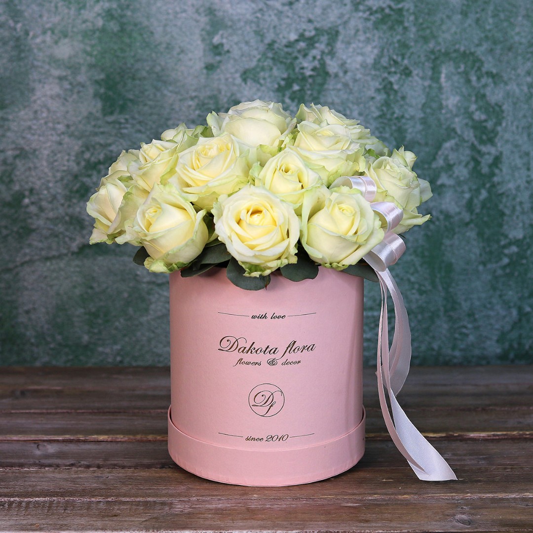 Белые розы в коробке. На фотографии 19 роз в коробке. Цветы в коробках это композиции, составленные с использованием специальной губки Oasis (пиафлор) которая пропитана водой. Для того чтобы цветы дольше оставались свежими, добавляйте в нее немного воды каждый день.