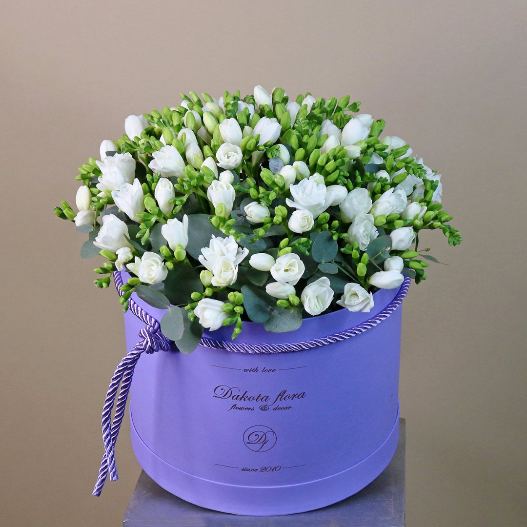 Цветы в коробках это композиции, составленные с использованием специальной губки Oasis (пиафлор) которая пропитана водой. Для того чтобы цветы дольше оставались свежими, добавляйте в нее немного воды каждый день.