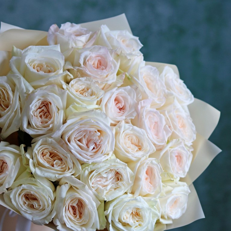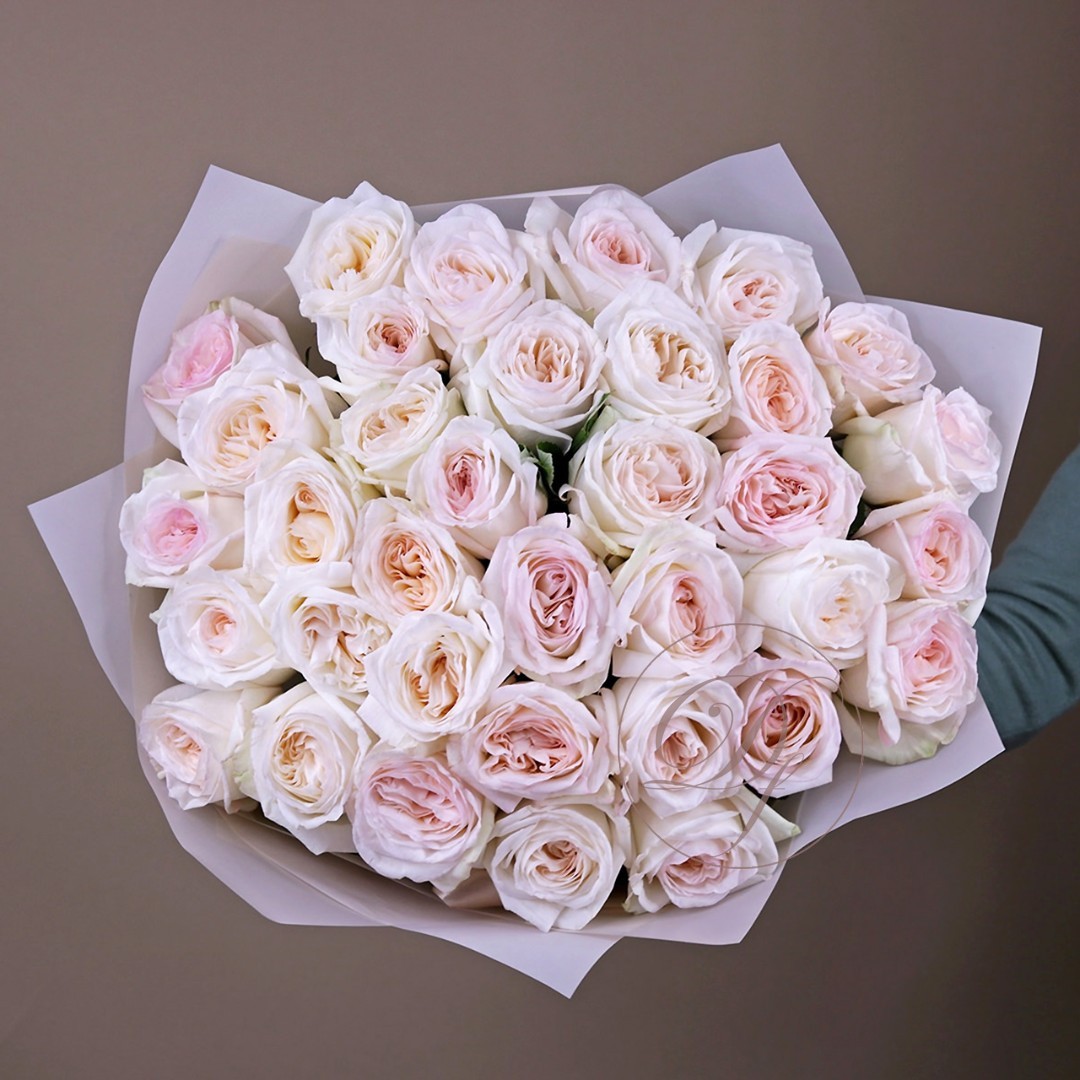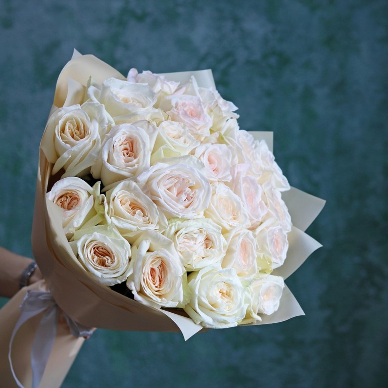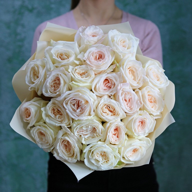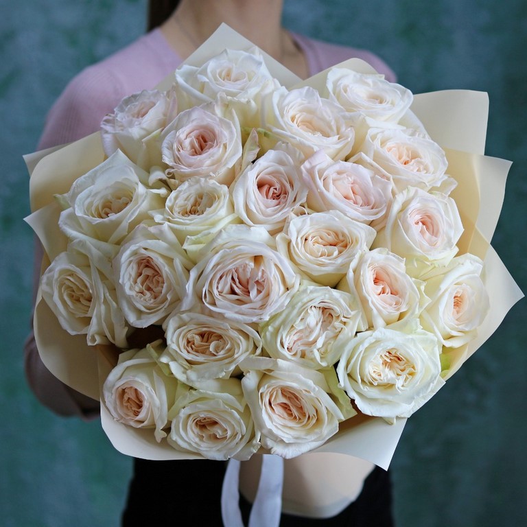 Букет из ароматных белых пионовидных роз сорта Вайт Охара. На фотографии букет из 23 пионовидных белых роз. Вы можете выбрать любое количество цветов указанное в перечне к данному букету.