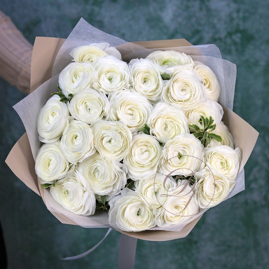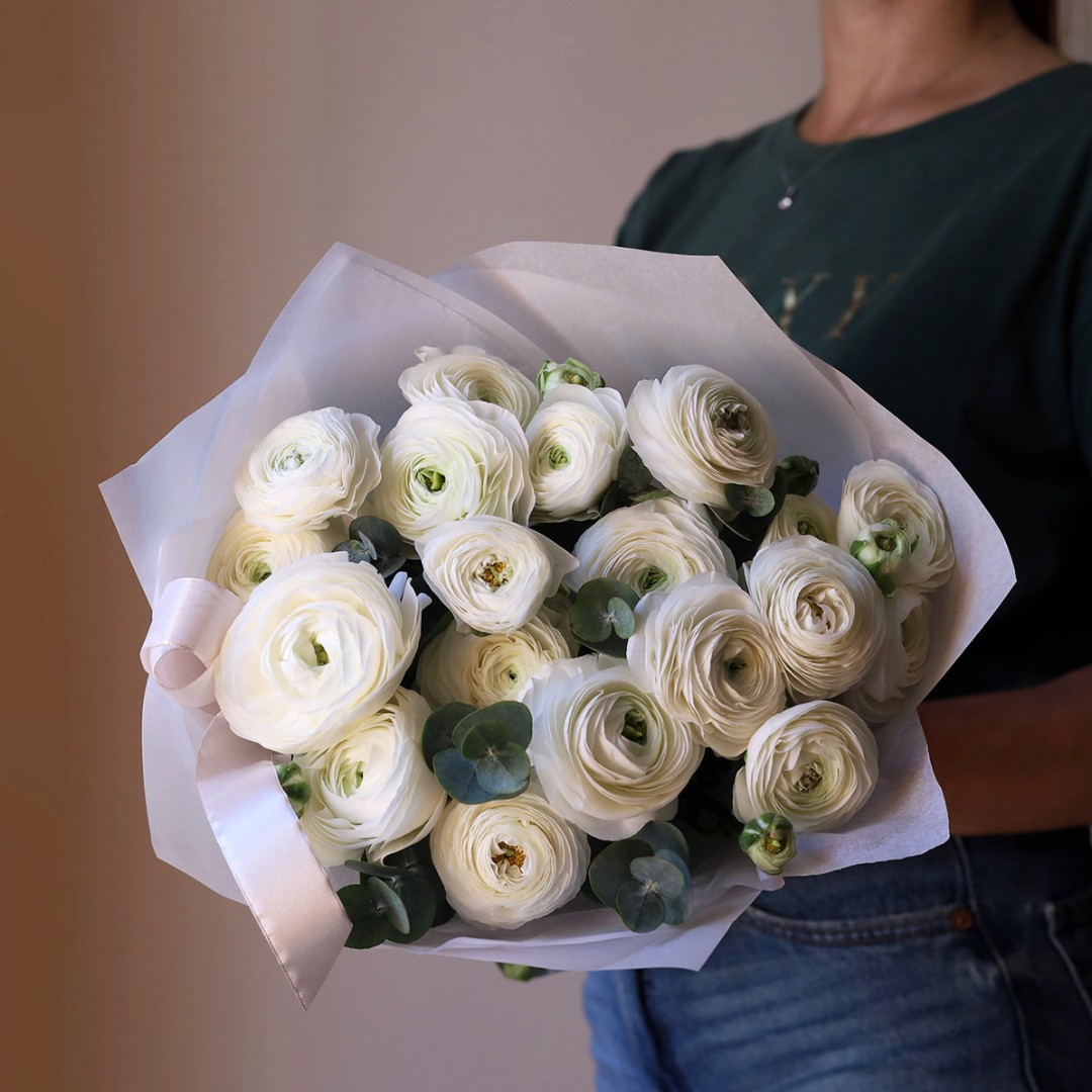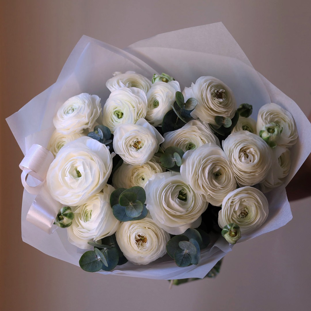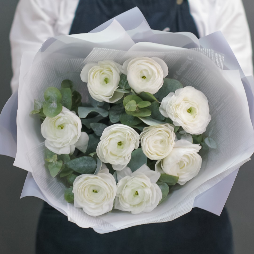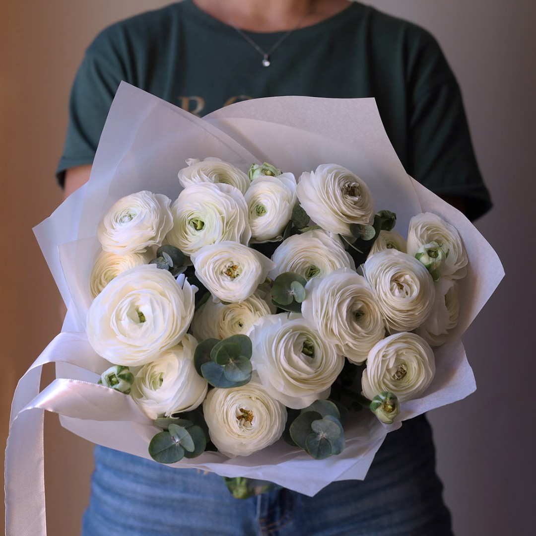 Букет из белых Ранункулюсов с эвкалиптом. Вы можете выбрать любое количество цветов указанное в перечне к данному букету.