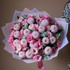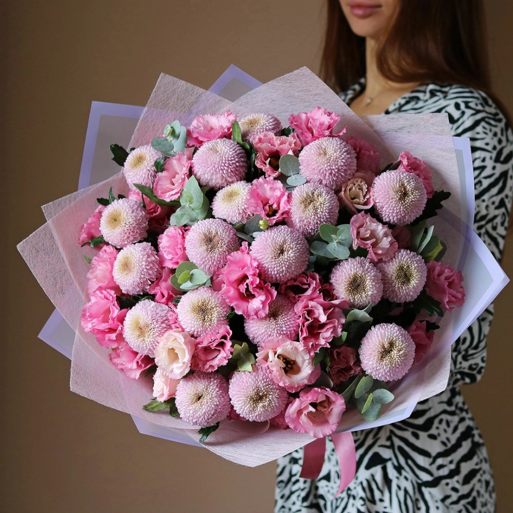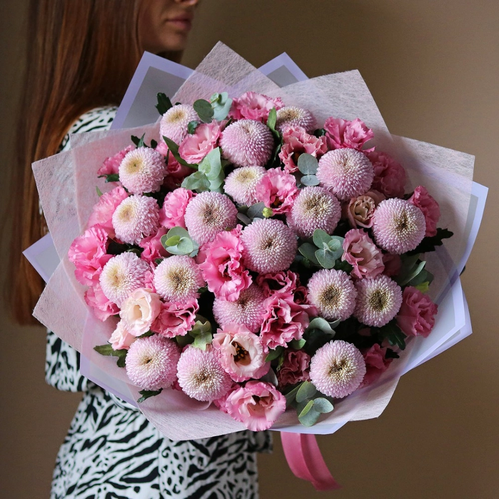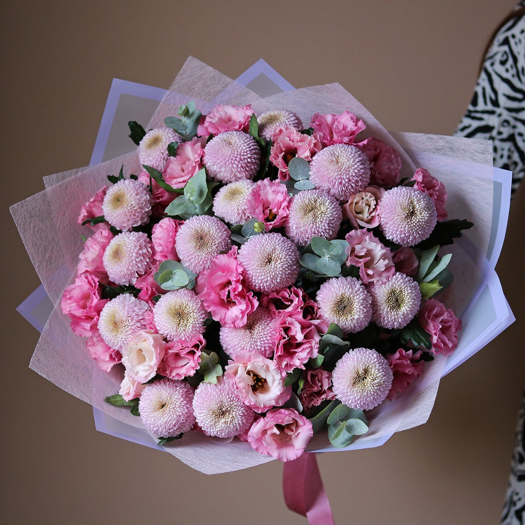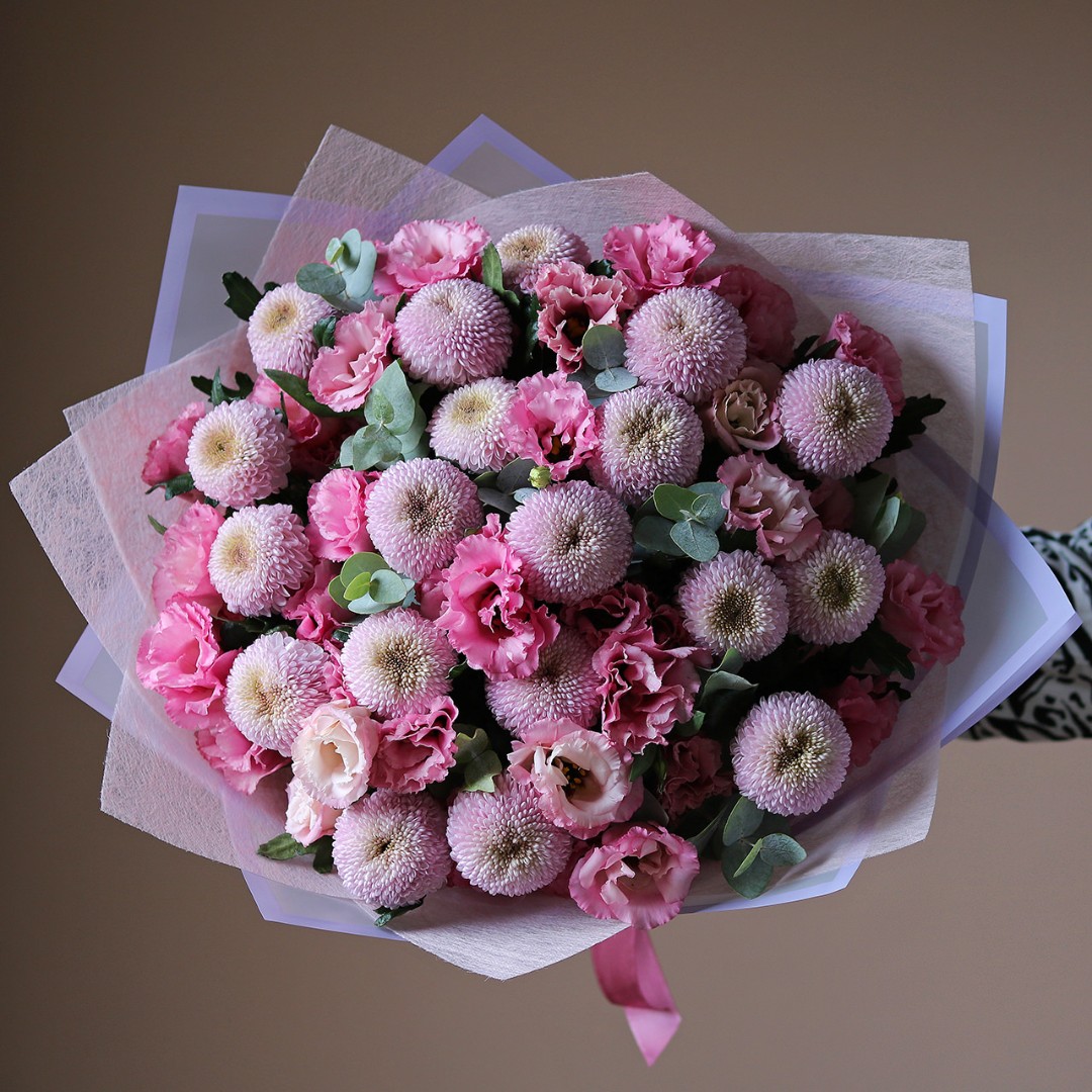Букет из розовой Эустомы (Лизиантус) и хризантемы мамокко. Вы можете выбрать любой размер указаный в перечне к данному букету.