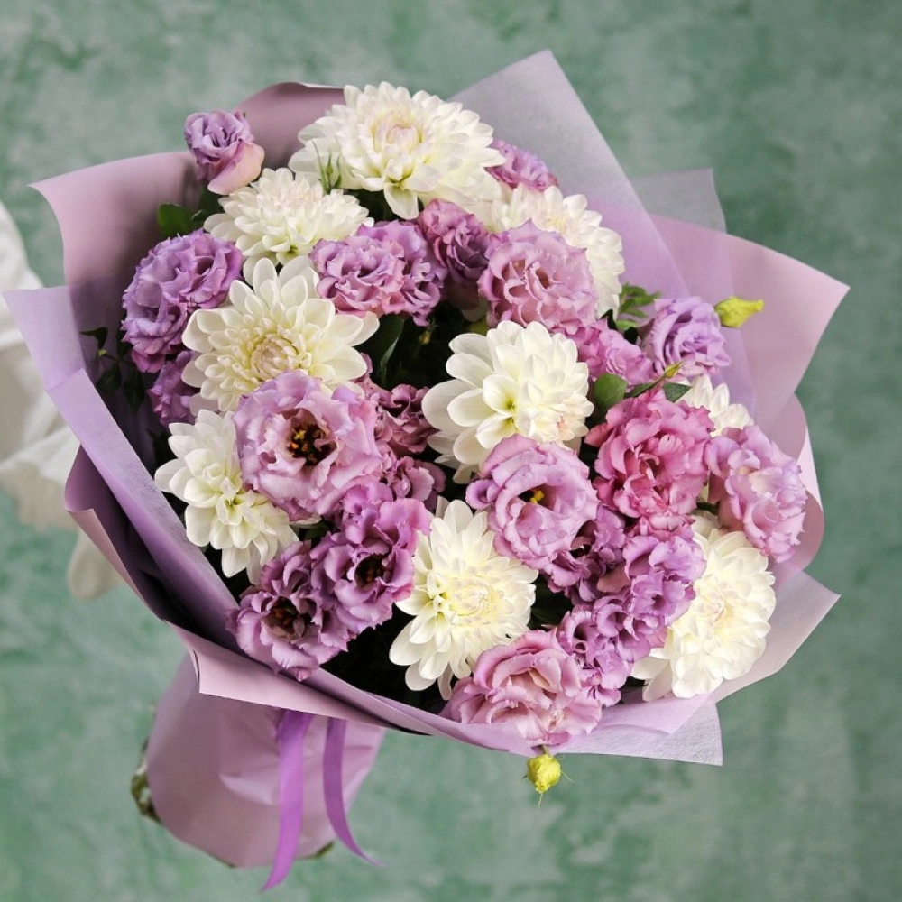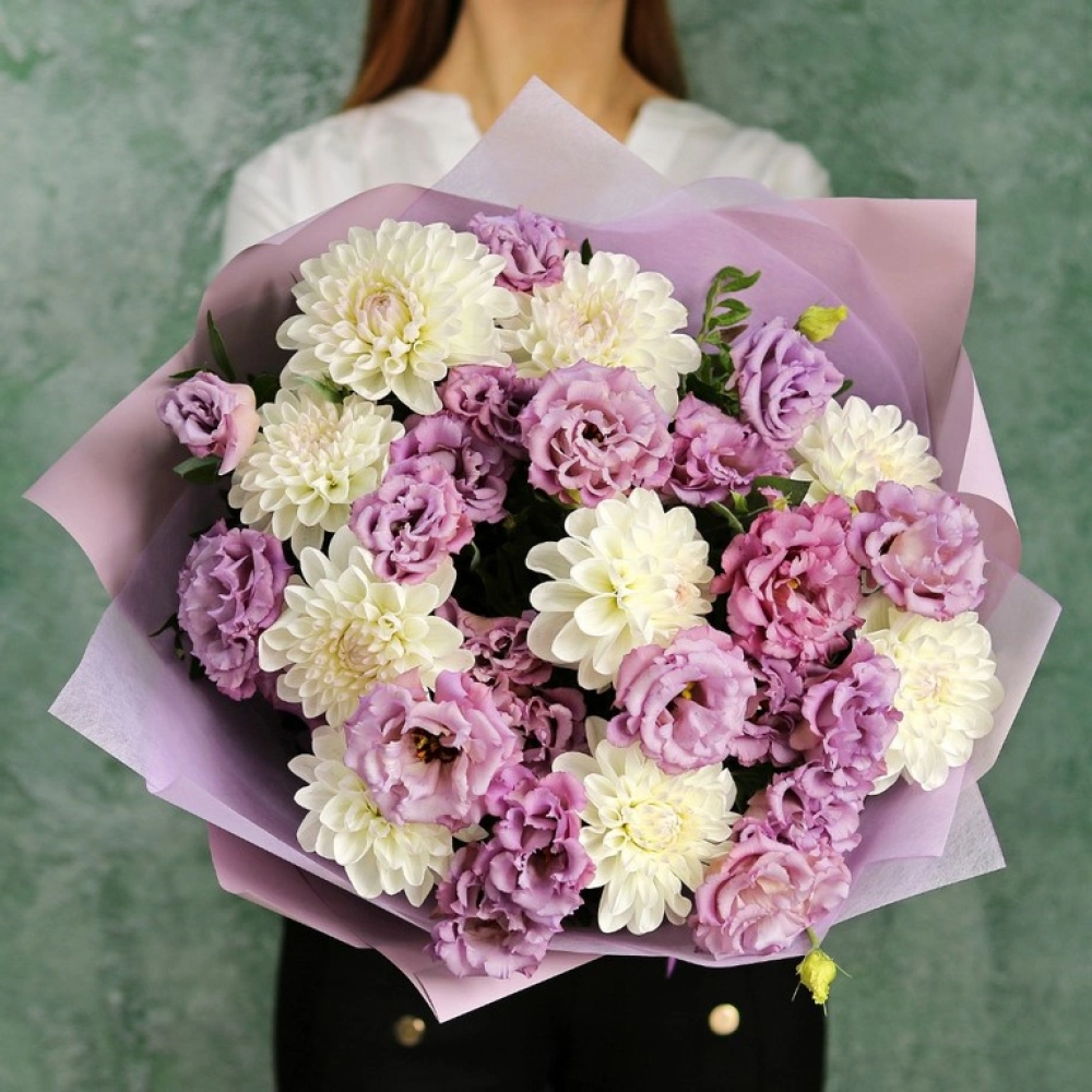 Букет из Георгин и эустомы. Вы можете выбрать любое количество цветов указанное в перечне к данному букету.