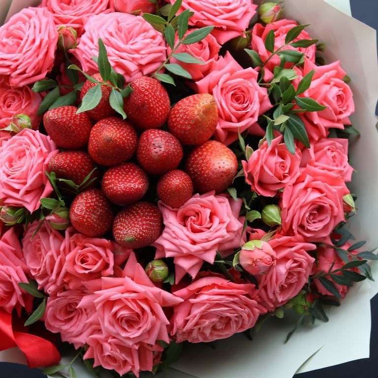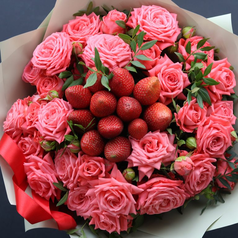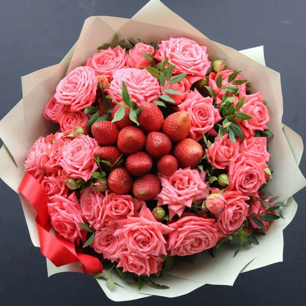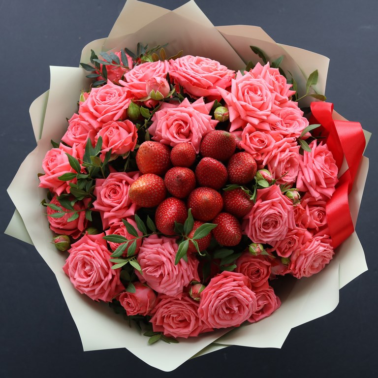 Букет из кустовых роз и клубники