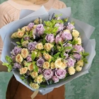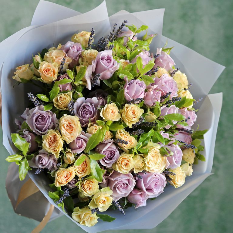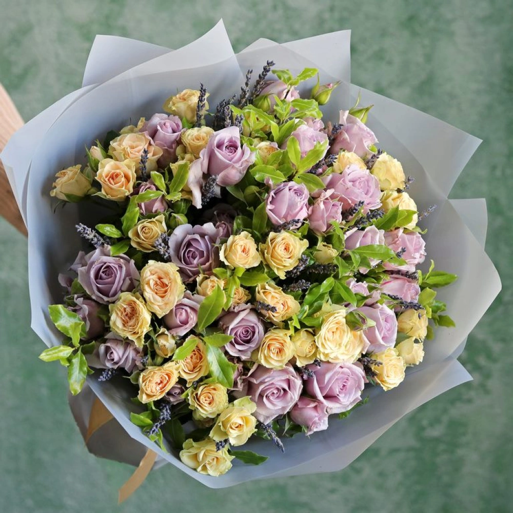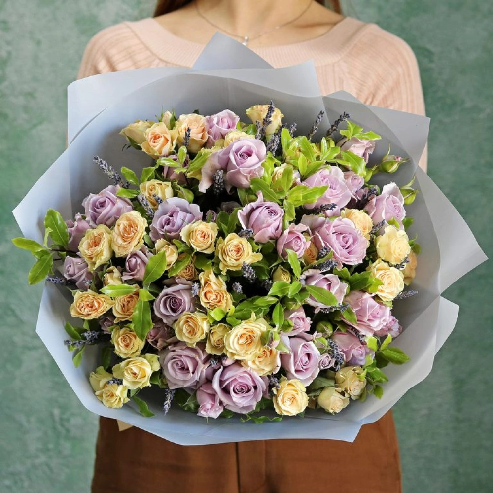 Букет из 19 роз: бежевой и фиолетовой кустовой с добавлением лаванды и зелени. Вы можете выбрать любое количество цветов указанное в перечне к данному букету.