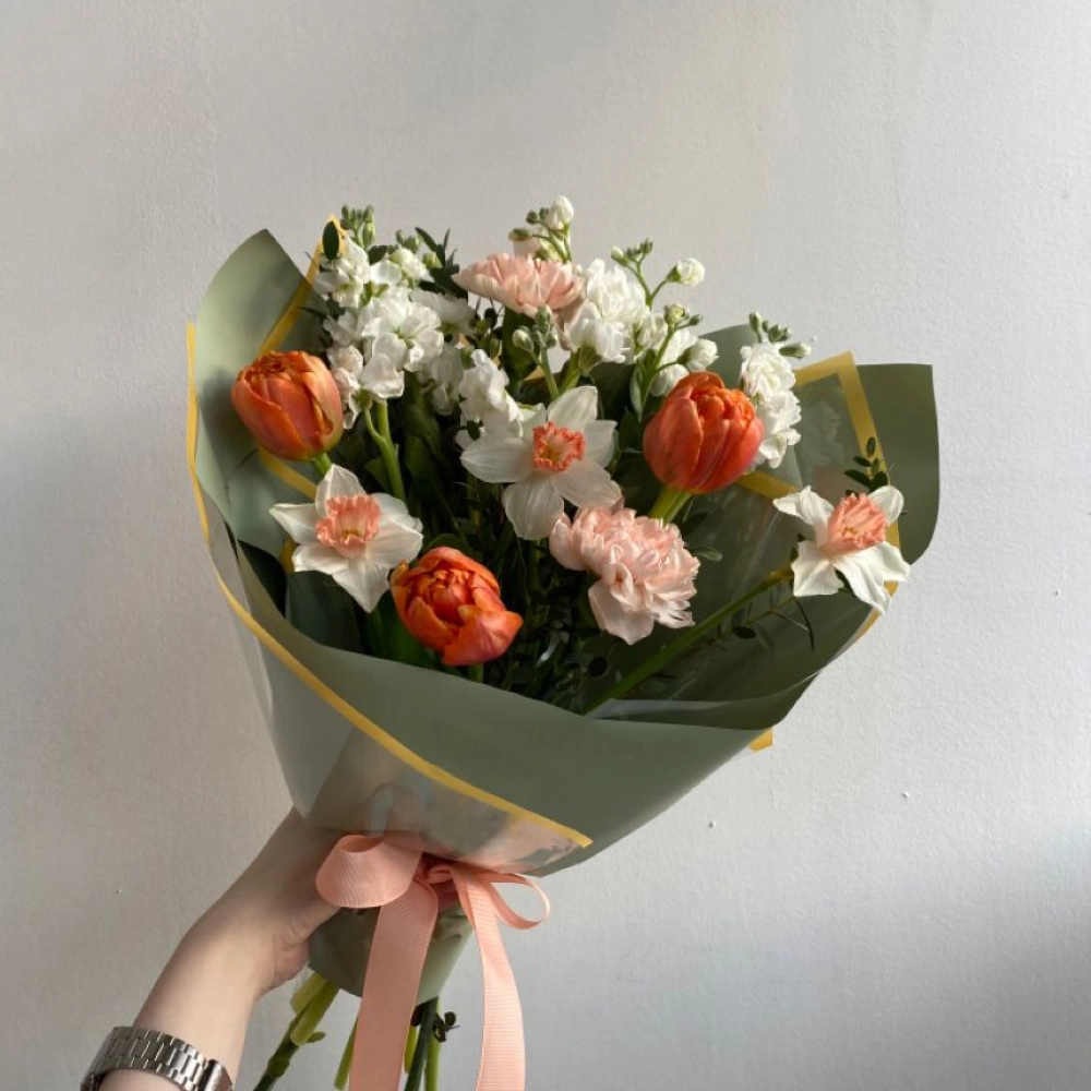 Букет из нарциссов, тюльпанов и маттиолы