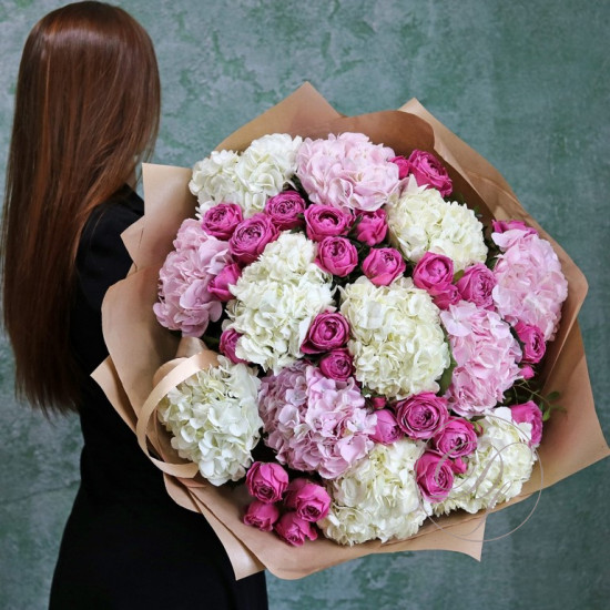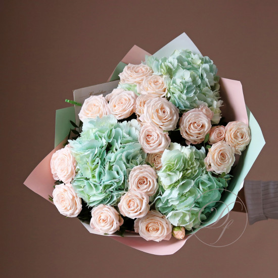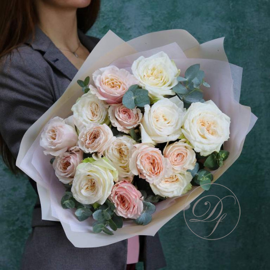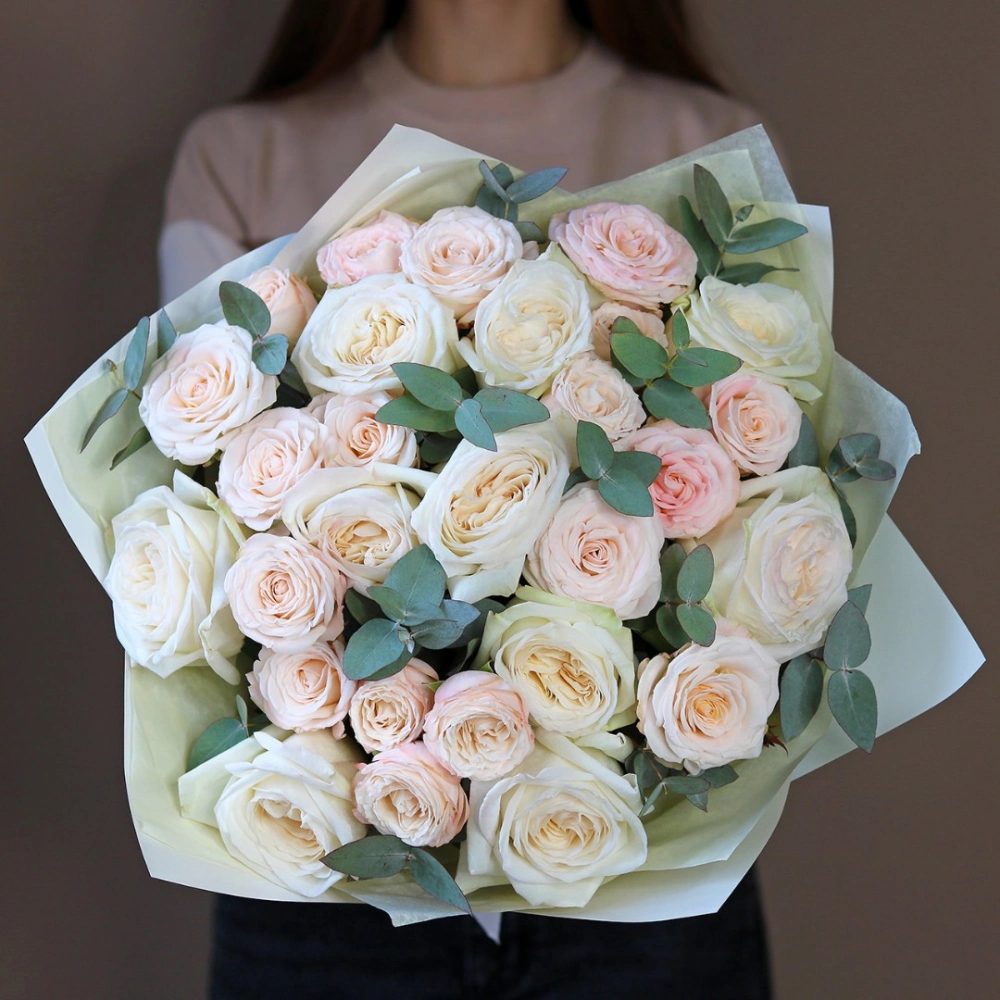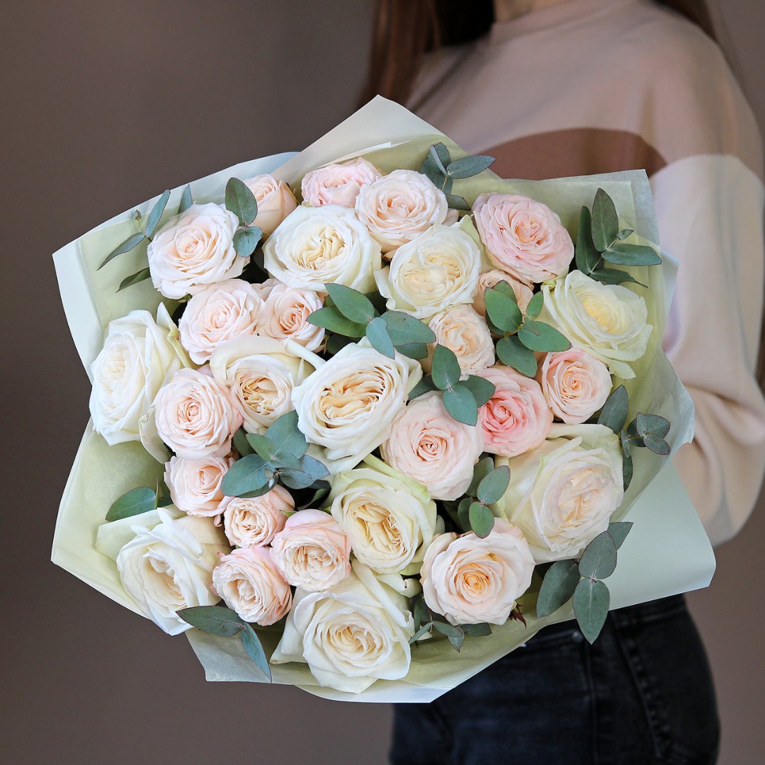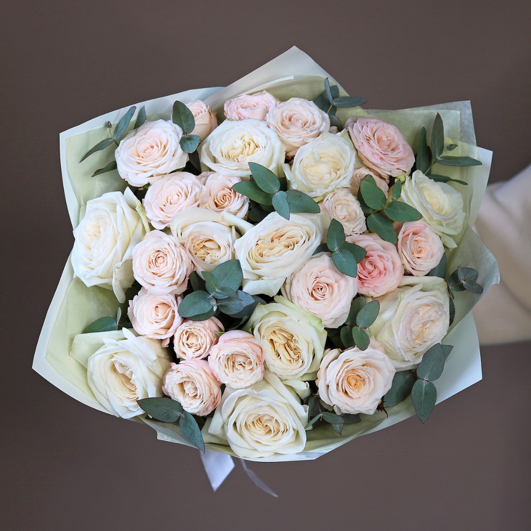 Букет из роз, в составе пионовидная роза вайт охара и бомбастик. На фотографии размер S. Вы можете выбрать любой размер букета указанный в перечне к нему.