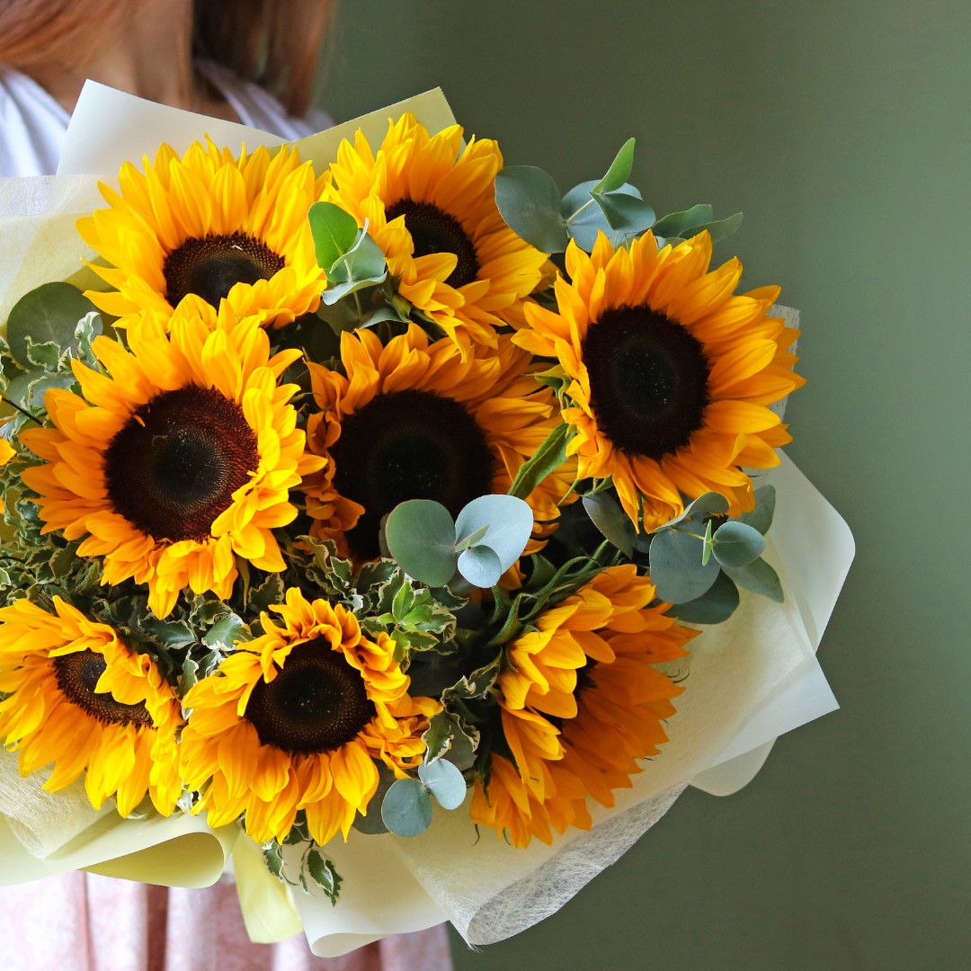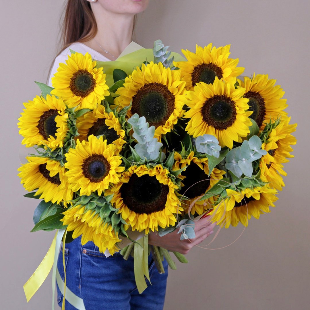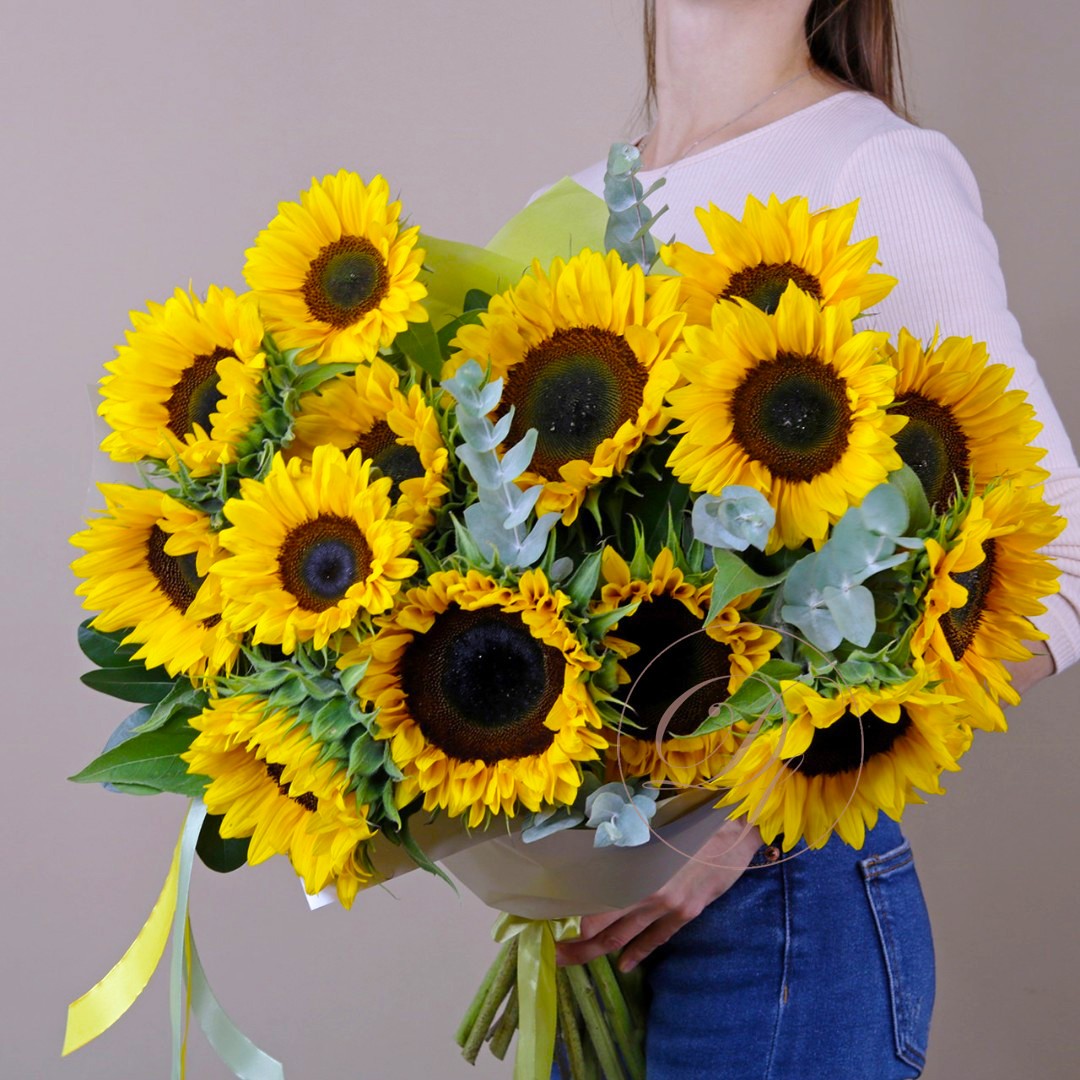 Купить подсолнухи в Москве. Букет из Подсолнухов с зеленью эвкалипта и сезонной зелени. Вы можете выбрать любое количество цветов указанное в перечне к данному букету.
