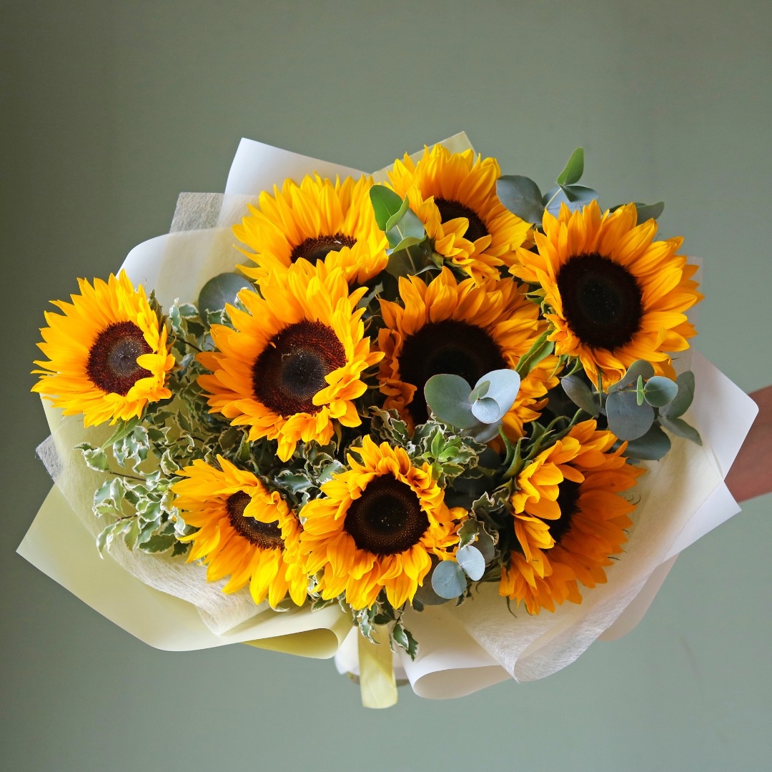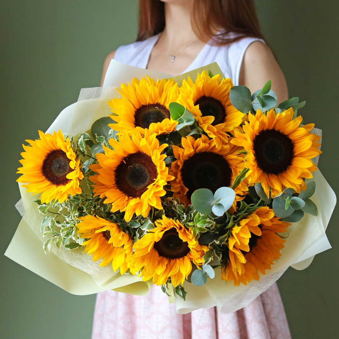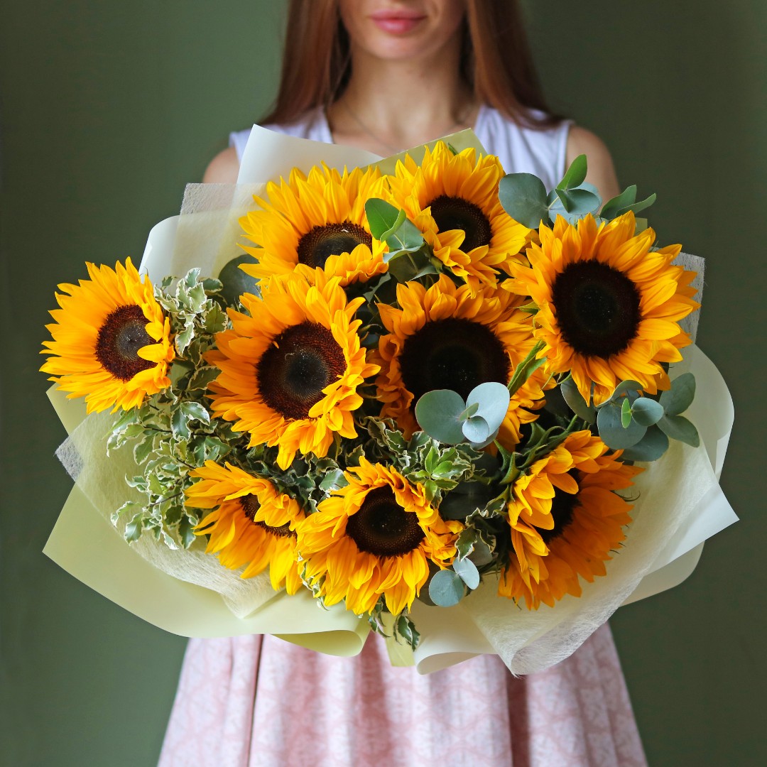 Купить подсолнухи в Москве. Букет из Подсолнухов с зеленью эвкалипта и сезонной зелени. Вы можете выбрать любое количество цветов указанное в перечне к данному букету.