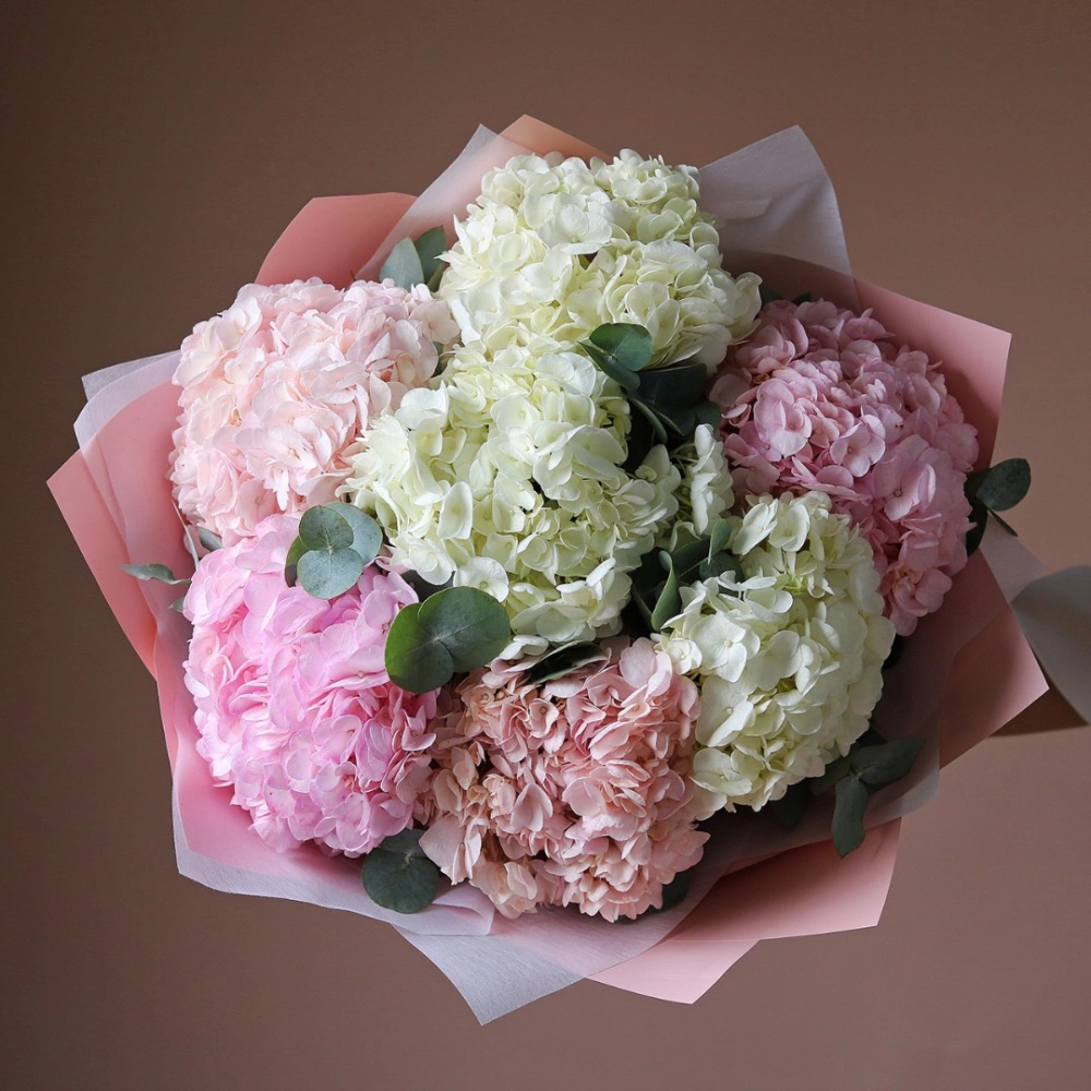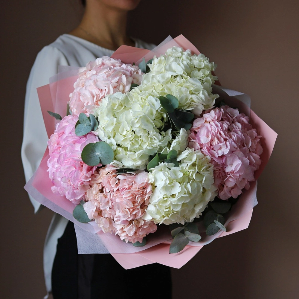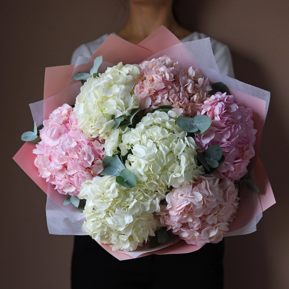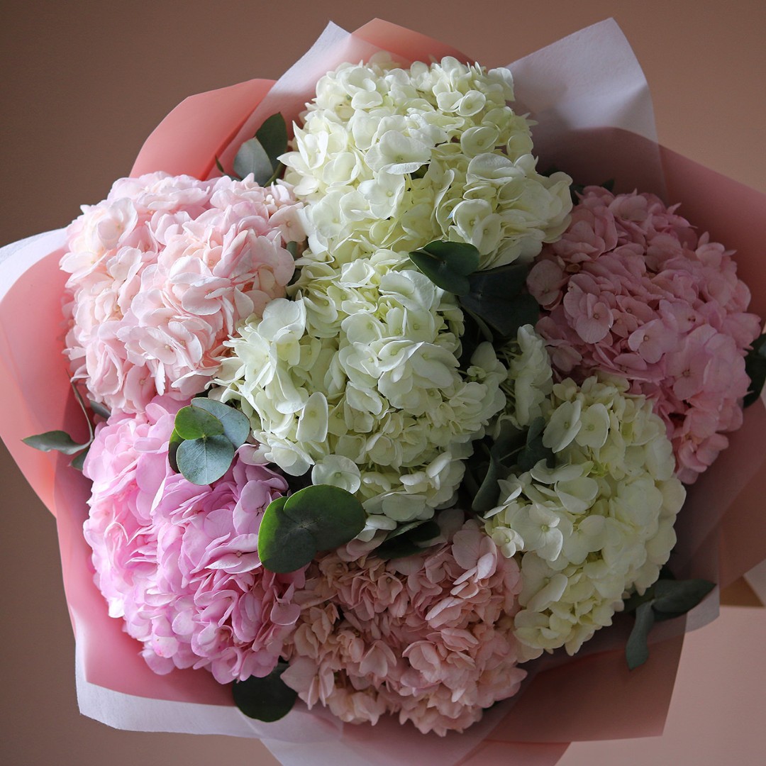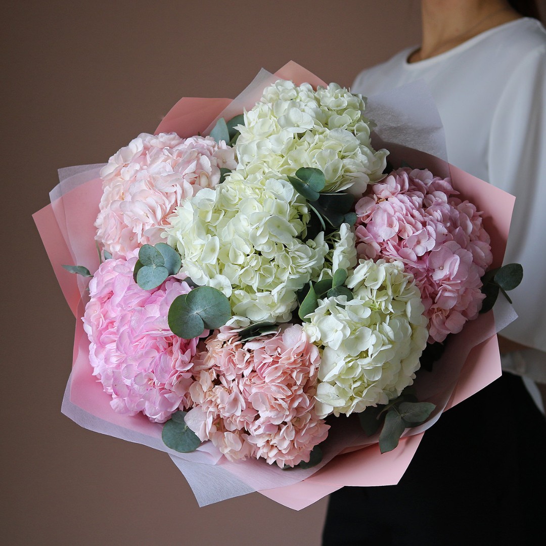 Букет из белой и розовой гортензии с эвкалиптом. На фотографии букет из 7 гортензий. Вы можете выбрать любое количество цветов указанное в перечне к данному букету.