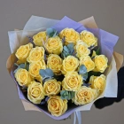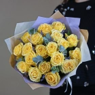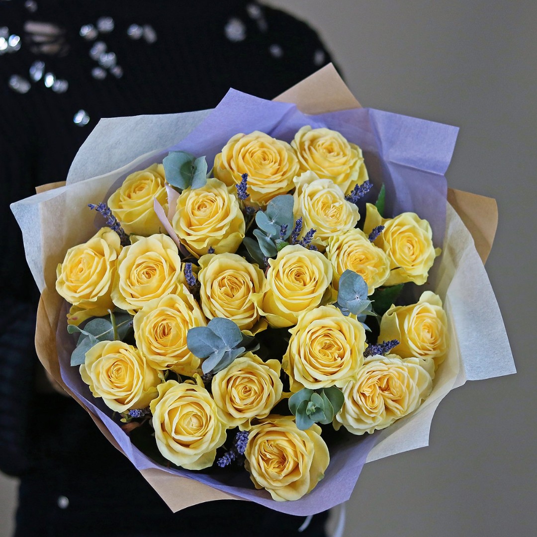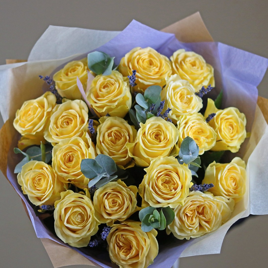 Букет из желтых роз и лаванды. На фотографии букет из 19 роз. Вы можете выбрать любое количество цветов указанное в перечне к данному букету.