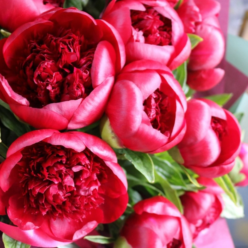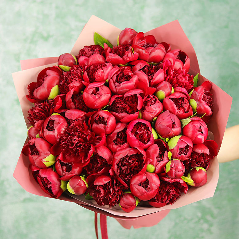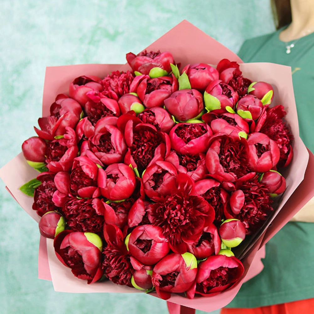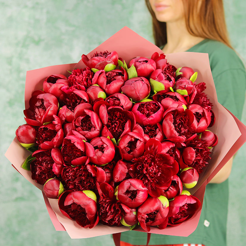 Букет красных пионов Ред шарм. На фотографии букет из 45 пионов. Вы можете выбрать любое количество цветов указанное в перечне к данному букету.