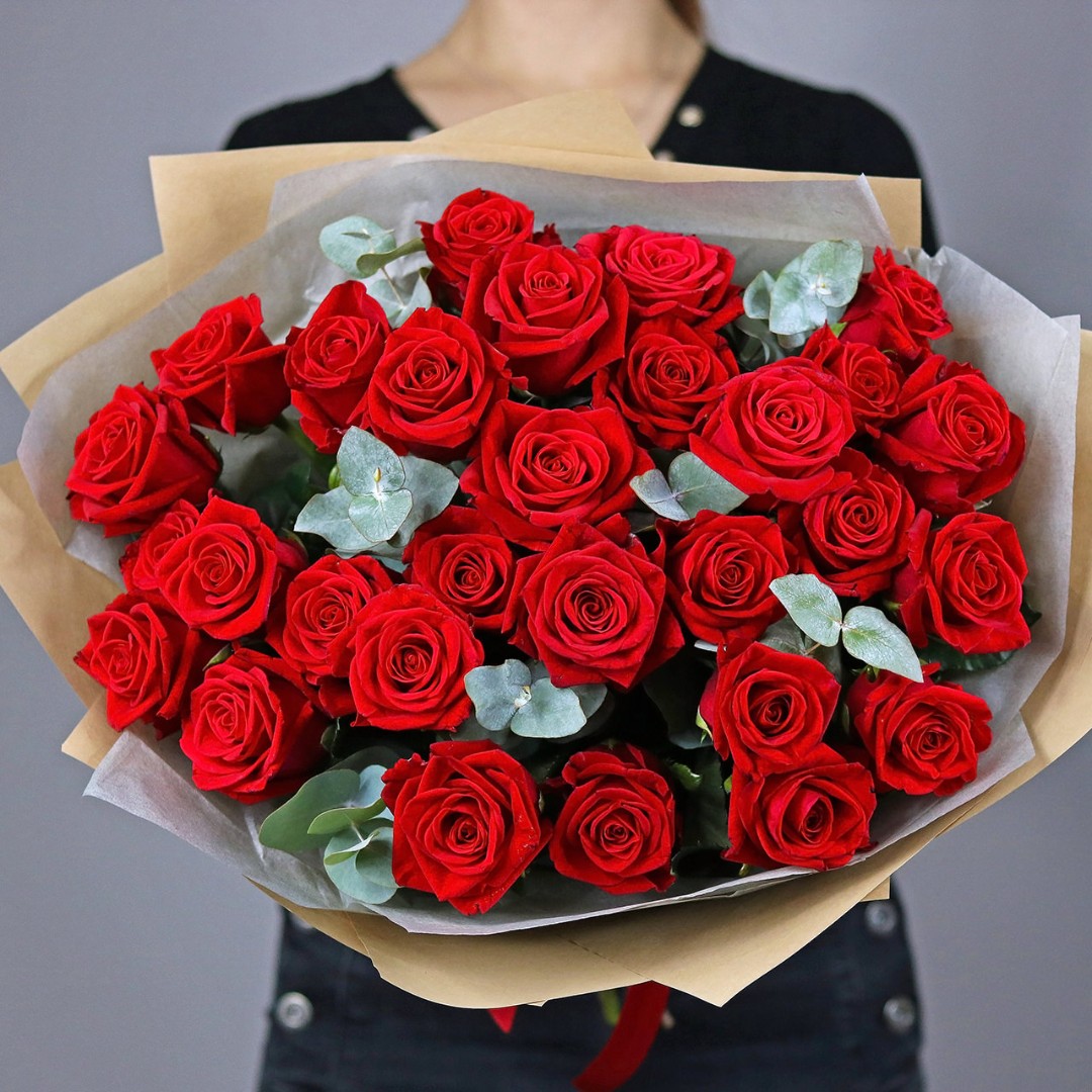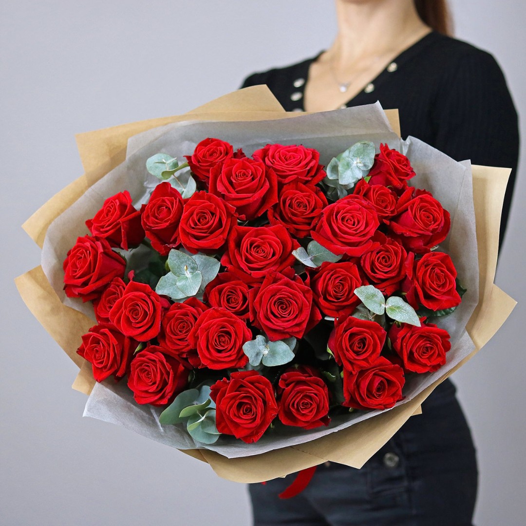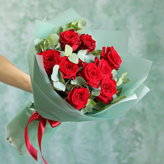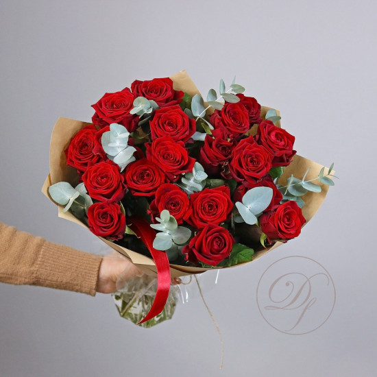 Букет красных роз с эвкалиптом