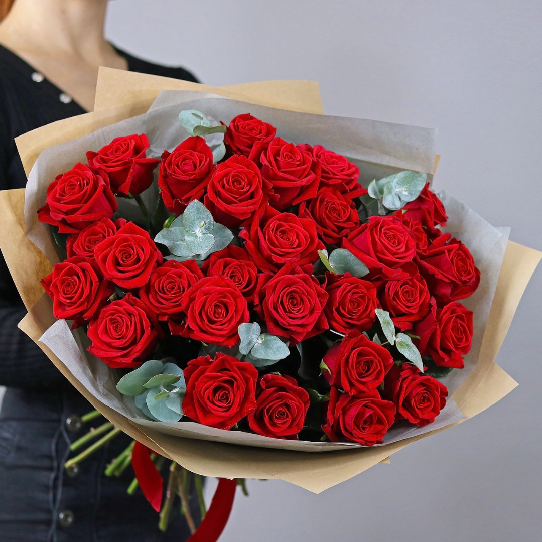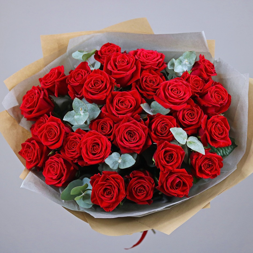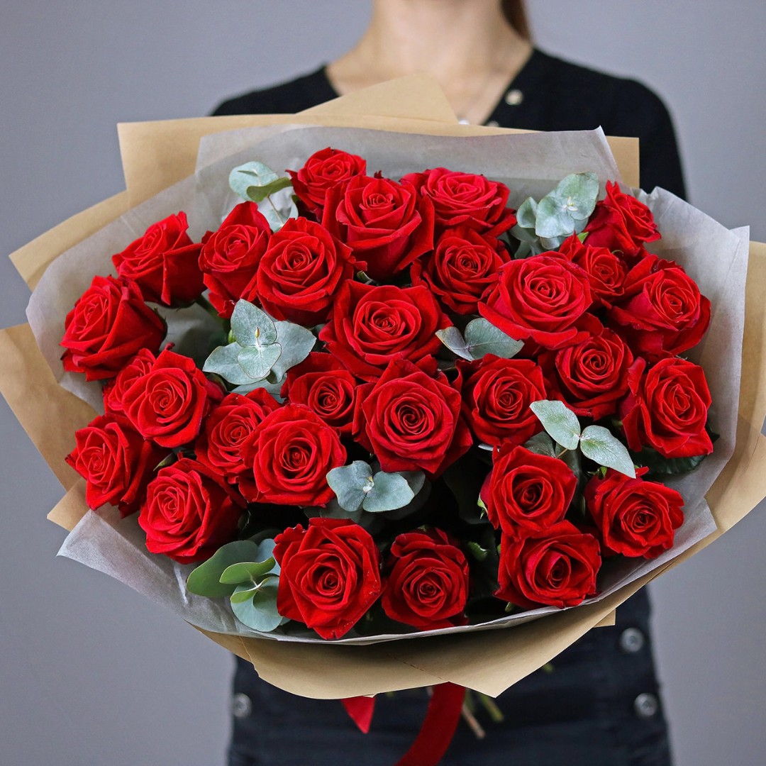 Букет красных роз с эвкалиптом
