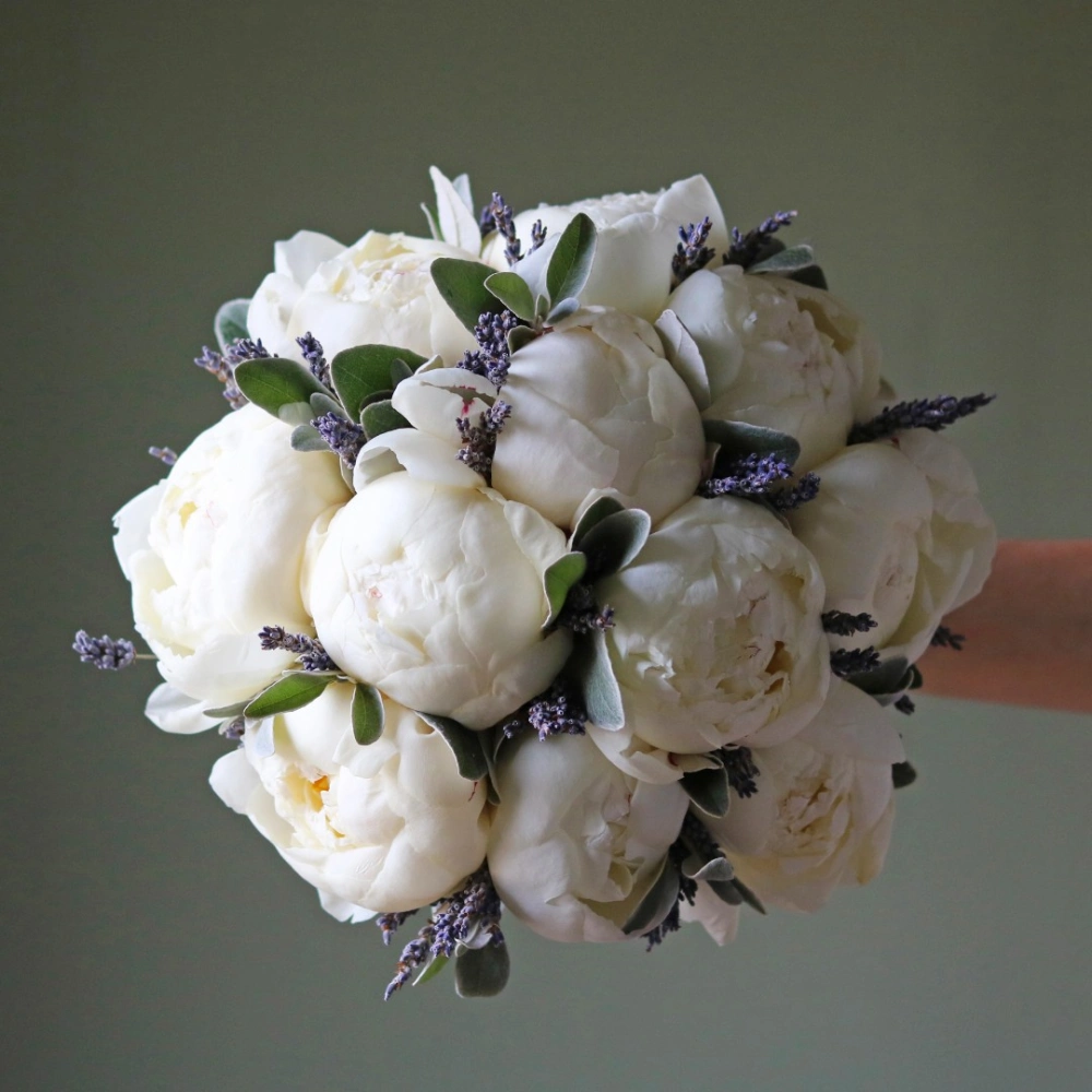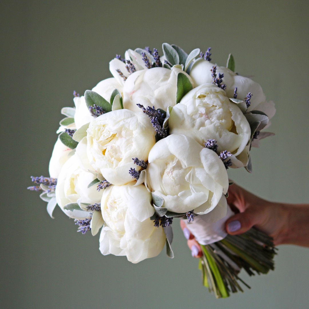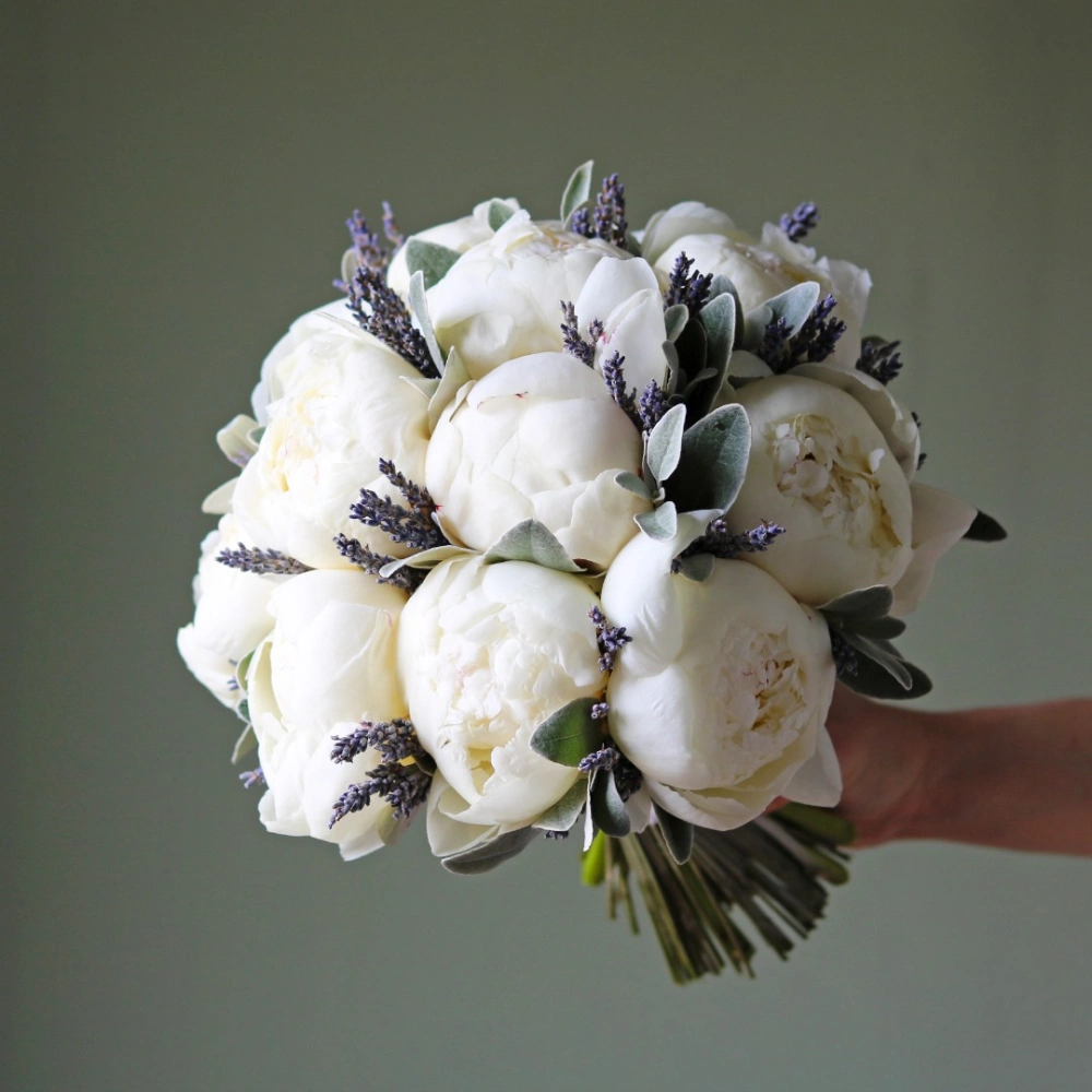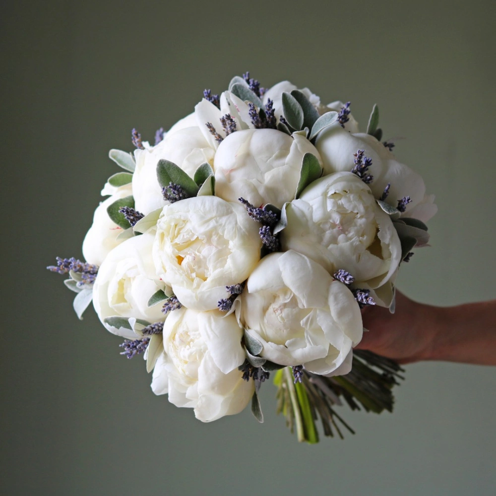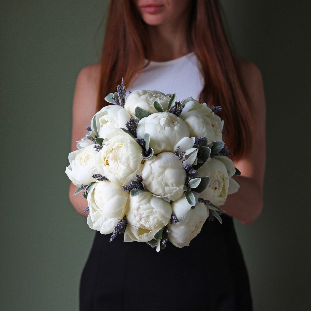 Букет невесты из белых пионов и лаванды