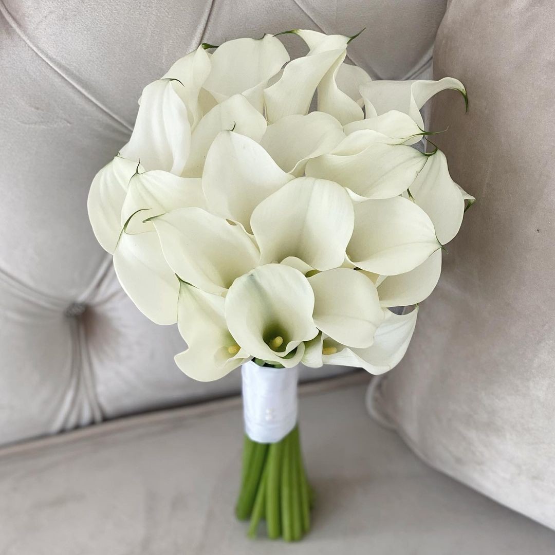 Букет невесты с изысканными белыми каллами. Ножка букета декорирована атласными лентами.