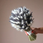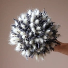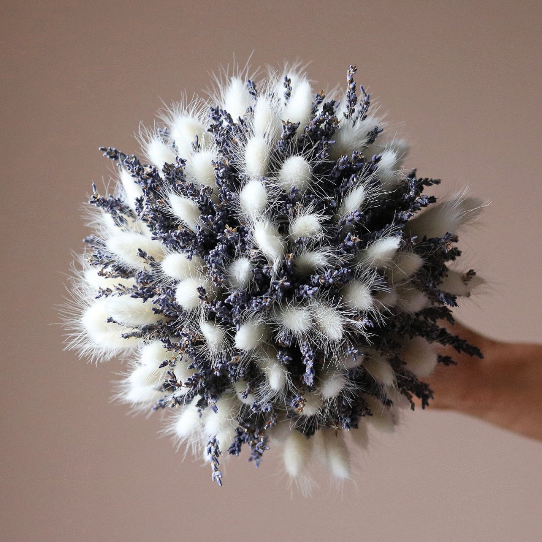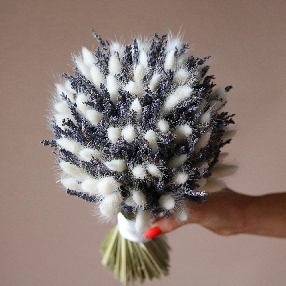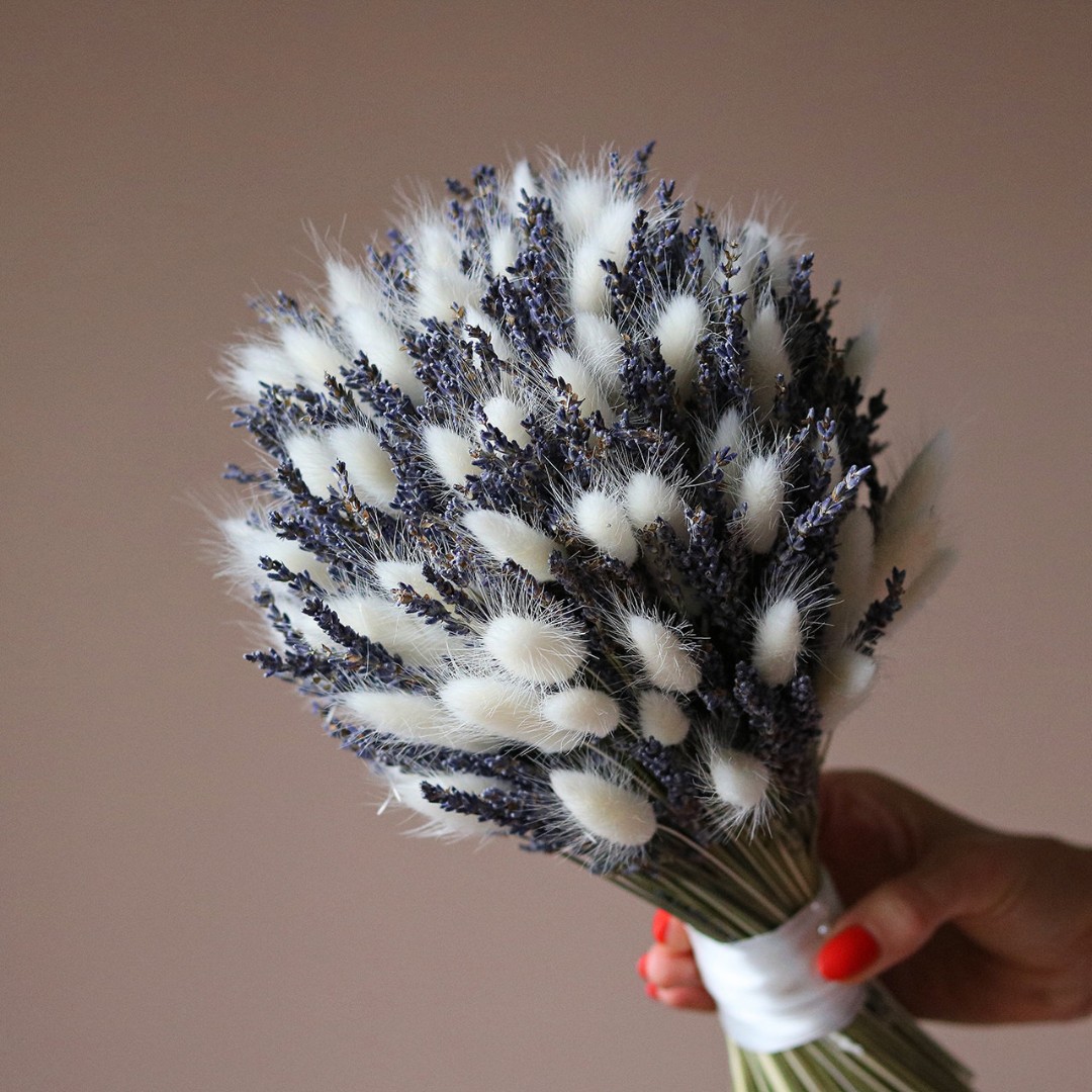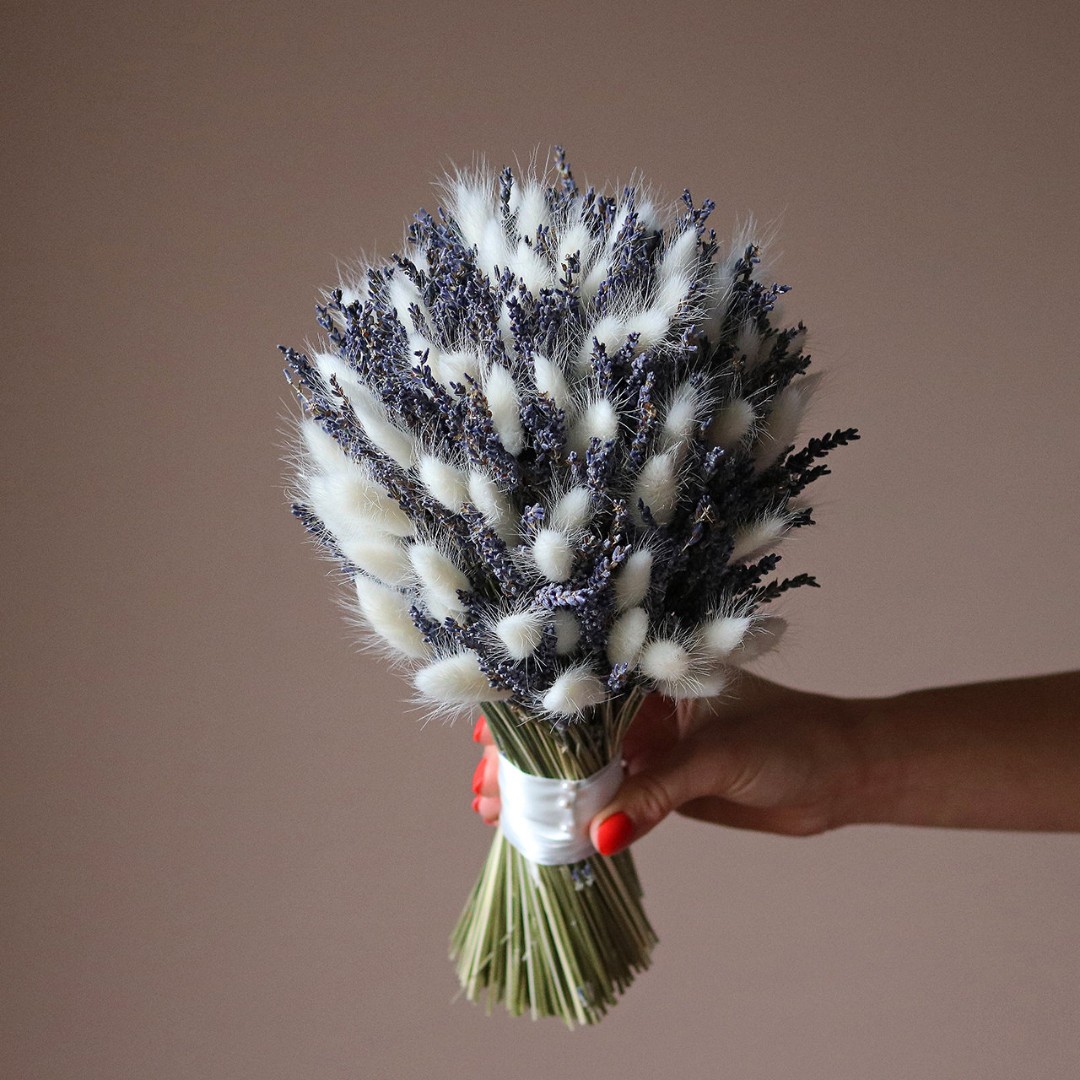 Букет невесты из сухоцветов. Букет из лаванды и лагуруса. Свадебный букет классической круглой формы в бело-синих тонах. Ножка букета декорирована атласными лентами.