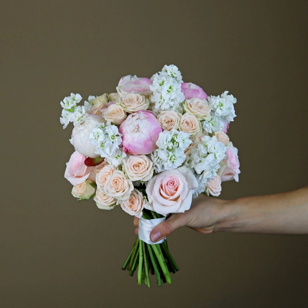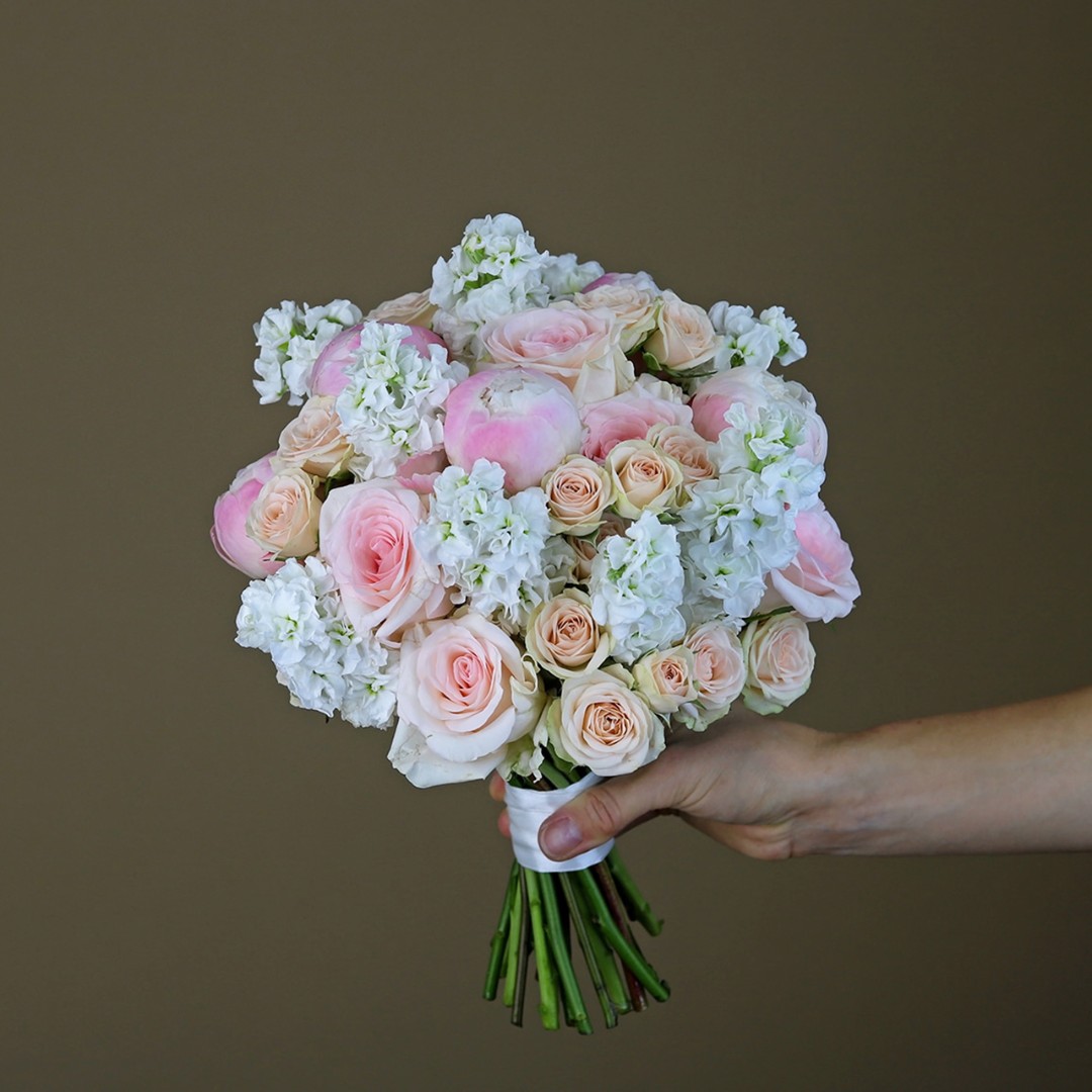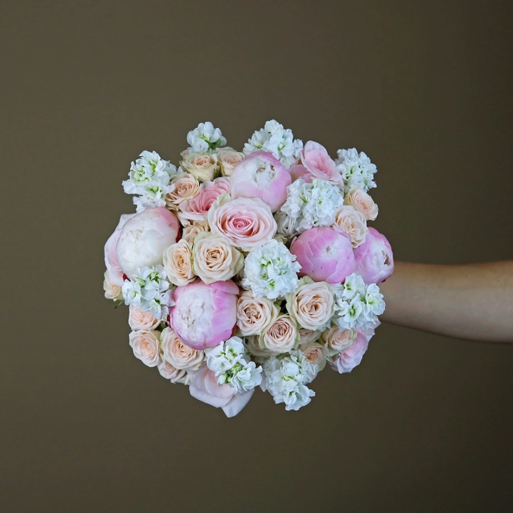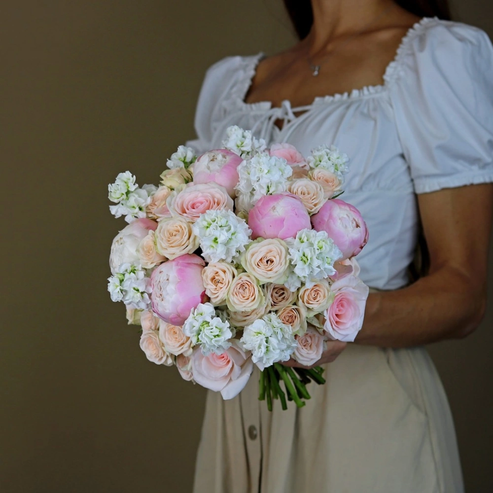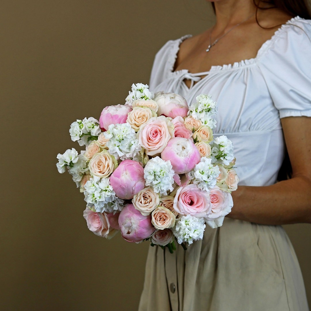 Букет невесты из пионов, роз и маттиолы