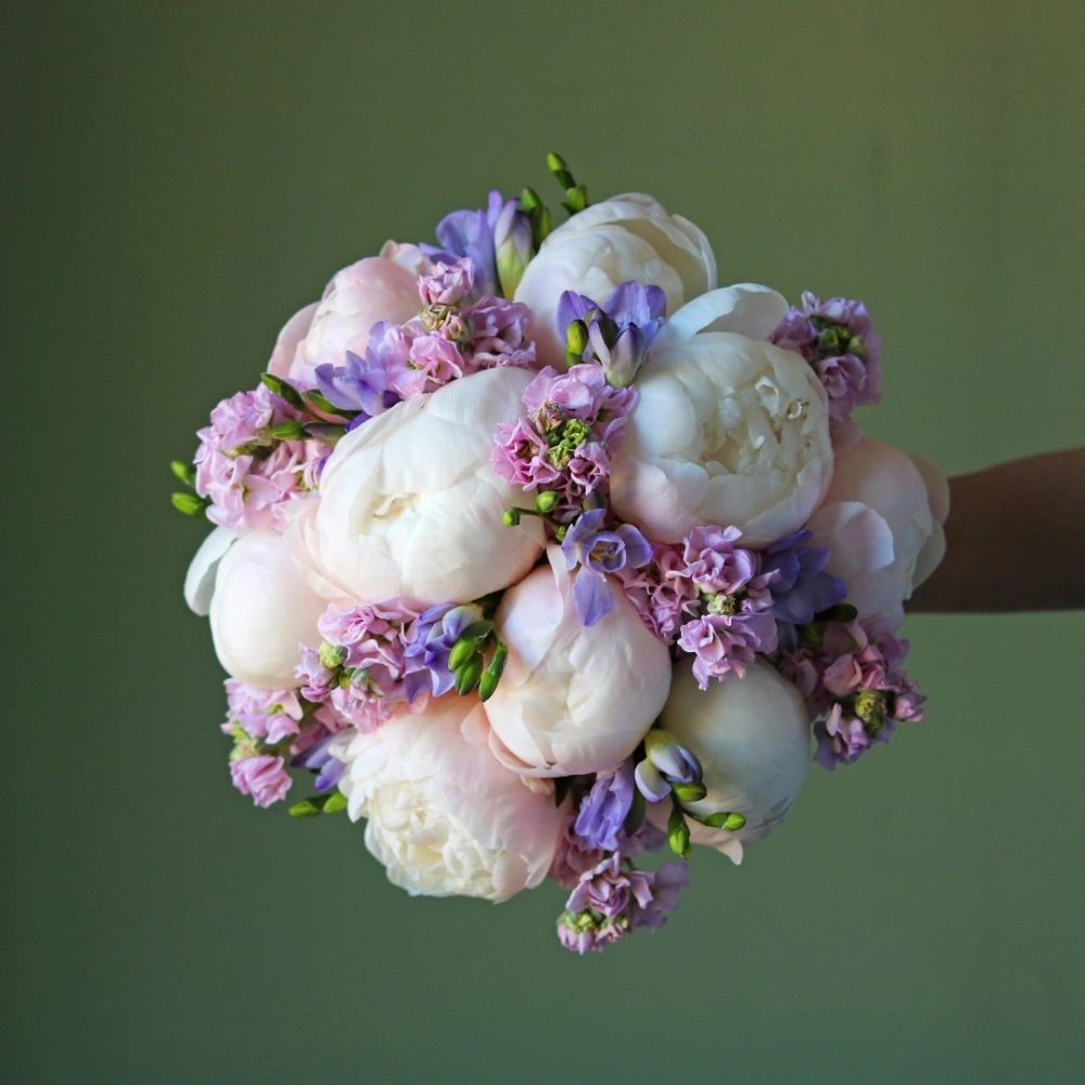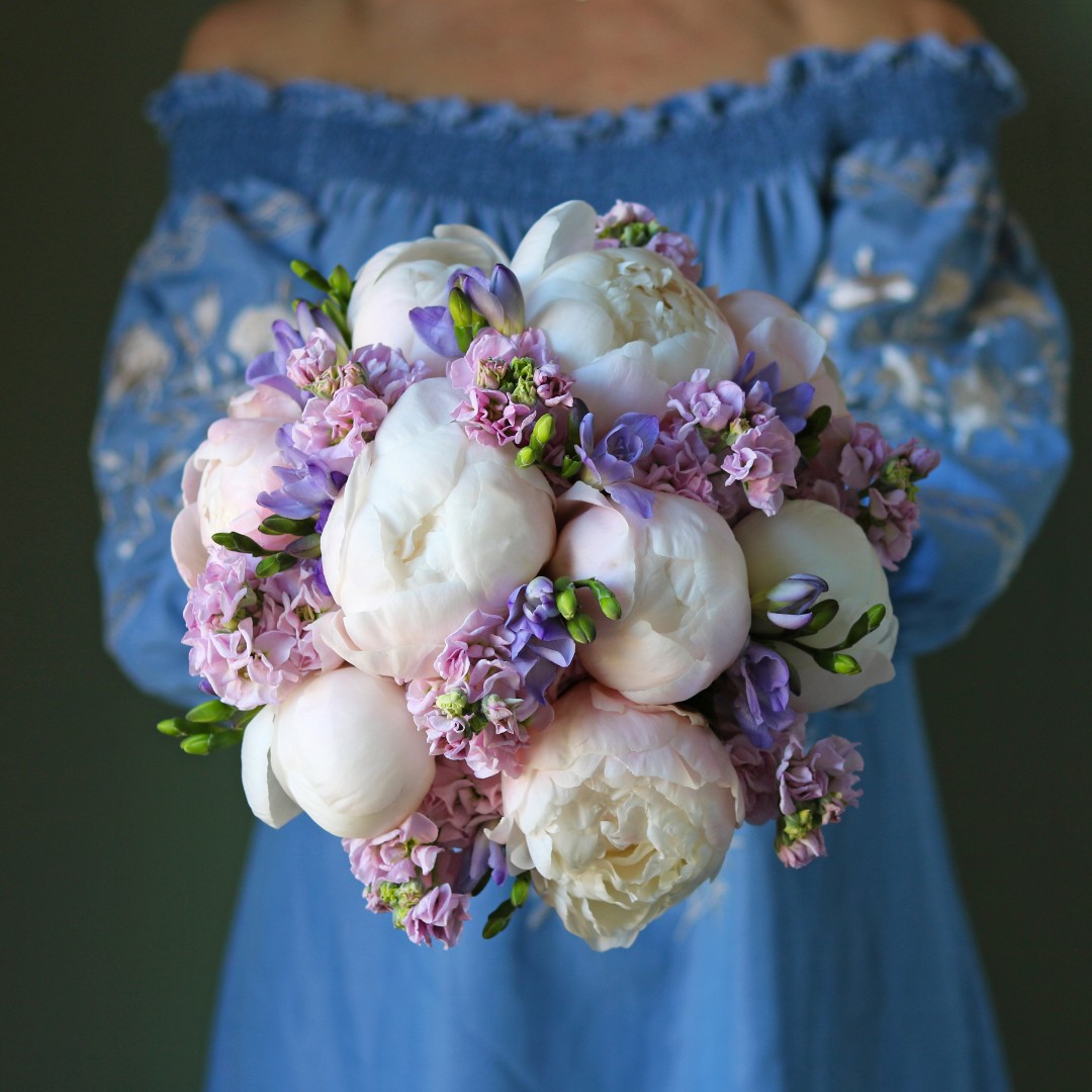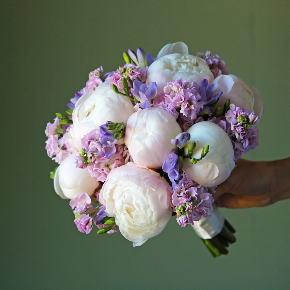 Букет невесты из пионов и фрезий. Бутоньерка для жениха в подарок. Нежно-розовые пионы, ароматная фрезия иипттиола лавандовых оттенков в свадебном букете. Букет сохранит свой внешний вид в течении дня. Свадебный букет классической круглой формы нежнорозовый с фиолетовыми оттенками. Ножка букета декорирована атласными лентами.