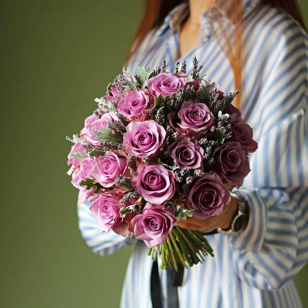 В составе букета: фиолетовая роза.