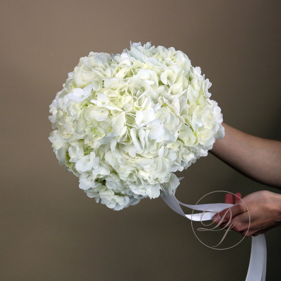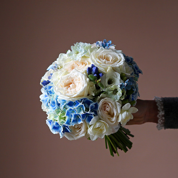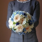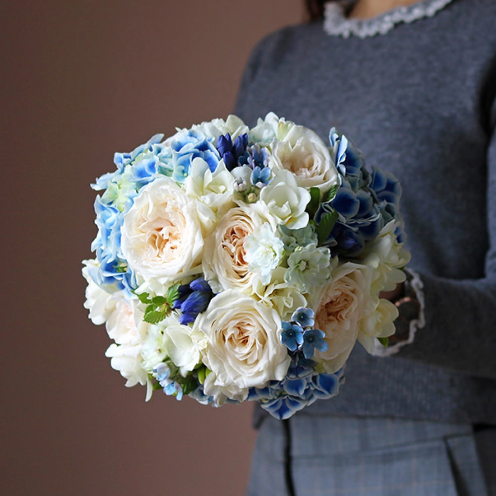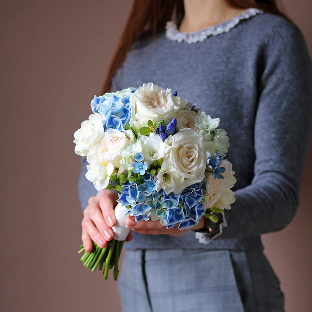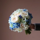 В составе букета: роза пионовидная Вайт Охара, голубая гортензия и множество других сезонных цветов в подходящей цветовой гамме.