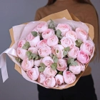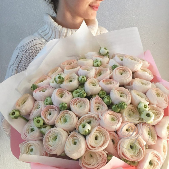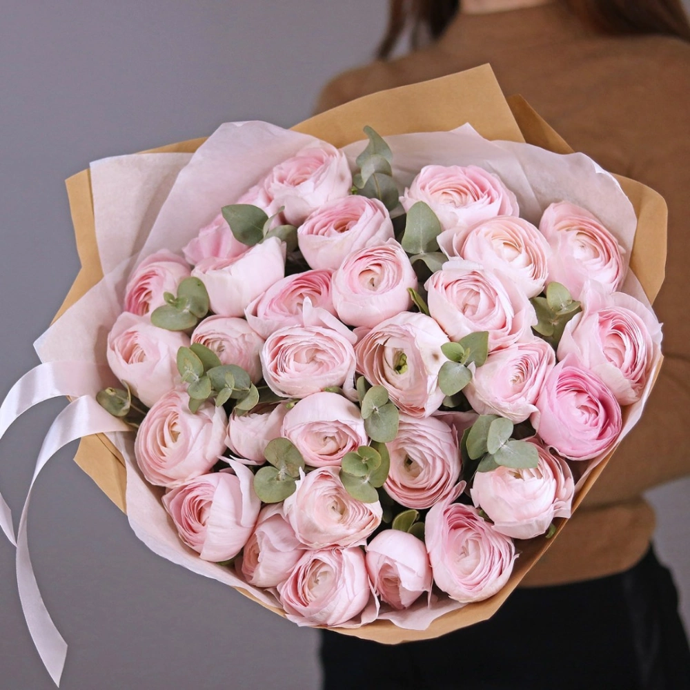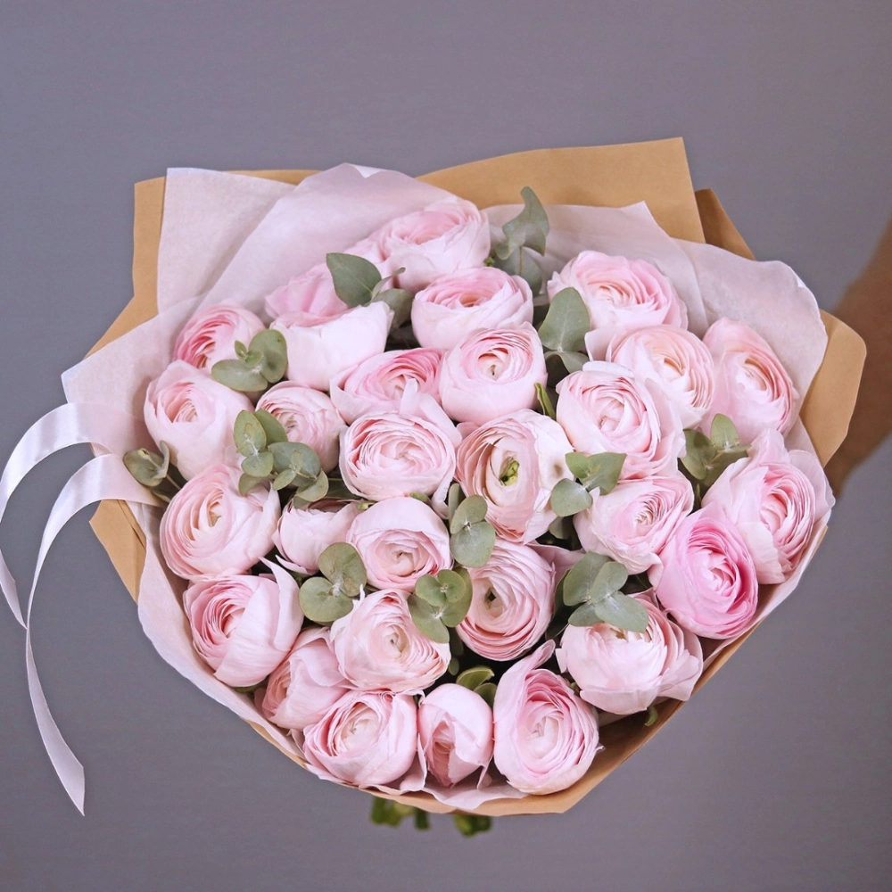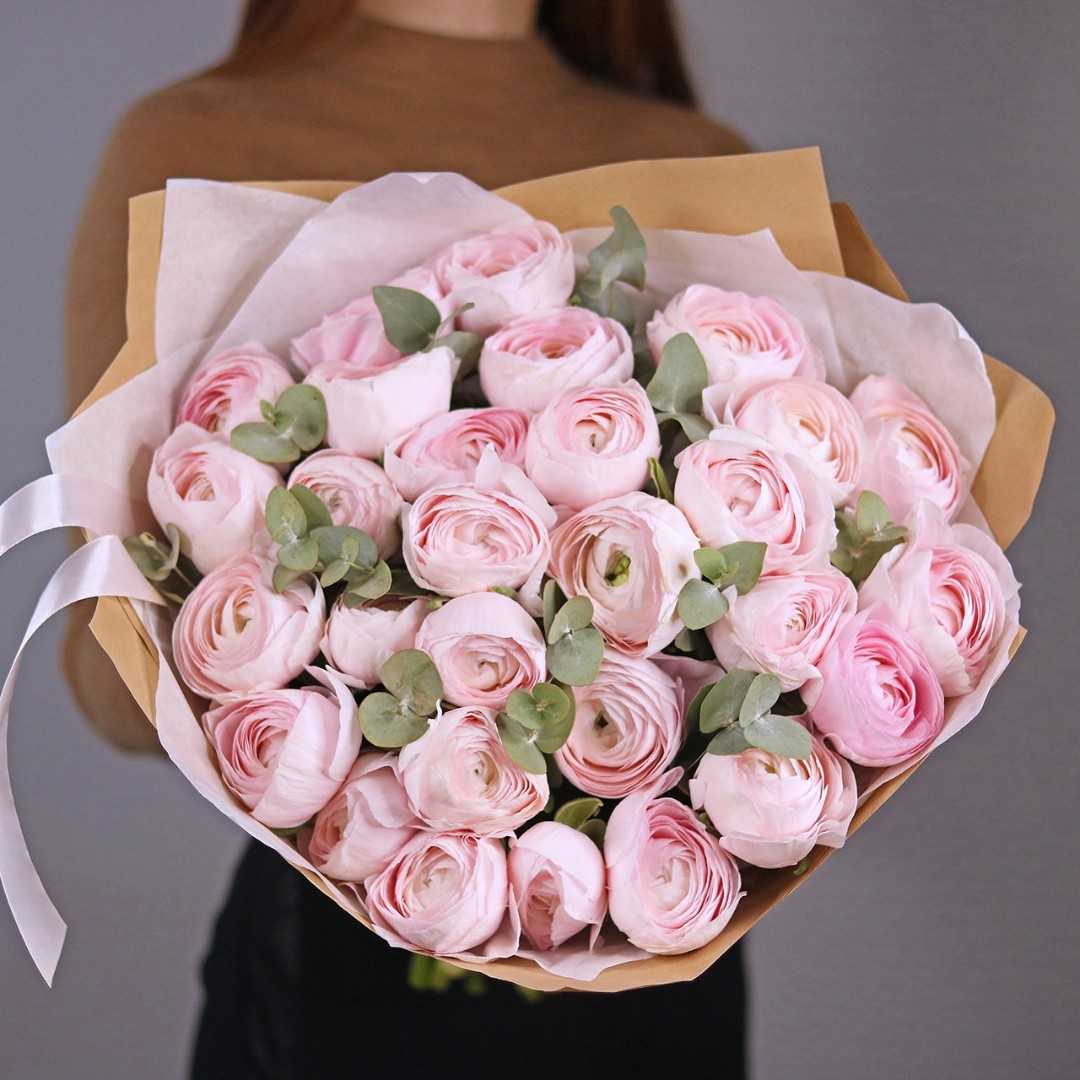 Букет из Ранункулюсов с эвкалиптом. На фотографии 29 ранункулюсов в букете. Вы можете выбрать любое количество цветов указанное в перечне к данному букету.