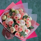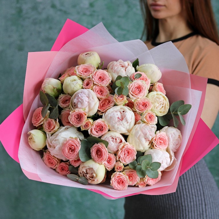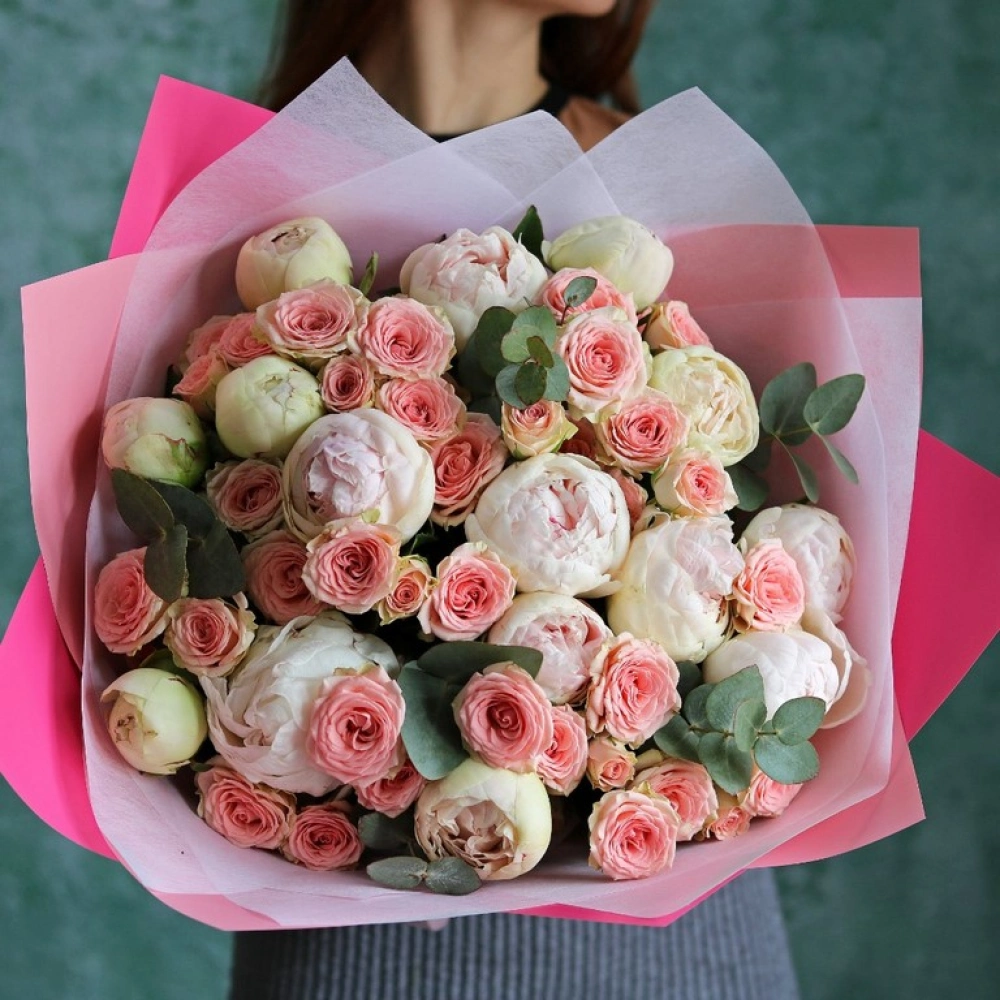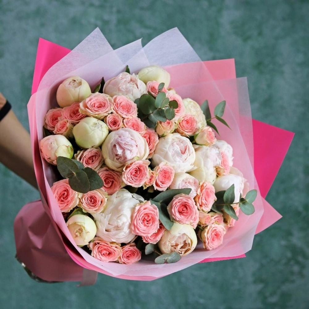 Букет из пионов сорт Гардения и кустовой розовой розы. На фотографии размер L.
