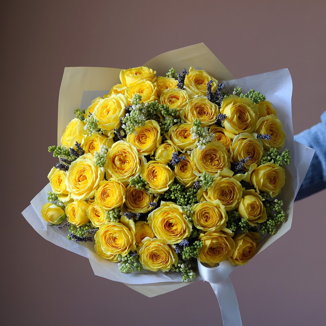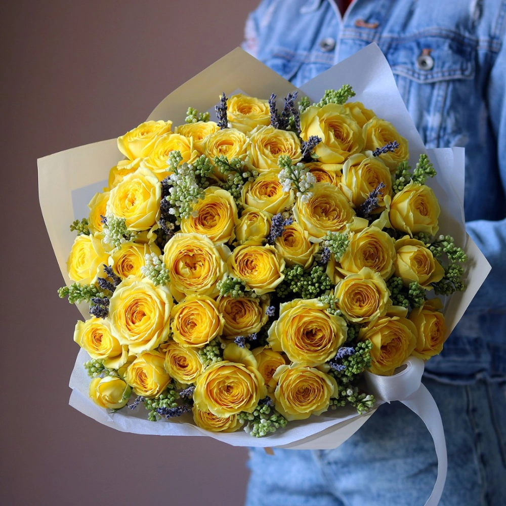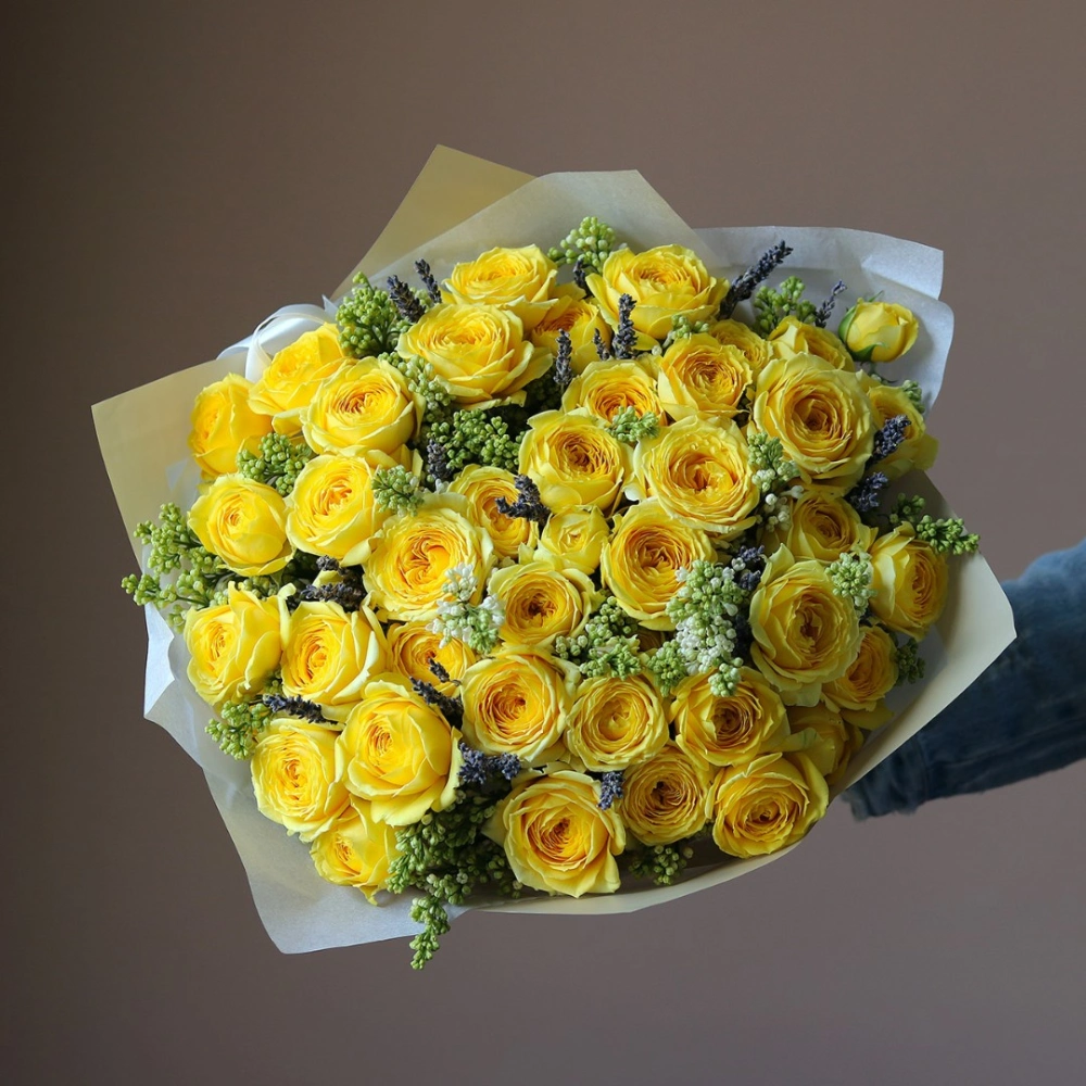 Букет из желтых роз и белой сирени. Вы можете выбрать любое количество цветов указанное в перечне к данному букету.