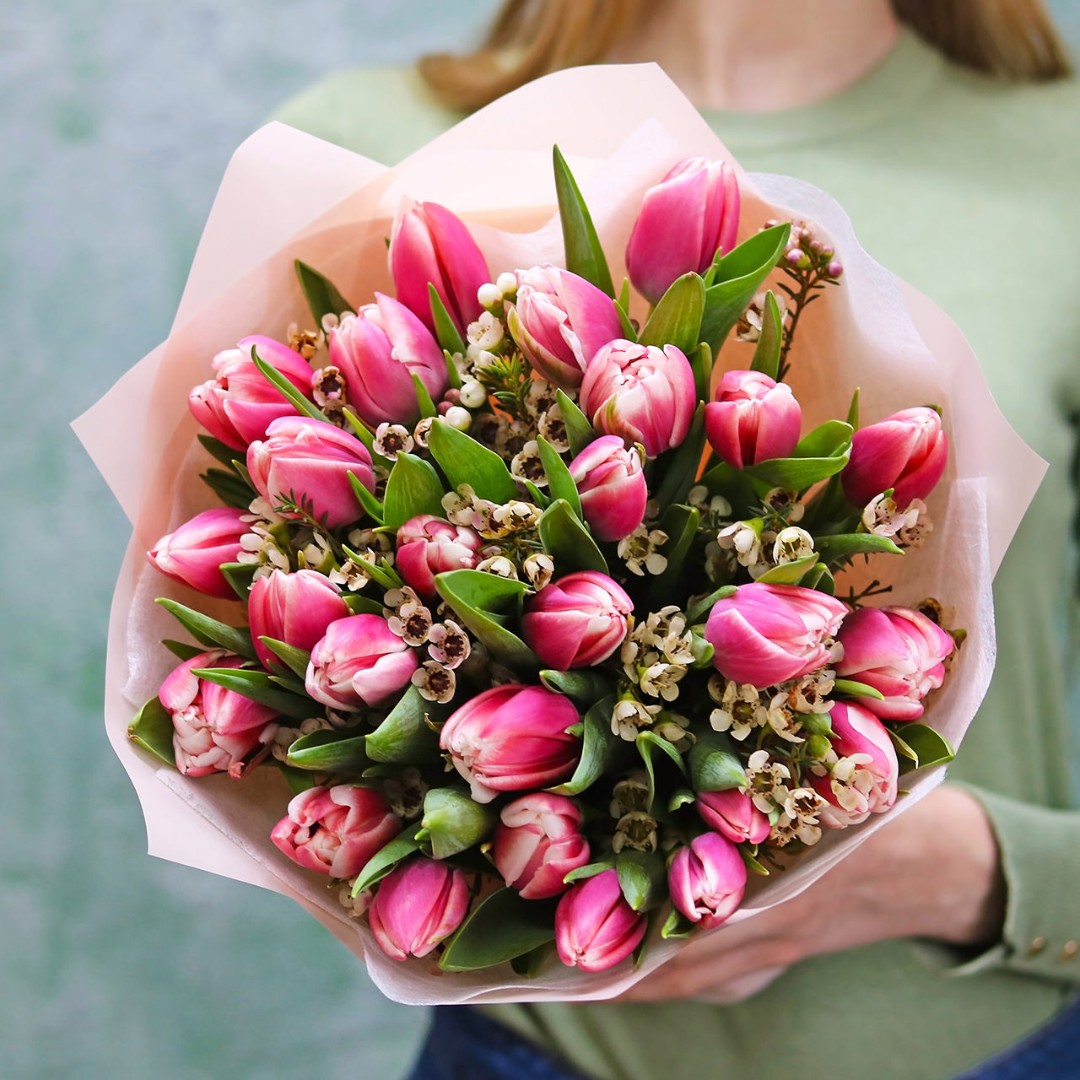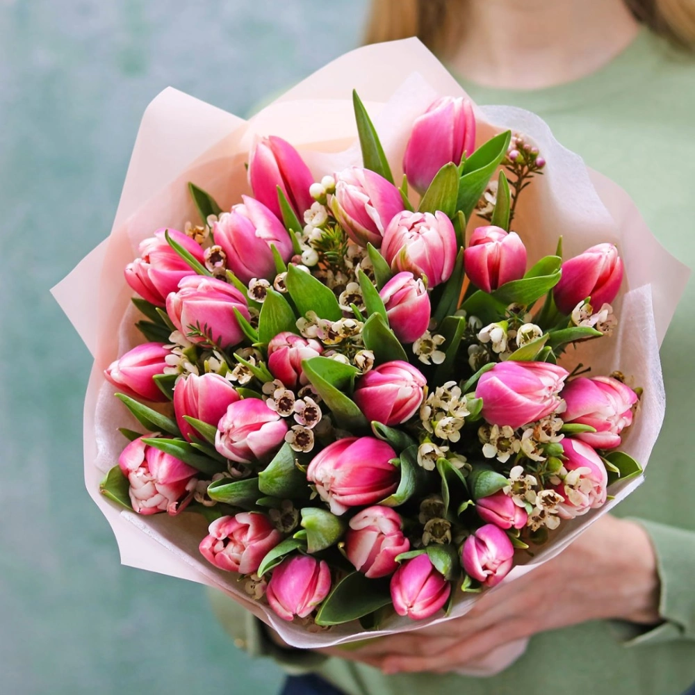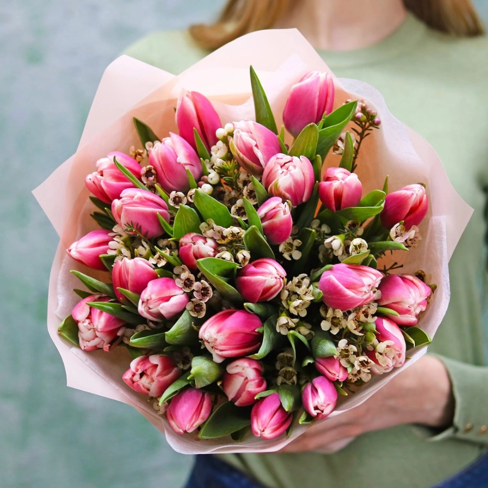 Букет из розовых махровых Тюльпанов с цветами ваксфлавер. Вы можете выбрать любое количество цветов указанное в перечне к данному букету.