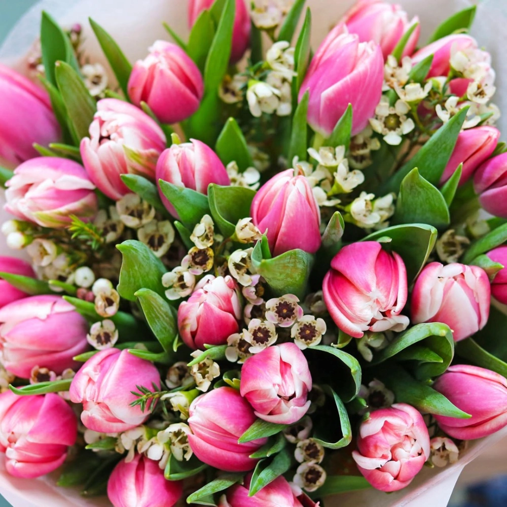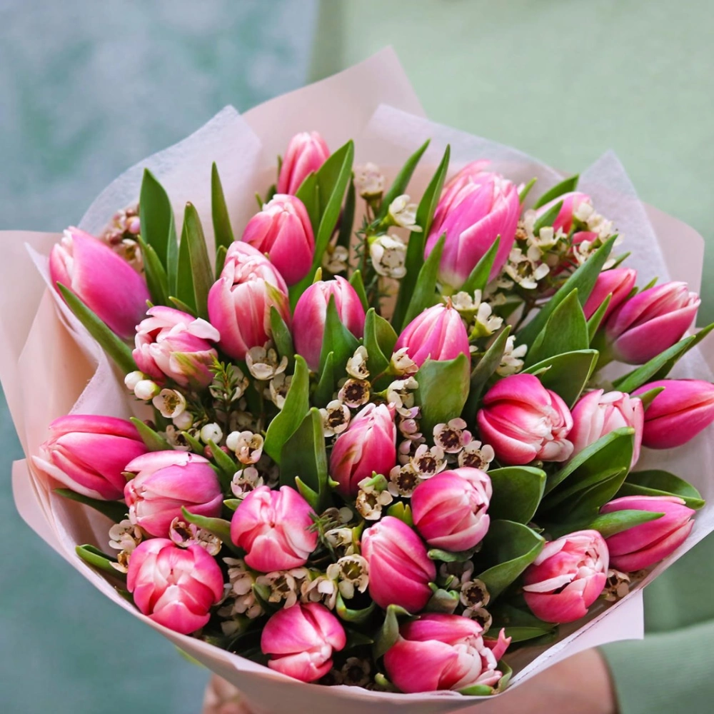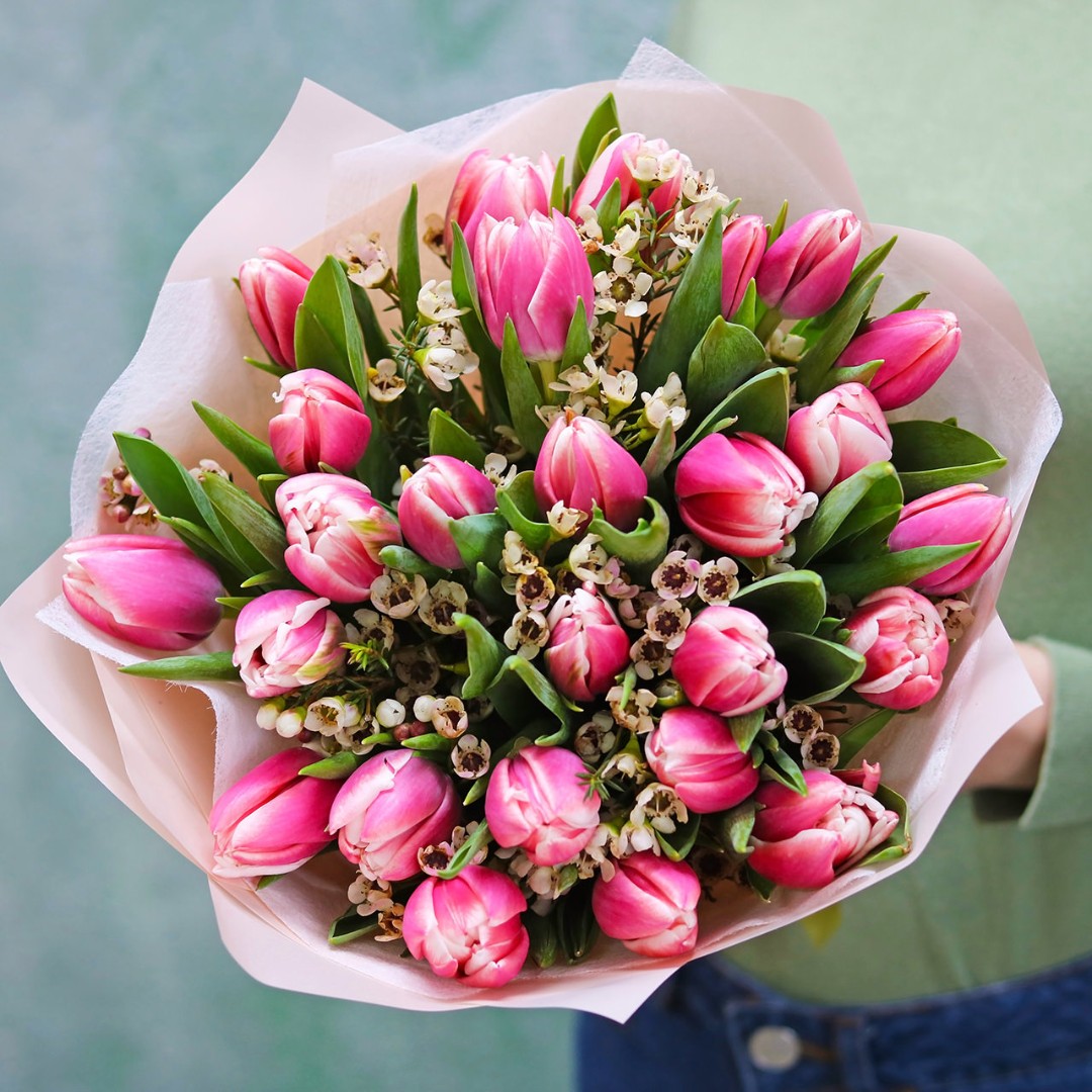 Букет из розовых махровых Тюльпанов с цветами ваксфлавер. Вы можете выбрать любое количество цветов указанное в перечне к данному букету.
