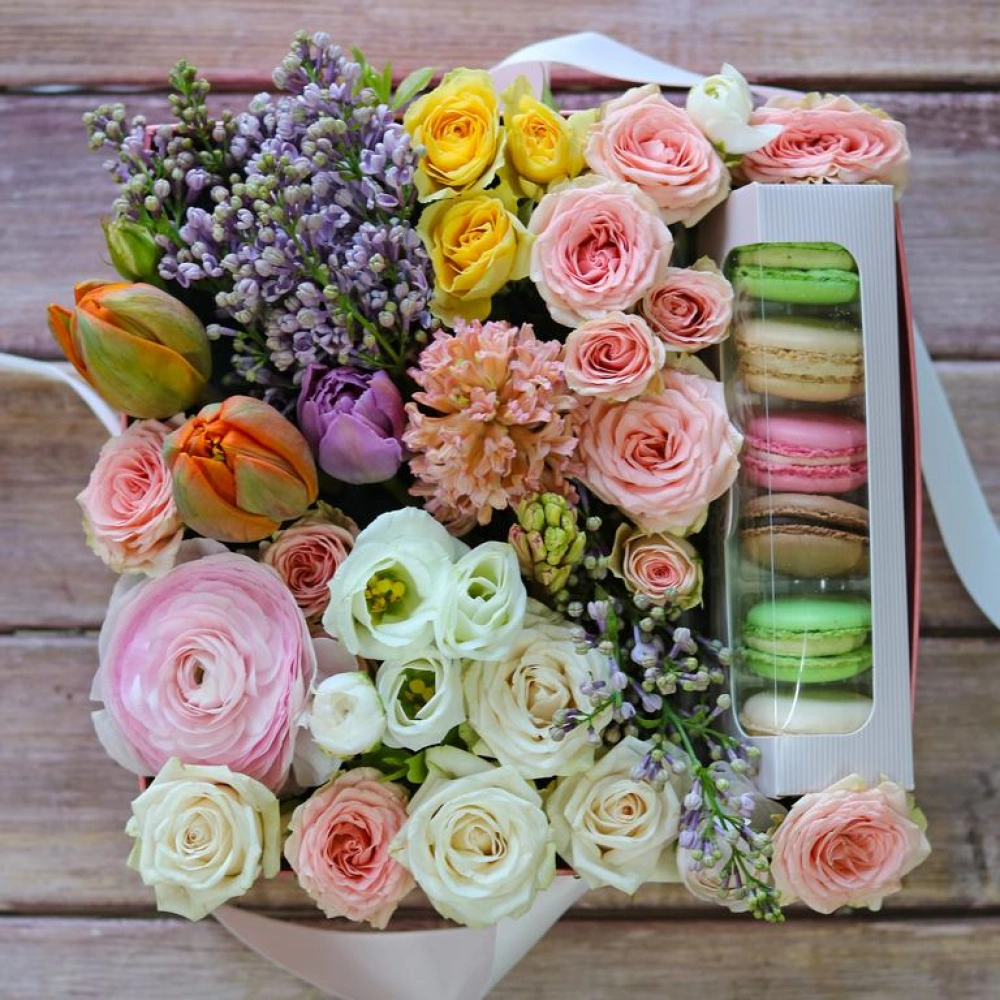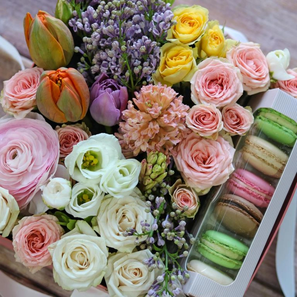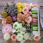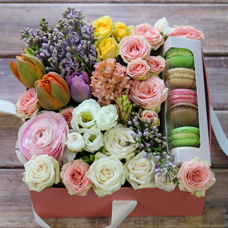 Авторские цветочные композиции в элегантных коробках различных форм, цветов, размеров, с добавлением сладостей в виде: баночки меда peroni, французских пирожных macarons, имбирных пряников и свежих ягод.
