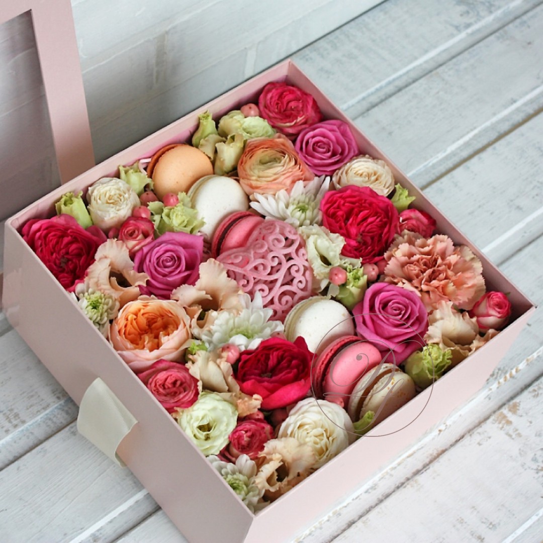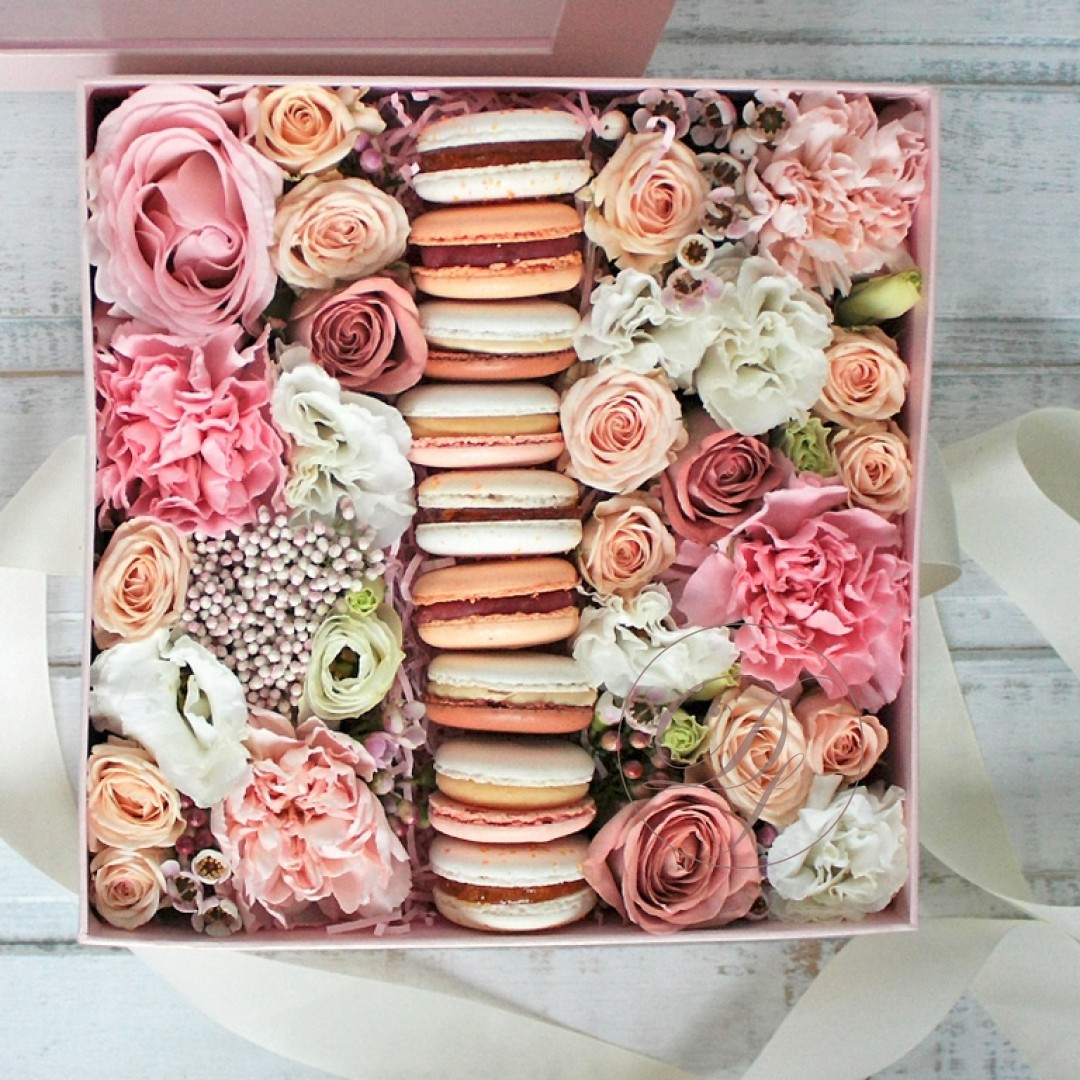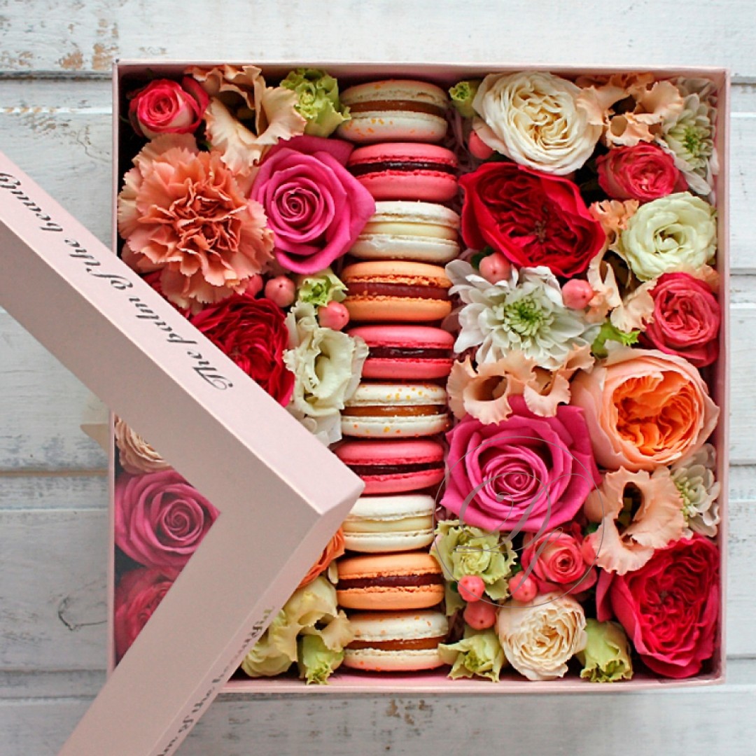 Авторские цветочные композиции в элегантных коробках различных форм, цветов, размеров, с добавлением сладостей в виде: баночки меда peroni, французских пирожных macarons, имбирных пряников и свежих ягод.