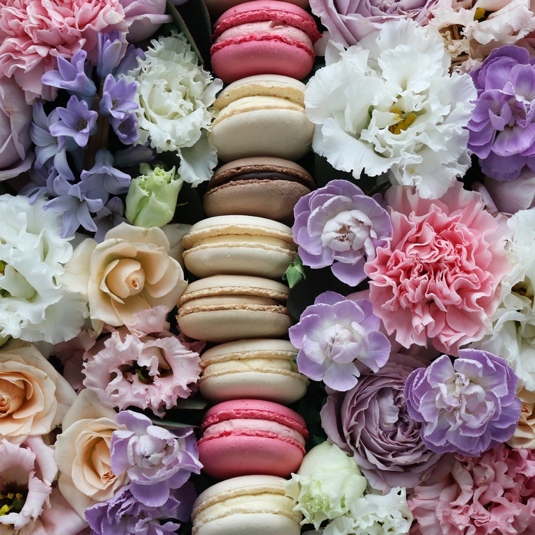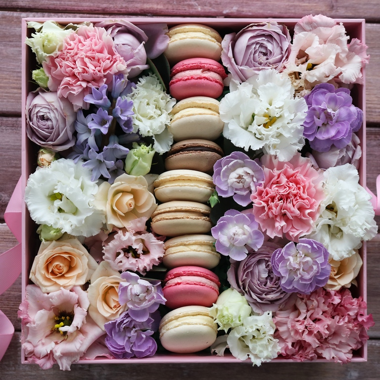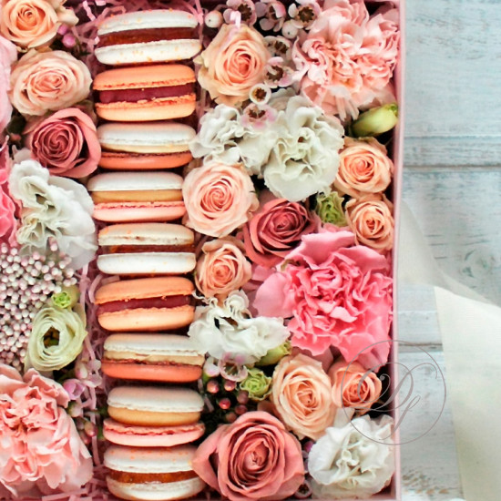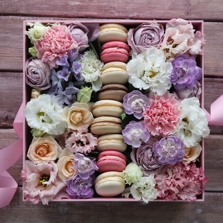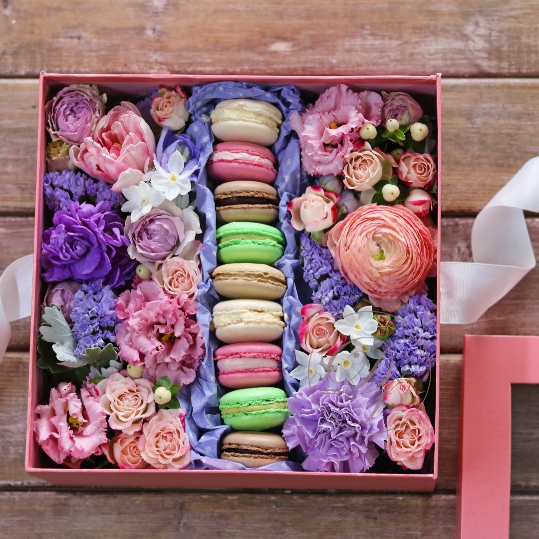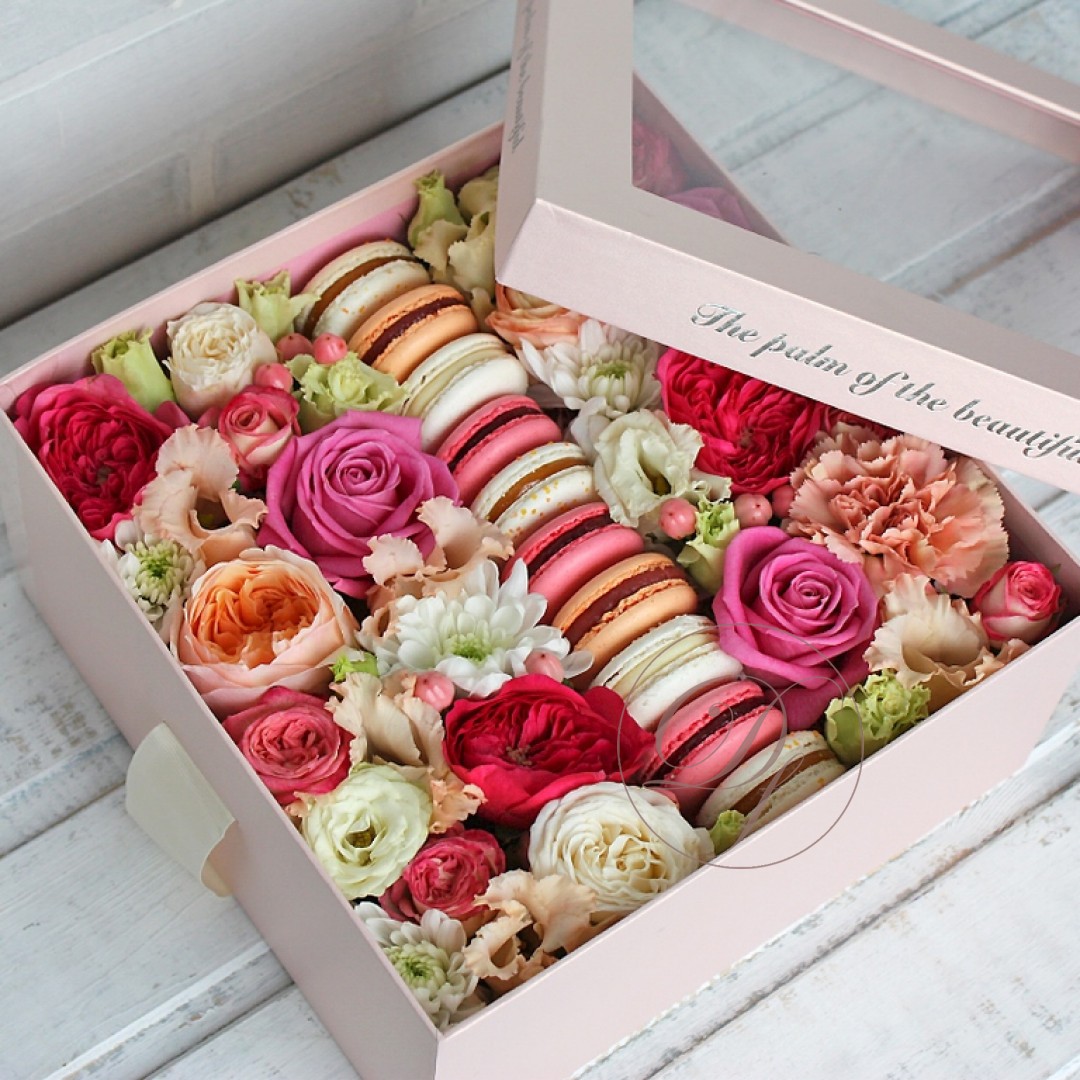 Авторские цветочные композиции в элегантных коробках различных форм, цветов, размеров, с добавлением сладостей в виде: баночки меда peroni, французских пирожных macarons, имбирных пряников и свежих ягод.