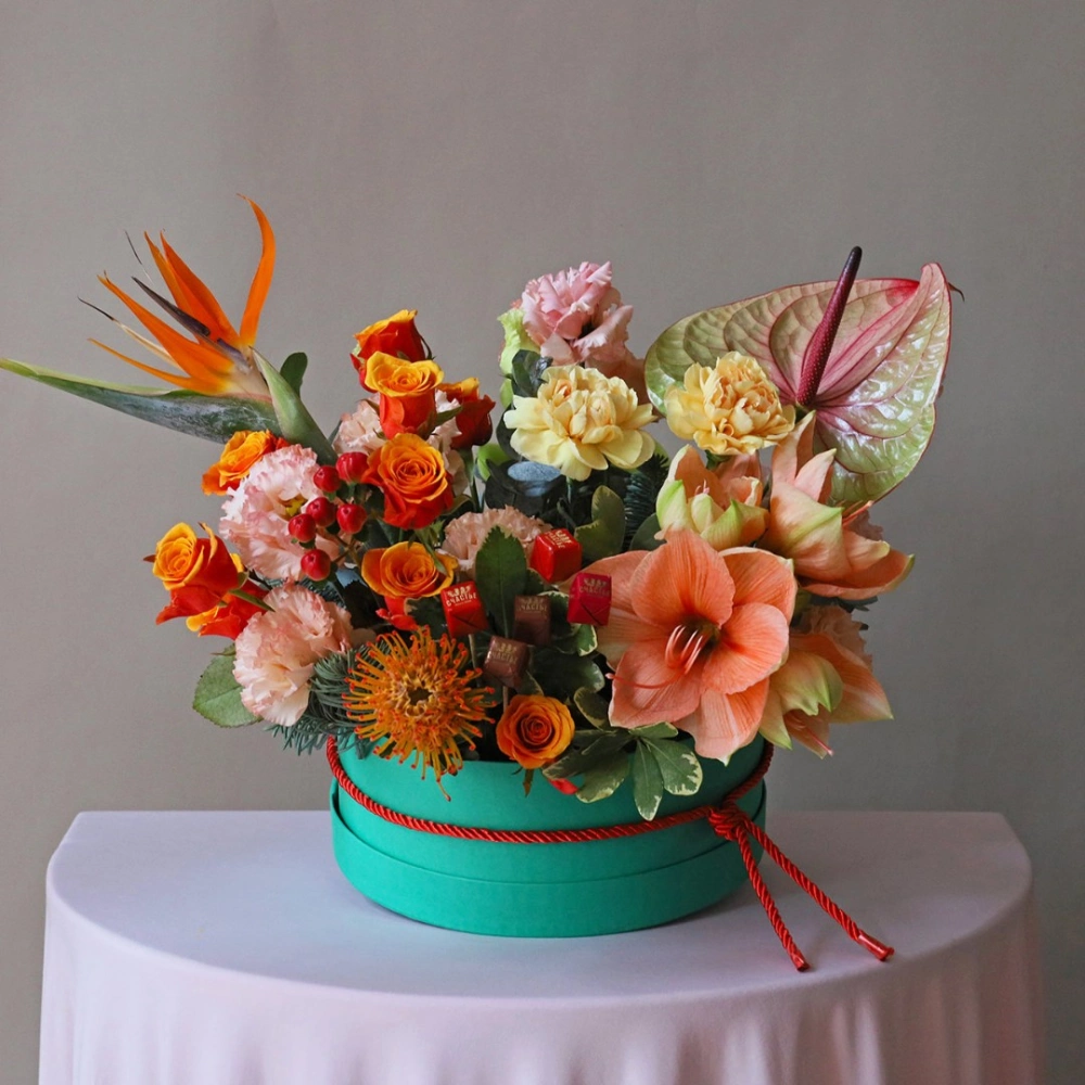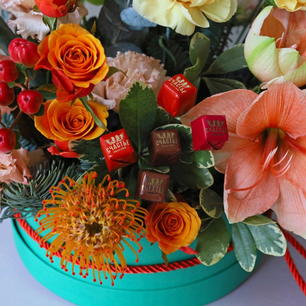 Авторские цветочные композиции в элегантных коробках различных форм, цветов, размеров, с добавлением сладостей в виде: конфет "Счастье"