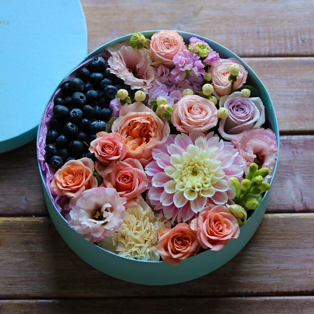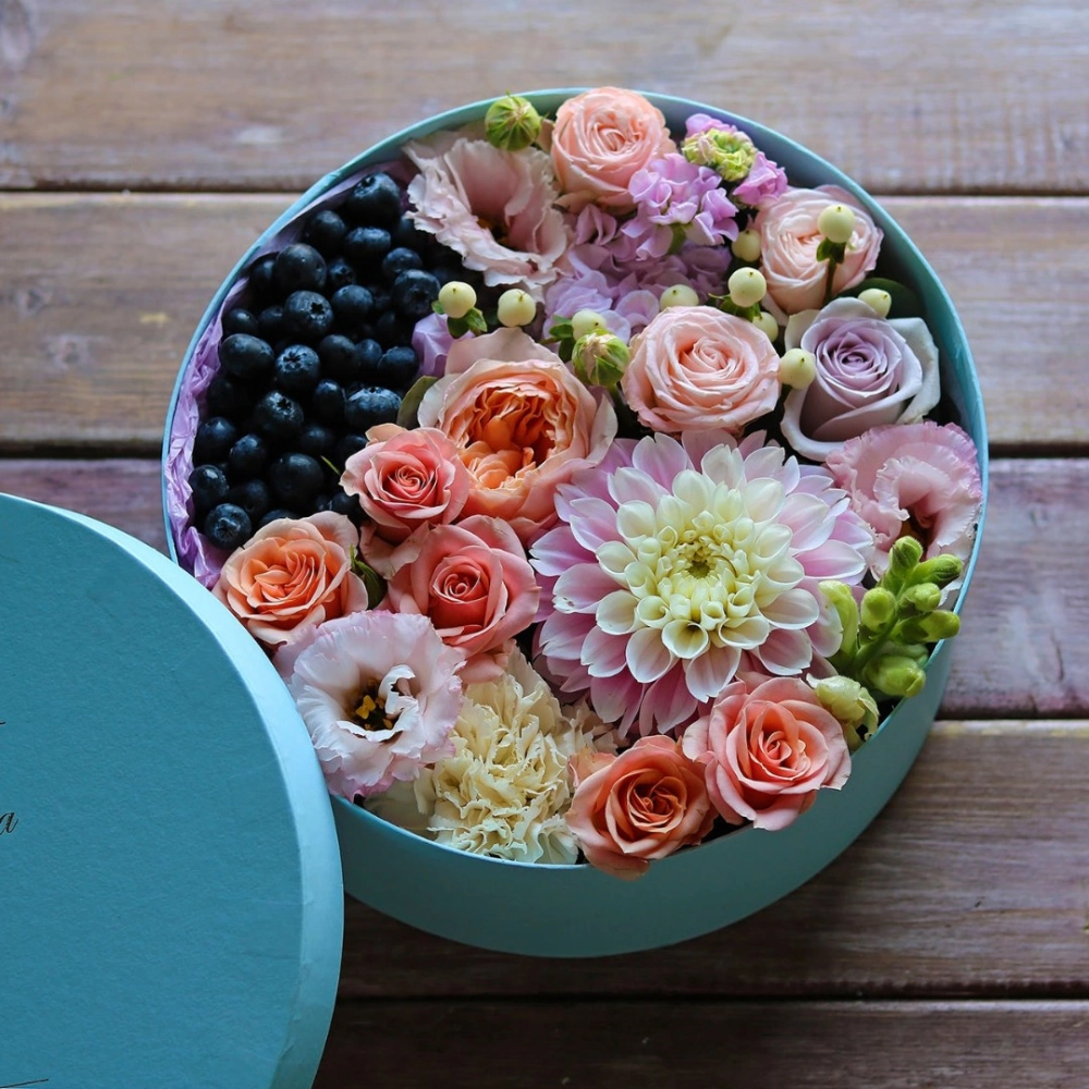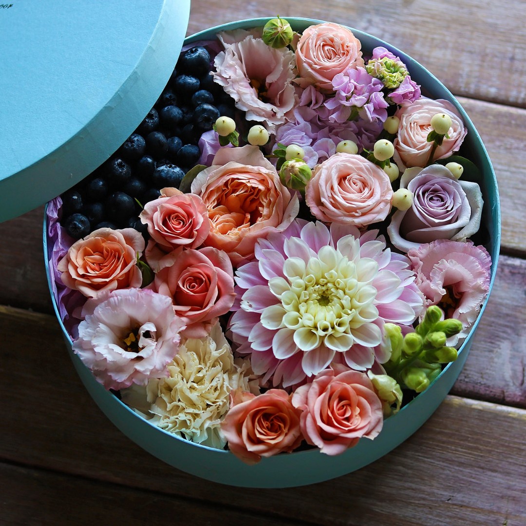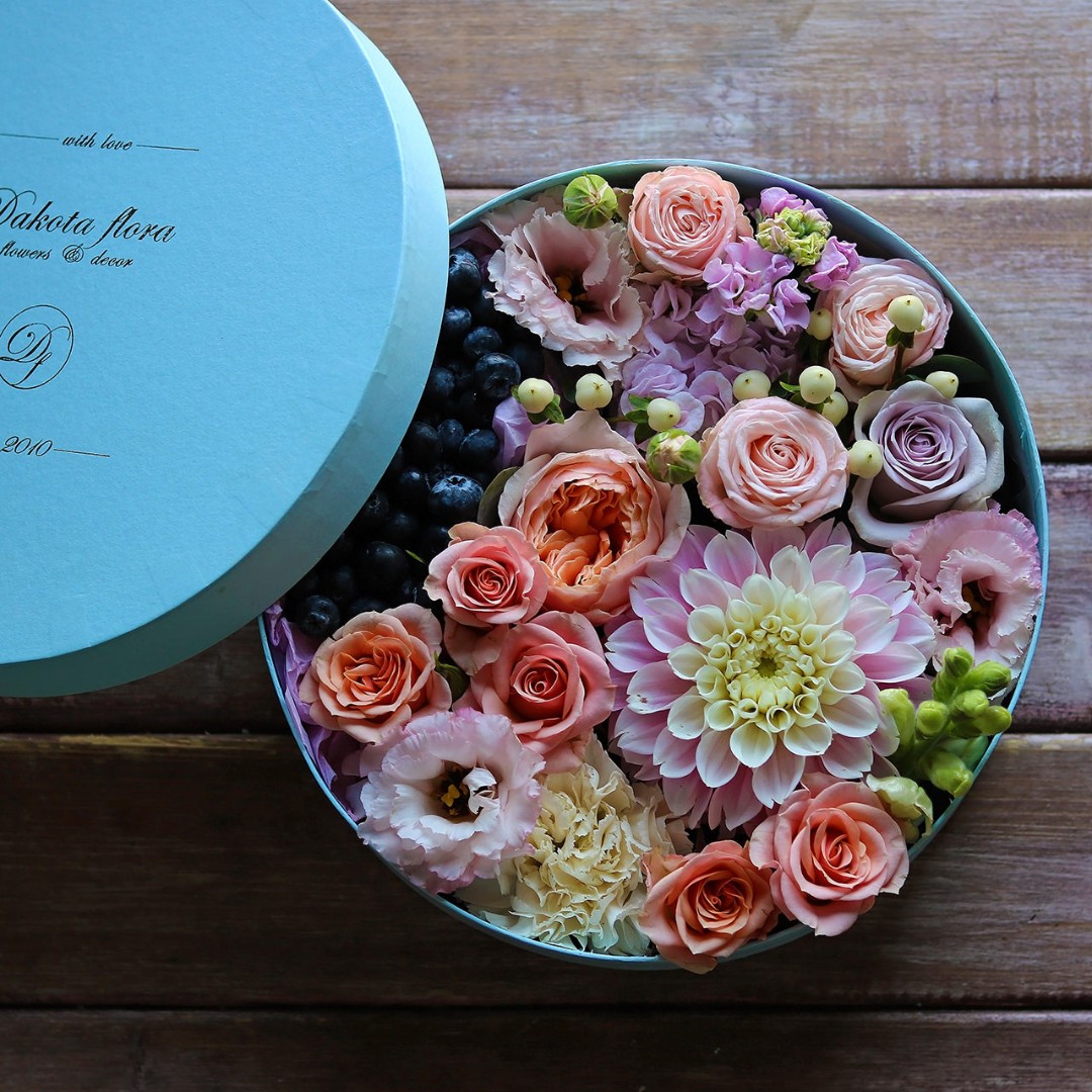 Авторские цветочные композиции в элегантных коробках различных форм, цветов, размеров, с добавлением сладостей в виде: баночки меда peroni, французских пирожных macarons, имбирных пряников и свежих ягод.