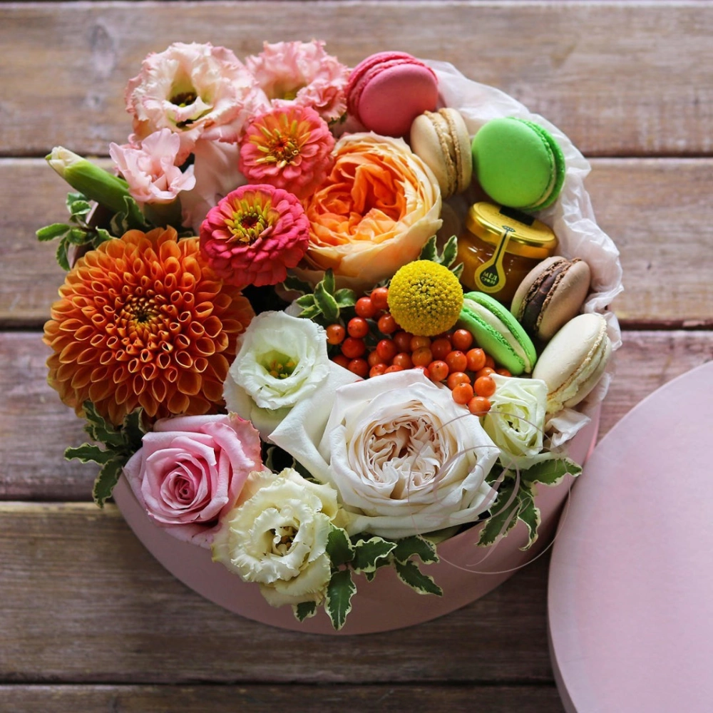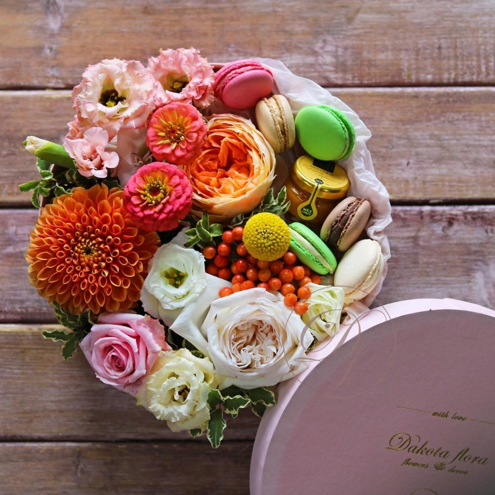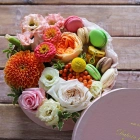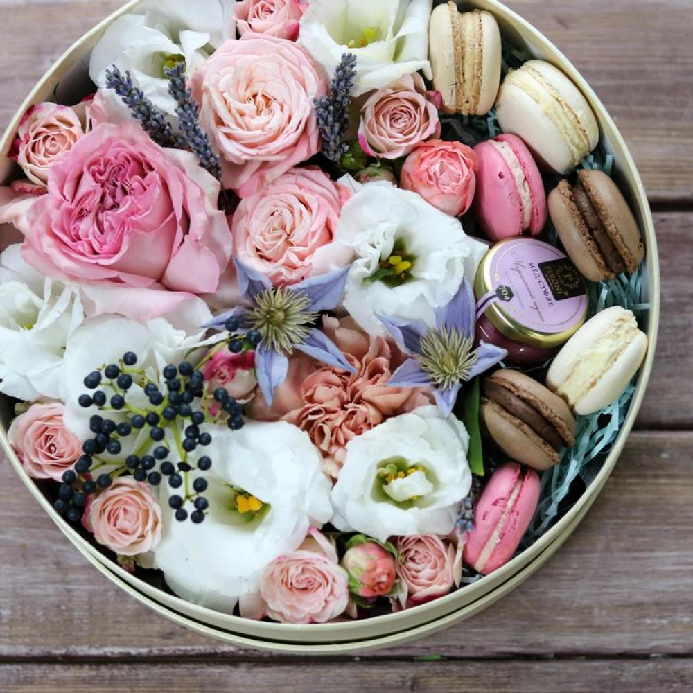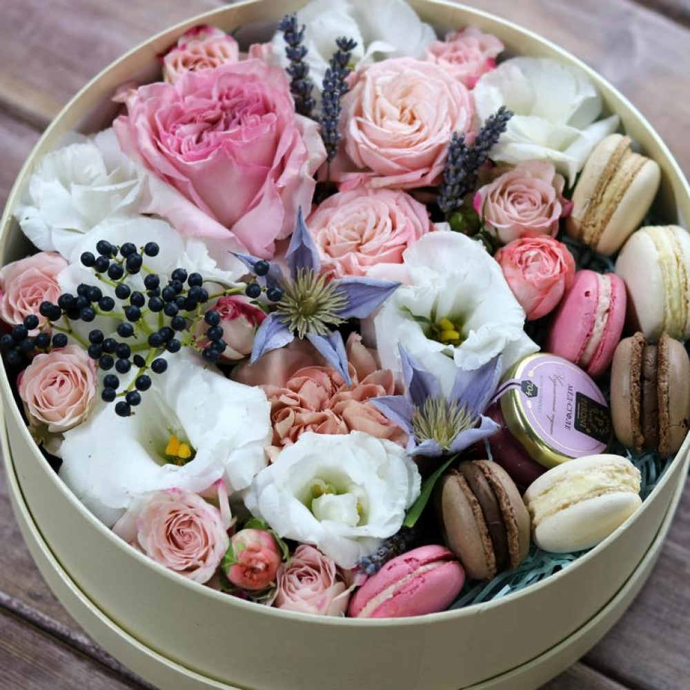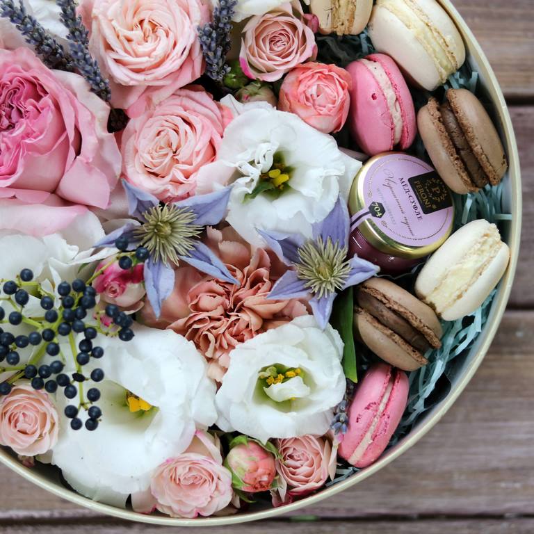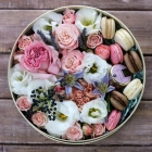 Авторские цветочные композиции в элегантных коробках различных форм, цветов, размеров, с добавлением сладостей в виде: французских пирожных macarons.