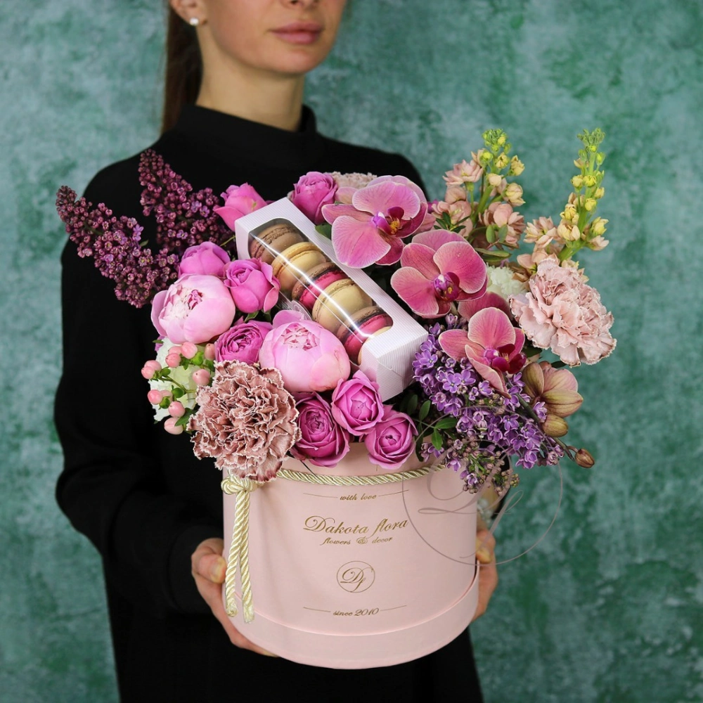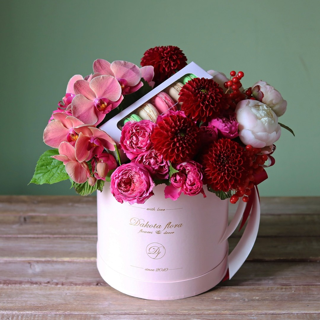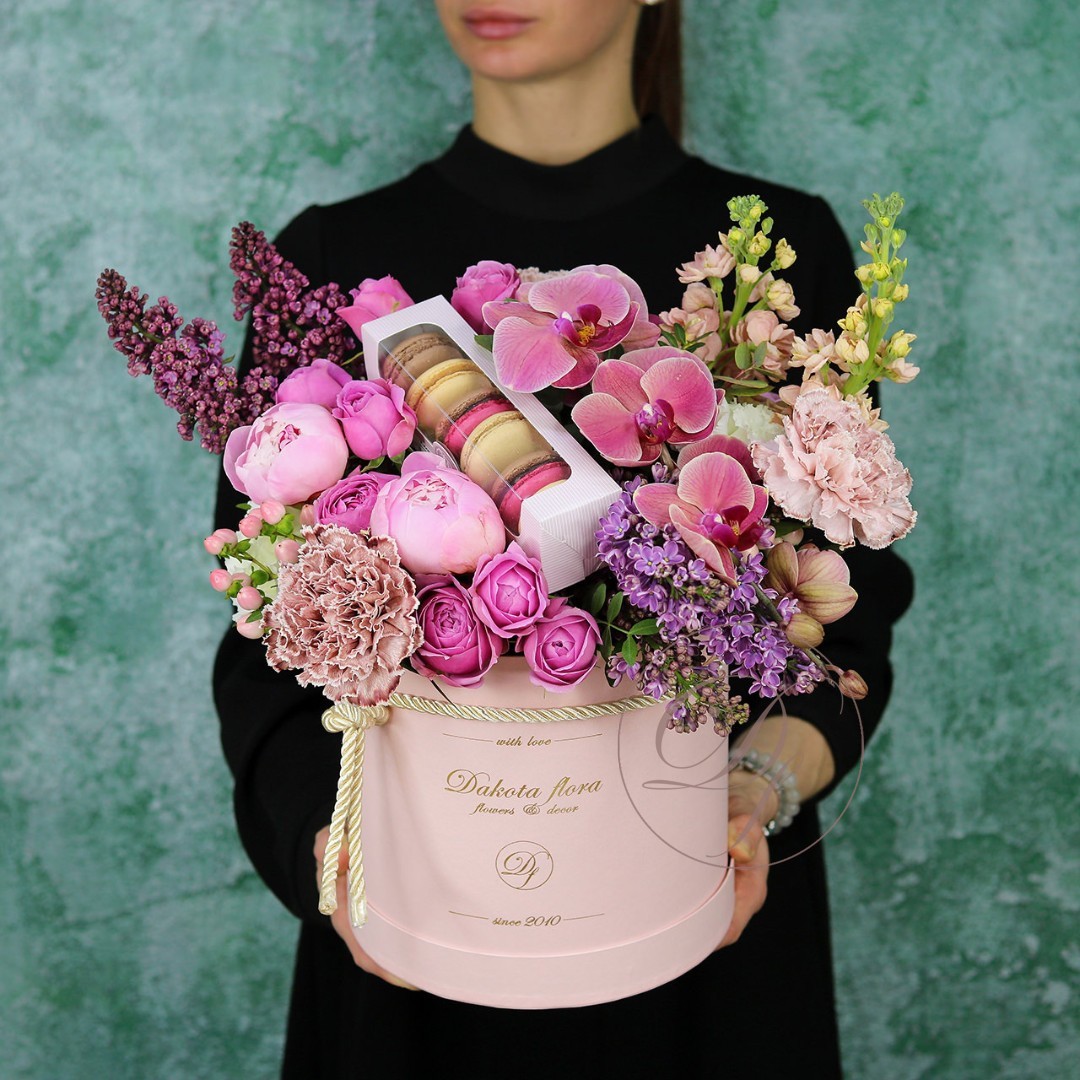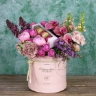 Авторские цветочные композиции в элегантных коробках различных форм, цветов, размеров, с добавлением сладостей в виде: баночки меда peroni, французских пирожных macarons, имбирных пряников и свежих ягод.