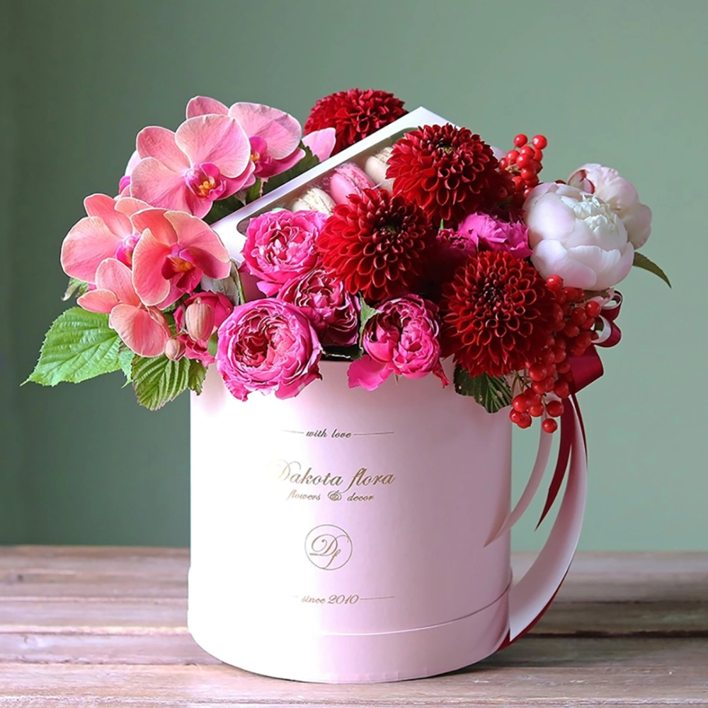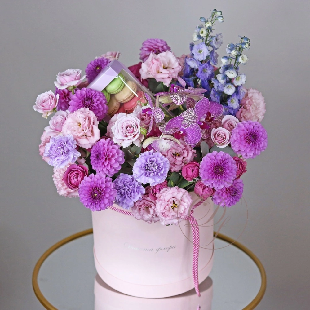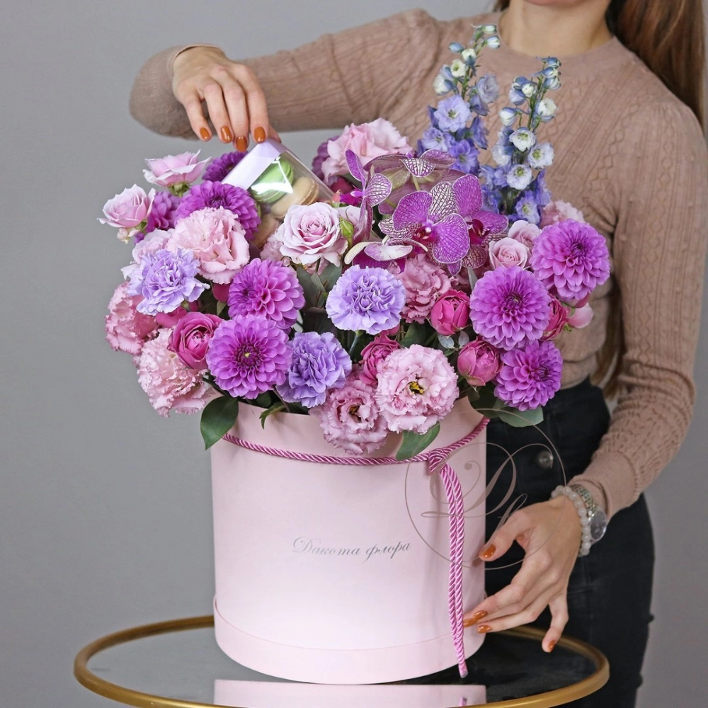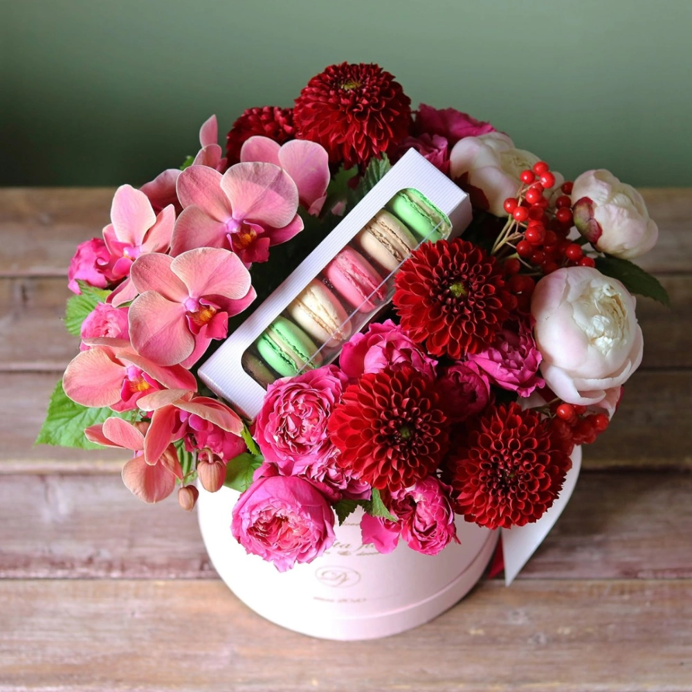 Авторские цветочные композиции в элегантных коробках различных форм, цветов, размеров, с добавлением сладостей в виде: баночки меда peroni, французских пирожных macarons, имбирных пряников и свежих ягод.