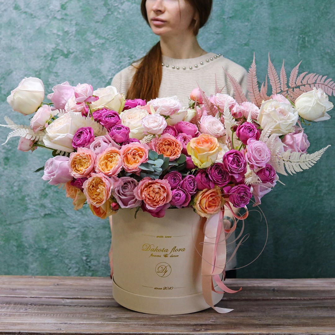 Цветы в коробках это композиции, составленные с использованием специальной губки Oasis (пиафлор) которая пропитана водой. Для того чтобы цветы дольше оставались свежими, добавляйте в нее немного воды каждый день.